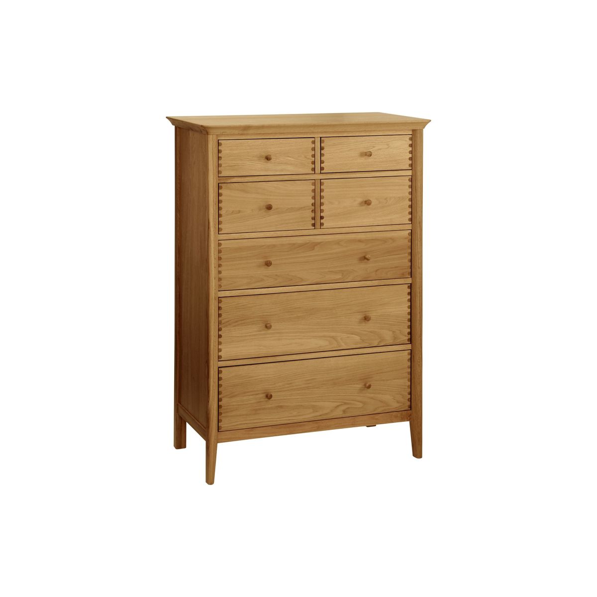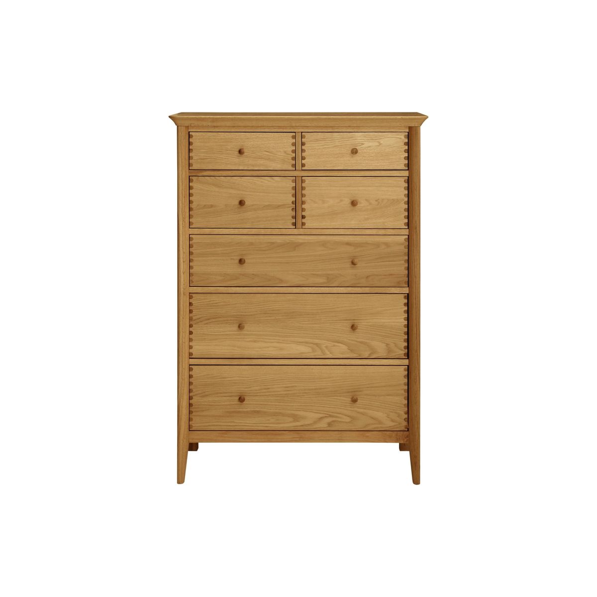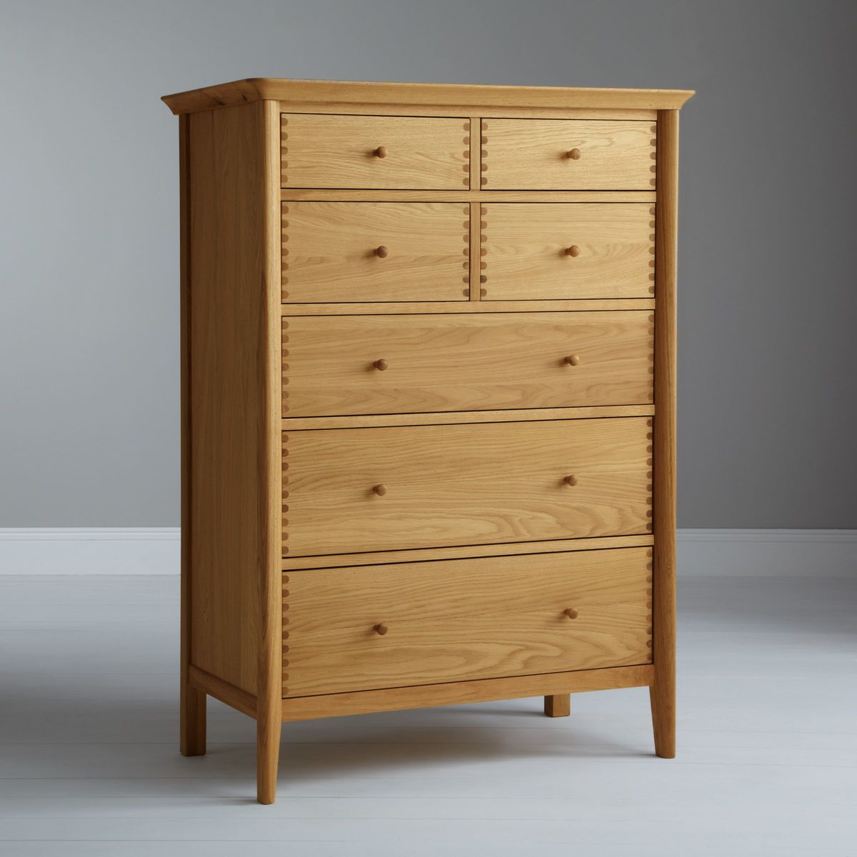This spacious chest of drawers is made from a sturdy combination of solid oak and veneers for an appealingly natural look. The White option has a more contemporary feel, thanks to its painted finish and Chinese birch and MDF construction. It's designed with seven drawers of differing depths, that glide open easily and provide ample storage space for clothing and accessories. Dovetail joints reinforce its high-quality and robust profile, that's enhanced with rounded corners and a smooth finish. Supplied fully assembled, its a timeless and functional storage option for your bedroom.