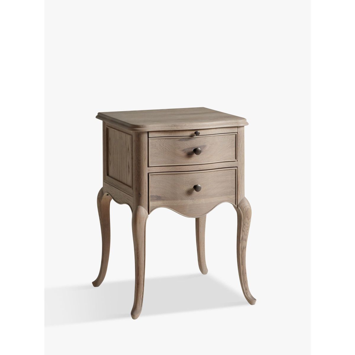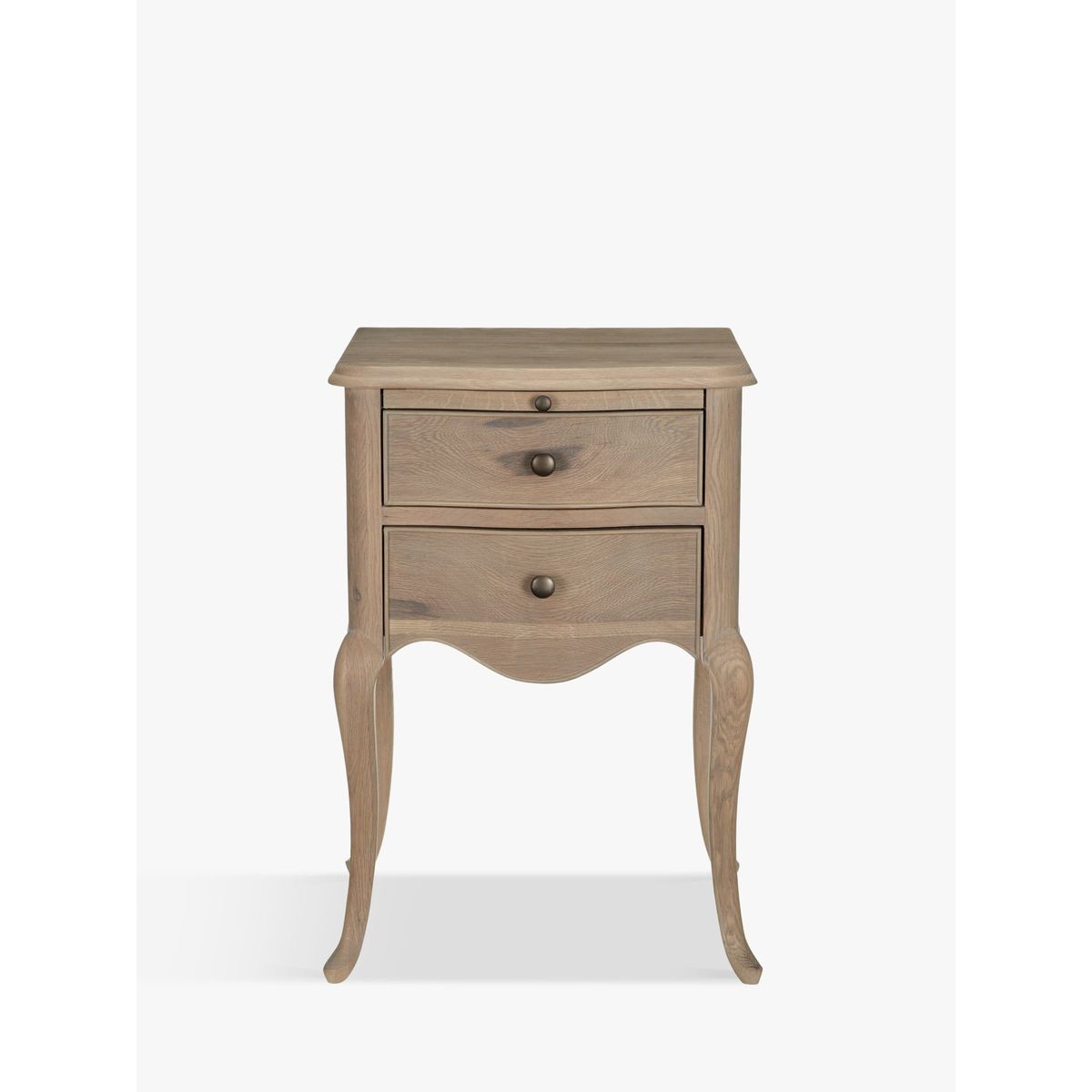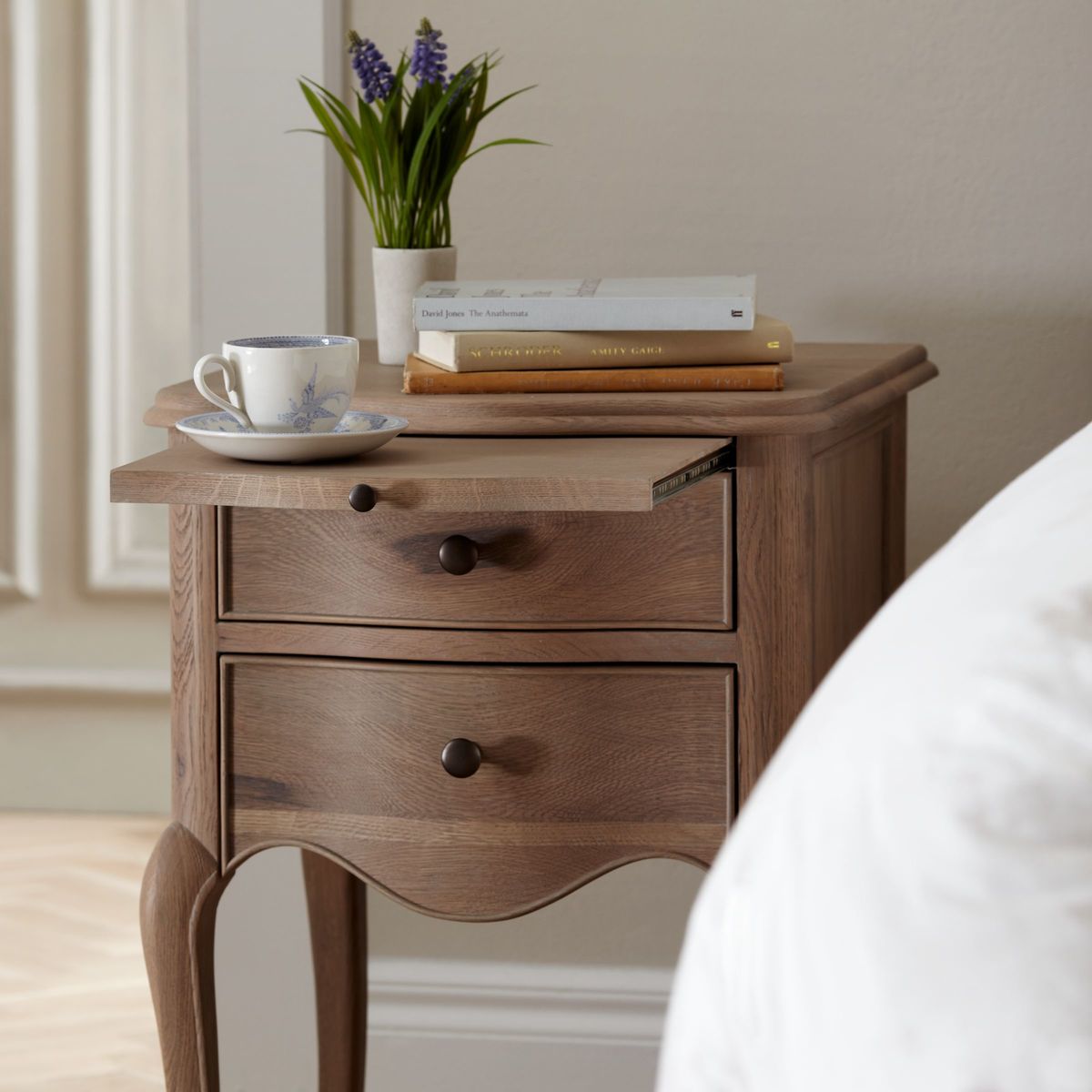 Keep your night-time necessaries close to hand while enhancing your bedroom decor with the pared-back styling of the Etienne bedside table. Inspired by the simple elegance of Gustavian styling, this elegant piece has a subtle hand-distressed finish, giving it an air of antique appeal. Sabre legs and a subtle yet bright appearance make this bedside table the perfect companion for the Gustavian Etienne bedstead. Two drawers provide added space within the table, and if your bedside table space is taken up with a lamp and books the pull-out tea tray just above the drawers will come in very handy. The beautiful Etienne collection is crafted from solid oak and oak veneers cultured in a rustic rich tone with an artistic weathered finish. This charming collection of bedroom pieces features handcrafted carvings and delicate profiles, illustrating superb design and craftsmanship. Want to see it first? You may want to see and get a feel for the product in one of our shops before ordering. We'll be able to tell you where the range you'd like to view is on display.