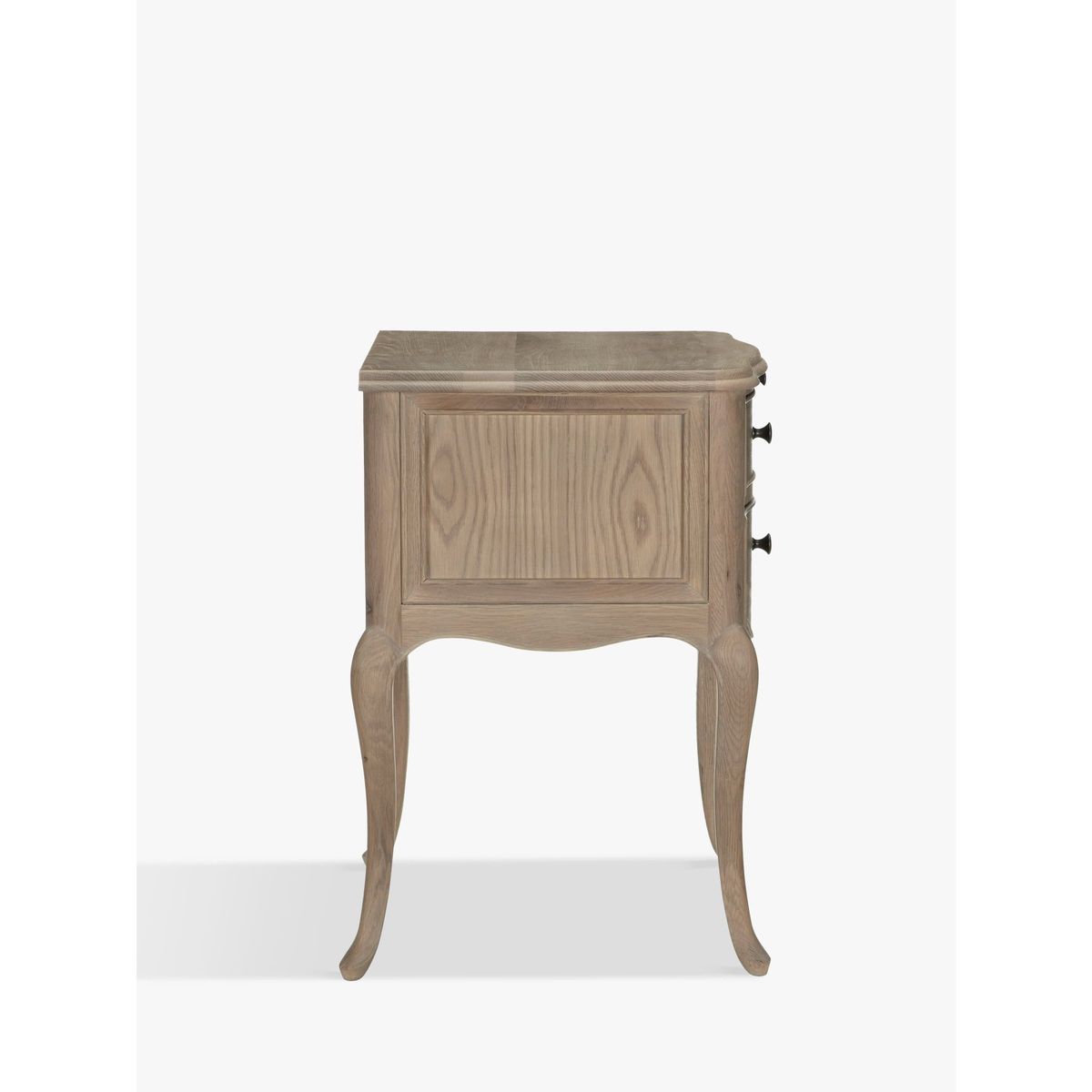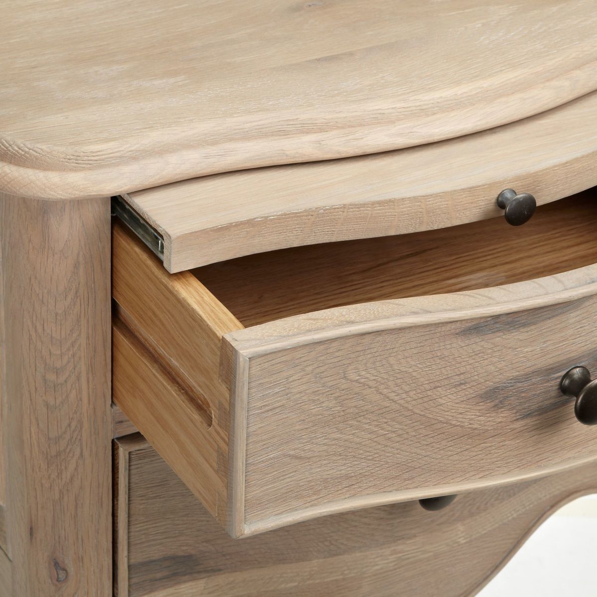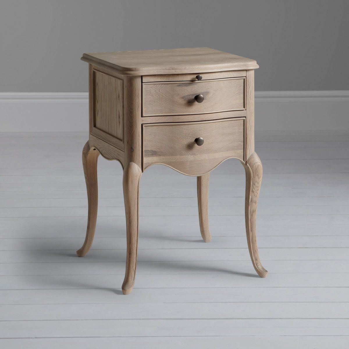 Keep your night-time necessaries close to hand while enhancing your bedroom decor with the pared-back styling of the Etienne bedside table. Inspired by the simple elegance of Gustavian styling, this elegant piece has a subtle hand-distressed finish, giving it an air of antique appeal. Sabre legs and a subtle yet bright appearance make this bedside table the perfect companion for the Gustavian Etienne bedstead. Two drawers provide added space within the table, and if your bedside table space is taken up with a lamp and books the pull-out tea tray just above the drawers will come in very handy. The beautiful Etienne collection is crafted from solid oak and oak veneers cultured in a rustic rich tone with an artistic weathered finish. This charming collection of bedroom pieces features handcrafted carvings and delicate profiles, illustrating superb design and craftsmanship. Want to see it first? You may want to see and get a feel for the product in one of our shops before ordering. We'll be able to tell you where the range you'd like to view is on display.