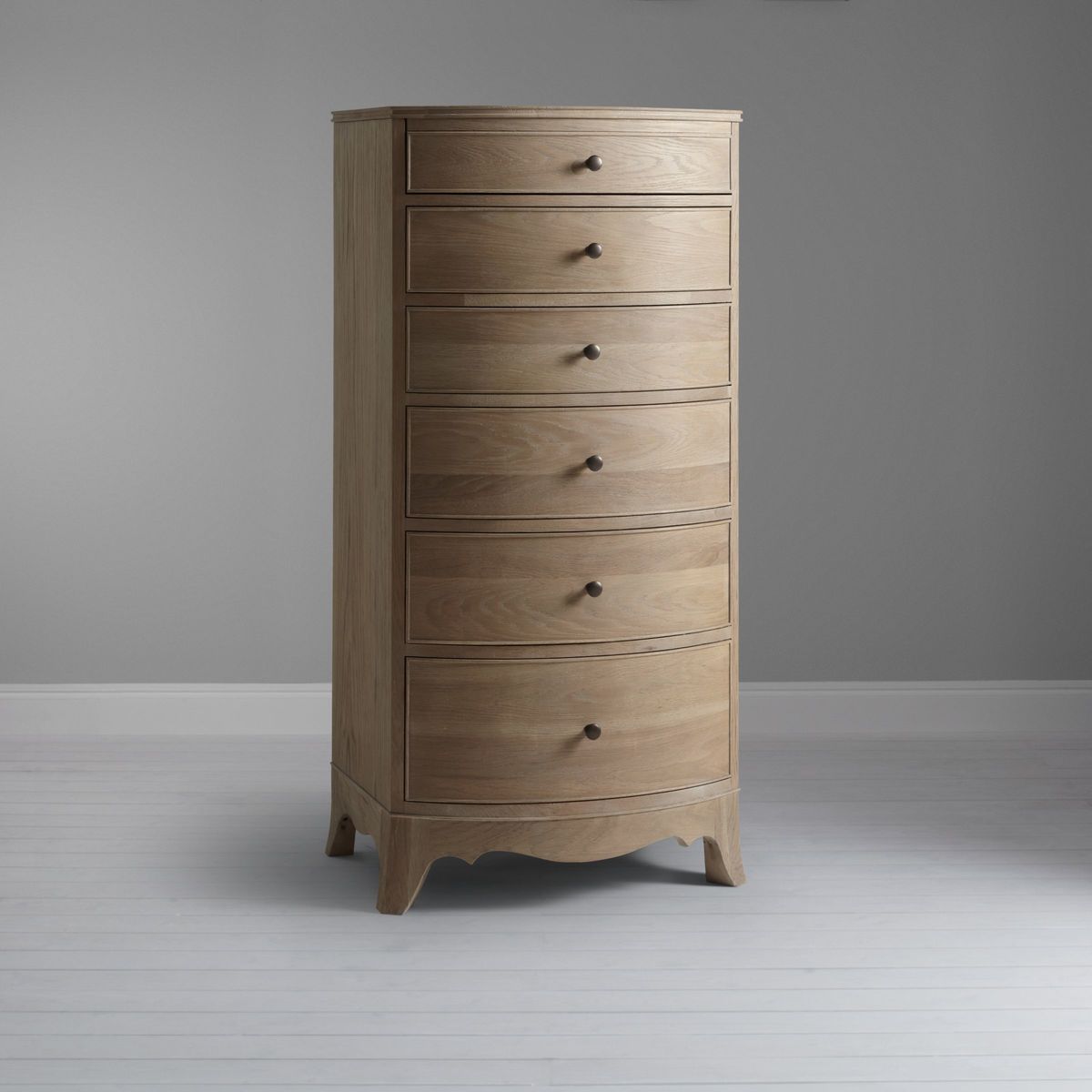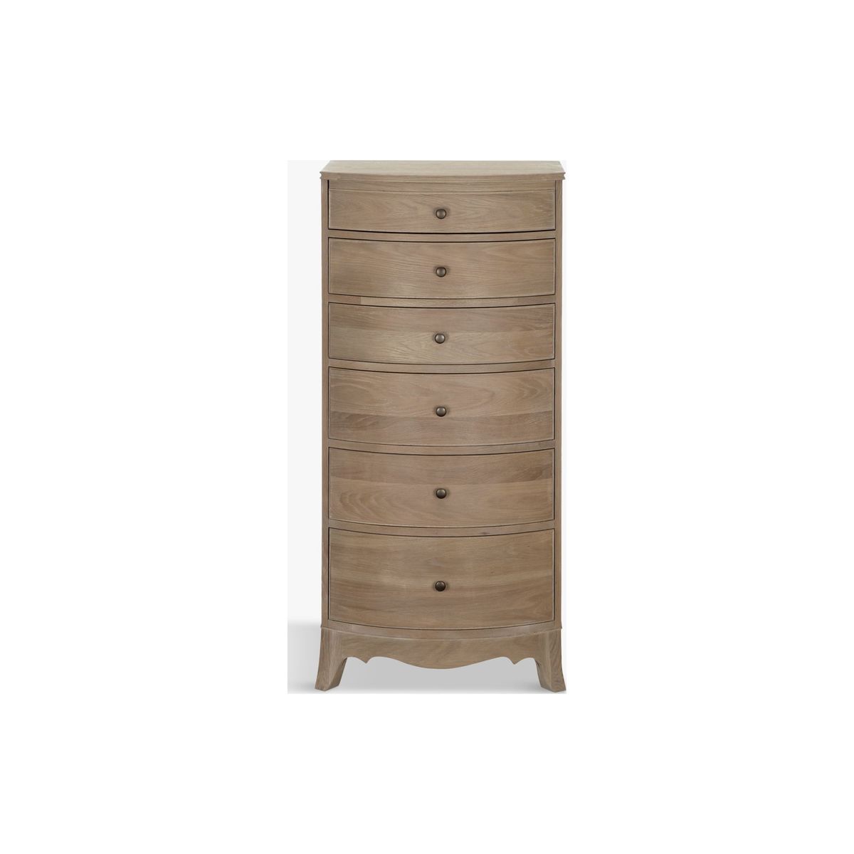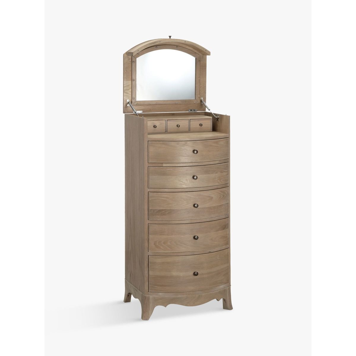 Designed in the English Georgian style, this tall Etienne chest of drawers features a chic square profile offset with subtle curves and a tapered leg. The bowed front displays five graduated drawers, with a discreet lift-up top that reveals a mirror and an additional three drawers. The beautiful Etienne bedroom collection is crafted from solid oak and oak veneers cultured in a rustic rich tone with an artistic weathered finish. This charming collection of bedroom pieces features handcrafted carvings and delicate profiles, illustrating superb design and craftsmanship. Height details: Height with mirror lifted: 176cm Height with mirror down: 128.5cm Please note: not all our ranges are on display in our shops.