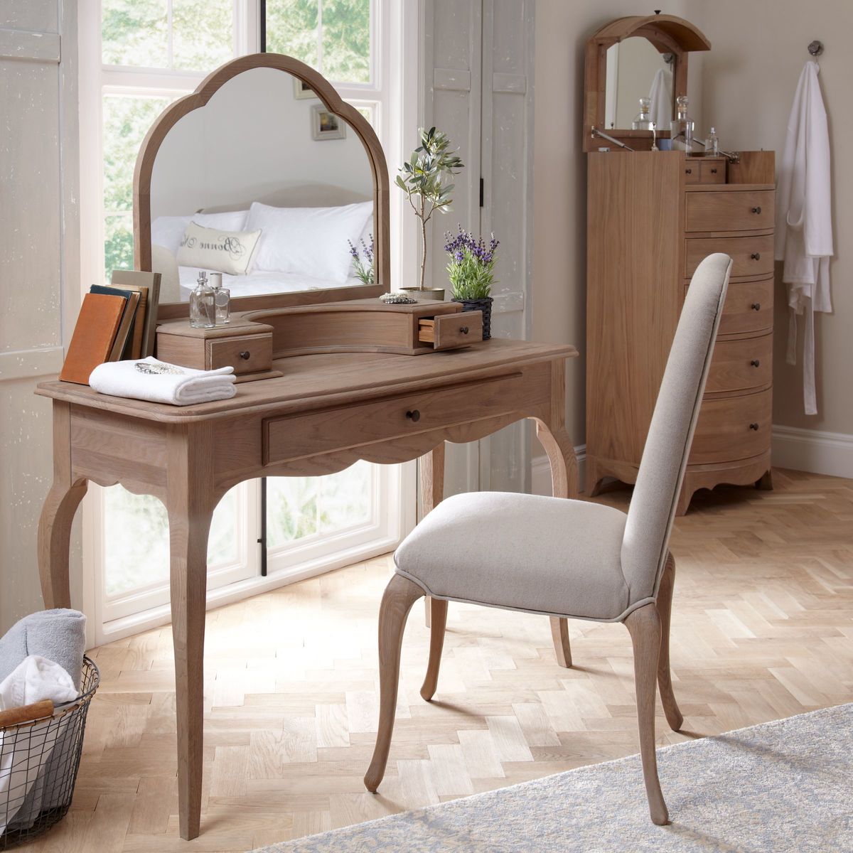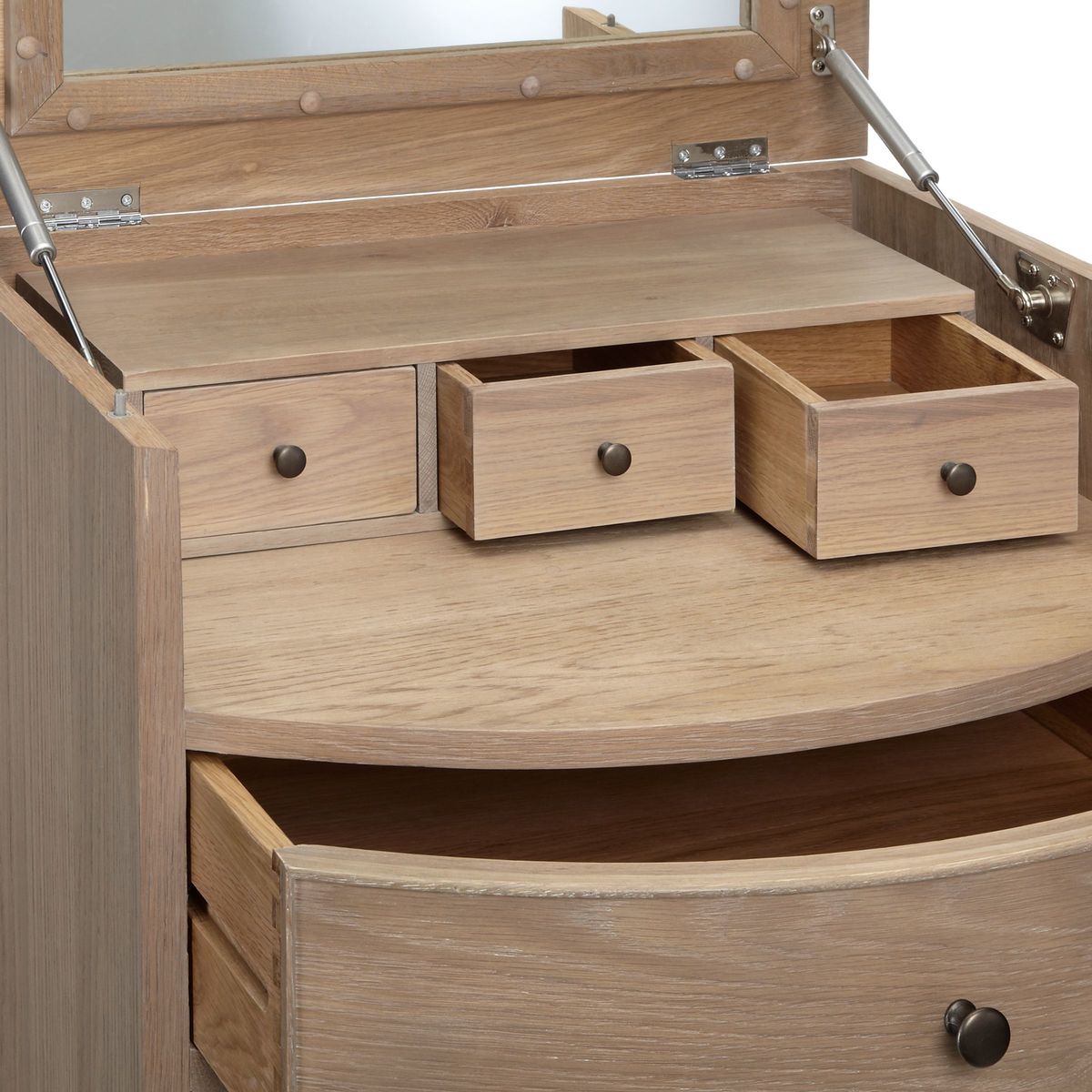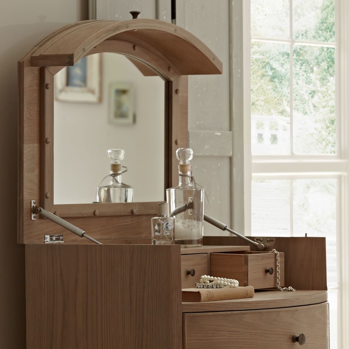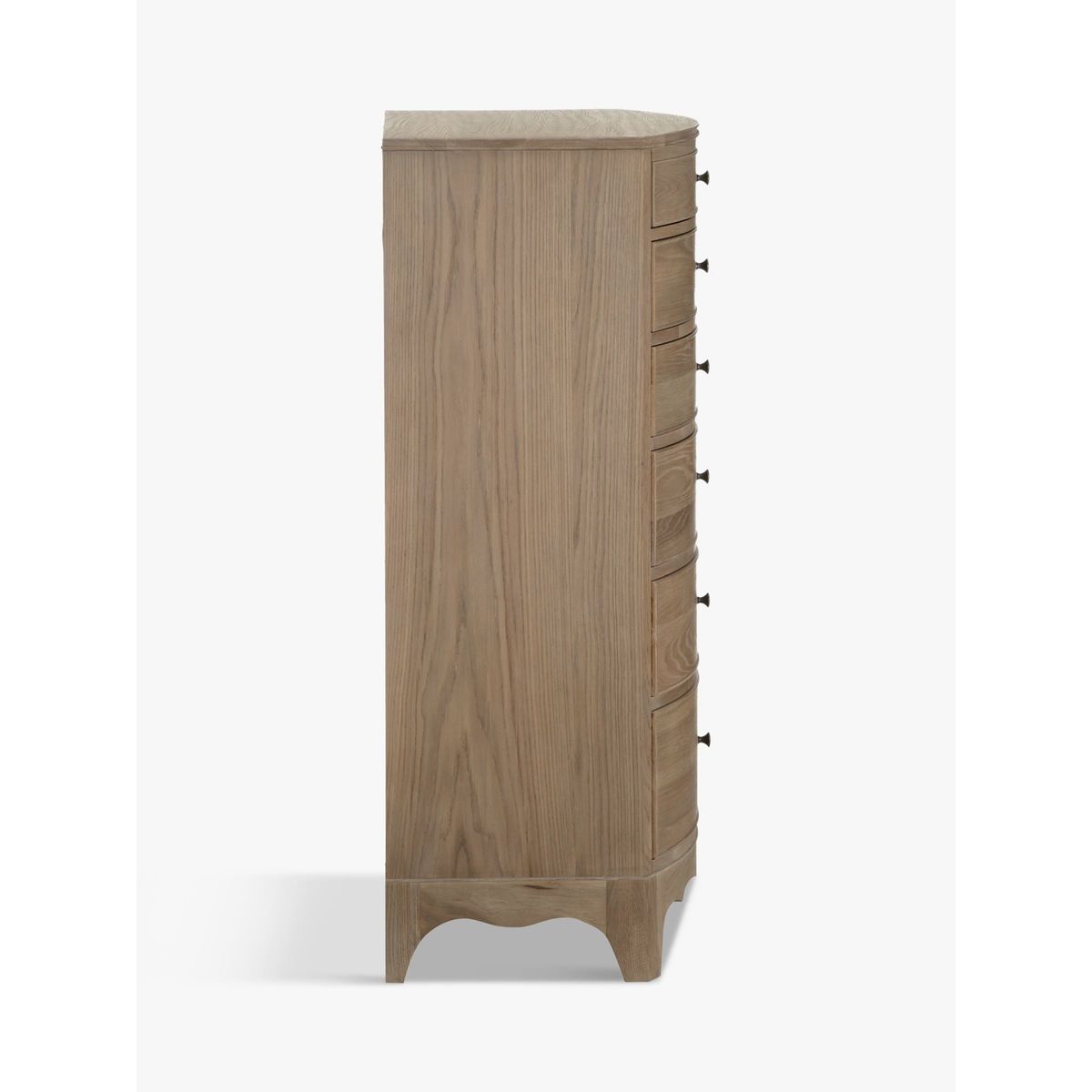 Designed in the English Georgian style, this tall Etienne chest of drawers features a chic square profile offset with subtle curves and a tapered leg. The bowed front displays five graduated drawers, with a discreet lift-up top that reveals a mirror and an additional three drawers. The beautiful Etienne bedroom collection is crafted from solid oak and oak veneers cultured in a rustic rich tone with an artistic weathered finish. This charming collection of bedroom pieces features handcrafted carvings and delicate profiles, illustrating superb design and craftsmanship. Height details: Height with mirror lifted: 176cm Height with mirror down: 128.5cm Please note: not all our ranges are on display in our shops.