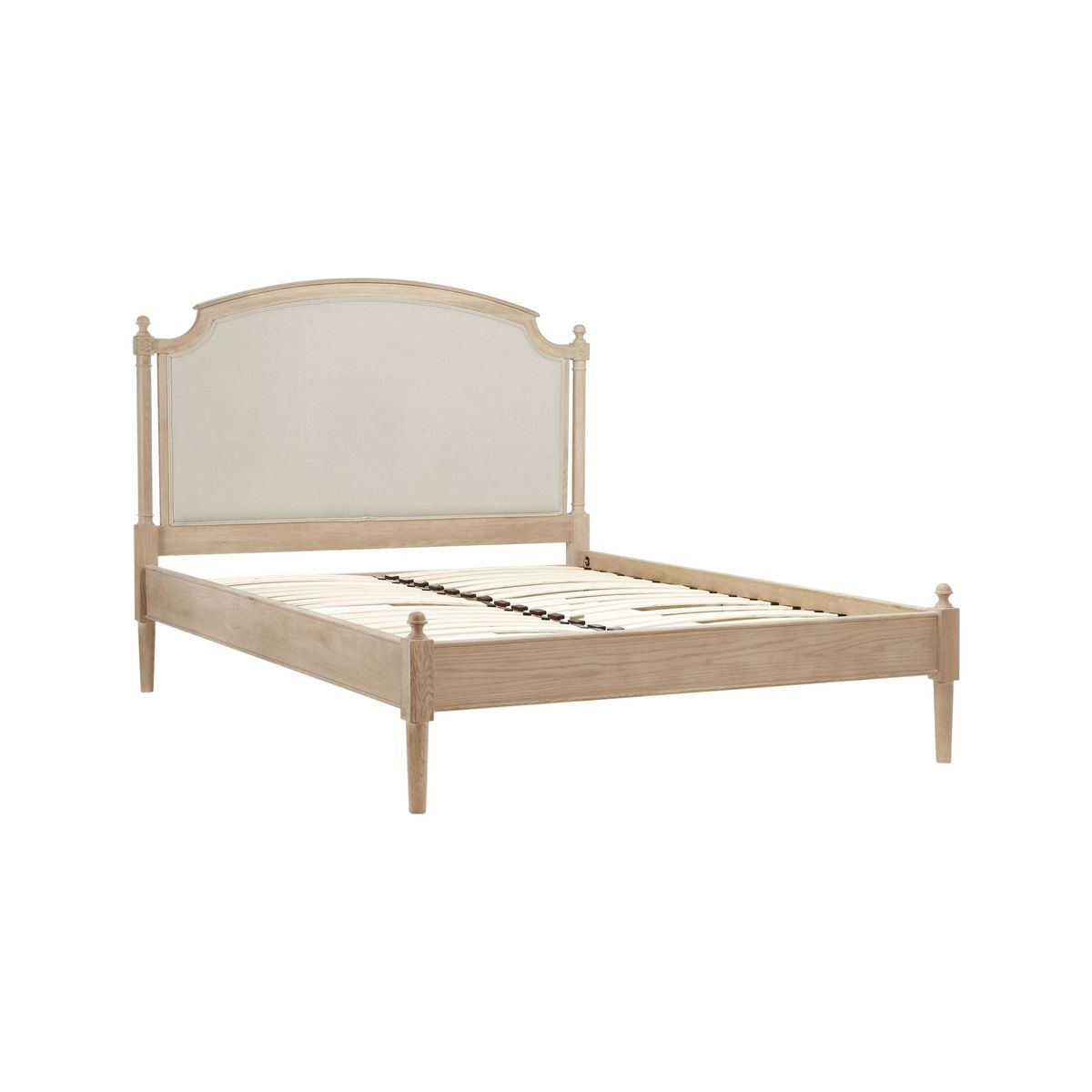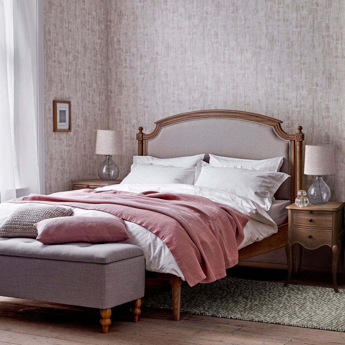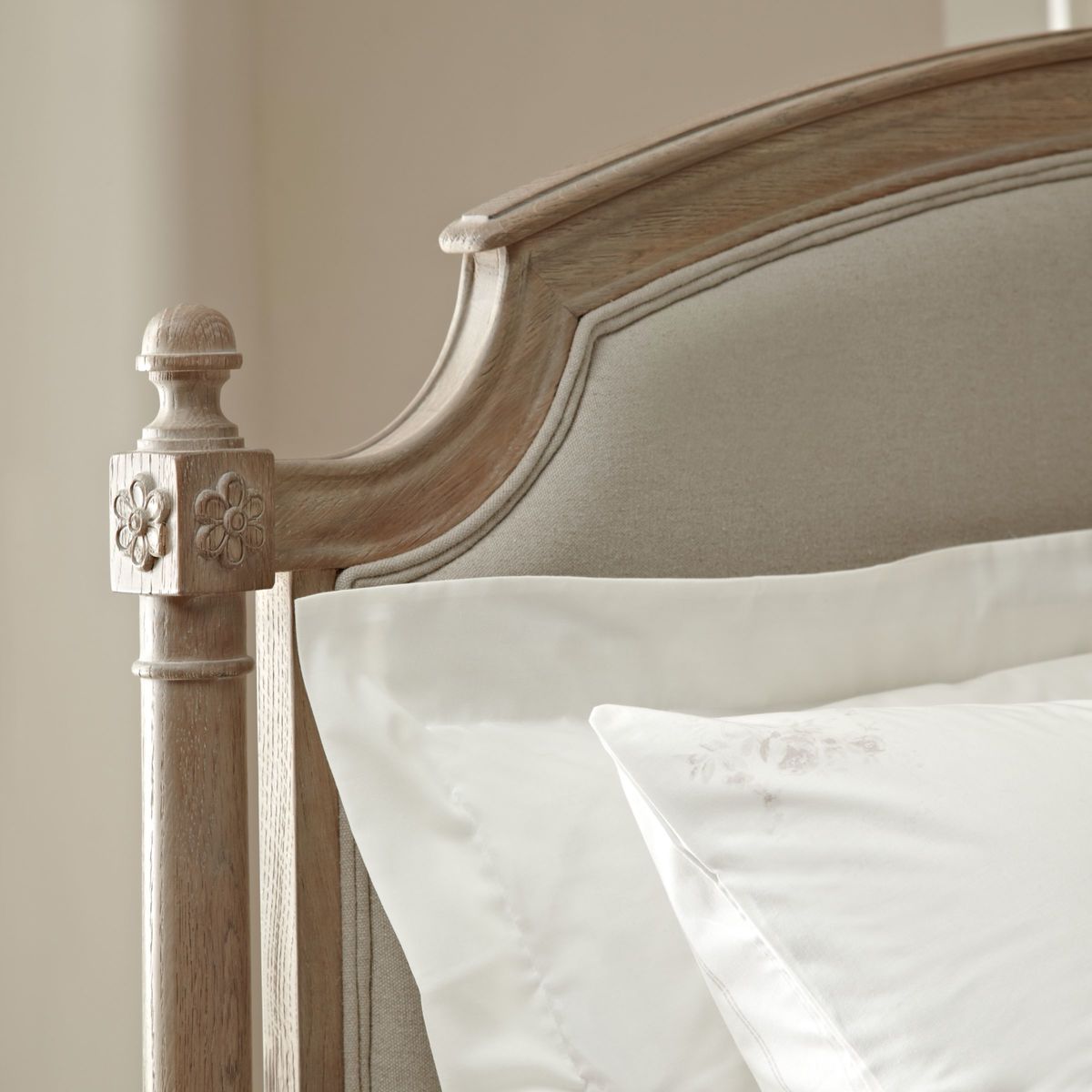 With a design inspired by ornate Louis XV era furnishings, this Etienne bedstead is upholstered in a neutral cotton and linen fabric that complements the aged finish of the outer wood frame. Hand-distressed wood gives this bed an air of antique appeal: the resulting appearance is full of character and charm, expressing individuality to enhance a variety of décors. The beautiful Etienne bedroom collection is crafted from solid oak and oak veneers cultured in a rustic rich tone with an artistic weathered finish. This charming collection of bedroom pieces features handcrafted carvings and delicate profiles, illustrating superb design and craftsmanship. Please note: not all our ranges are on display in our shops. Have you thought about a new mattress? Shop here.