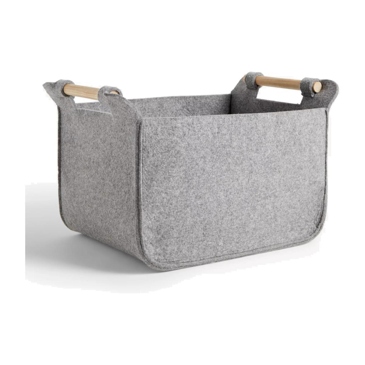 This felt basket provides relaxed and attractive open storage for living rooms and bedrooms. The handles are made from stained ash wood.