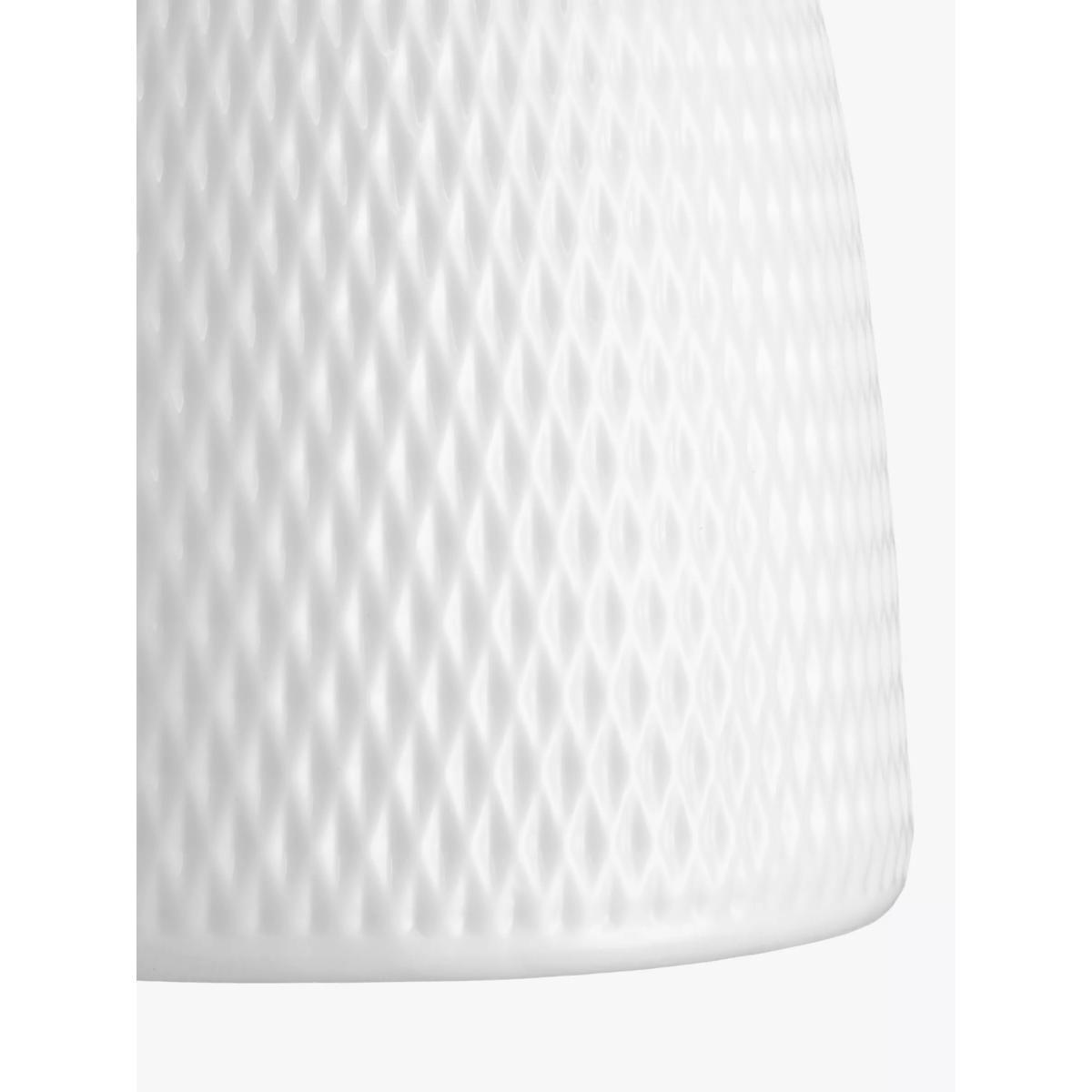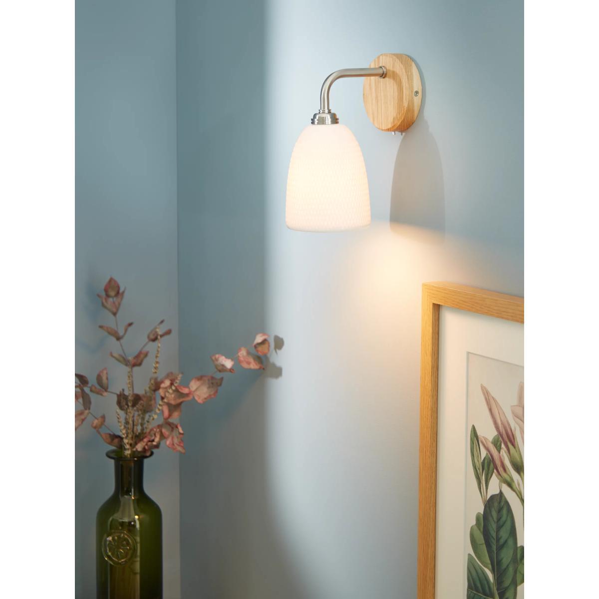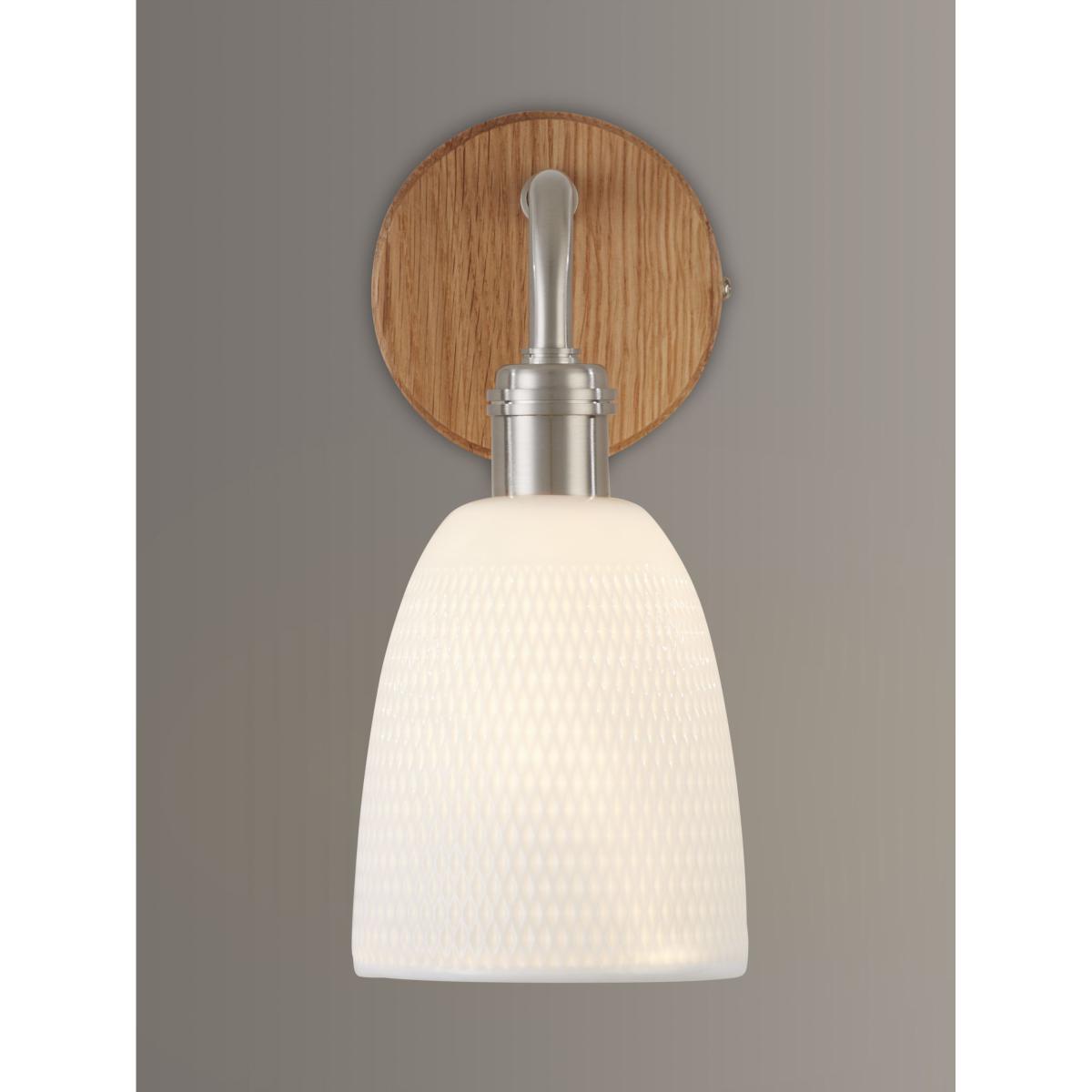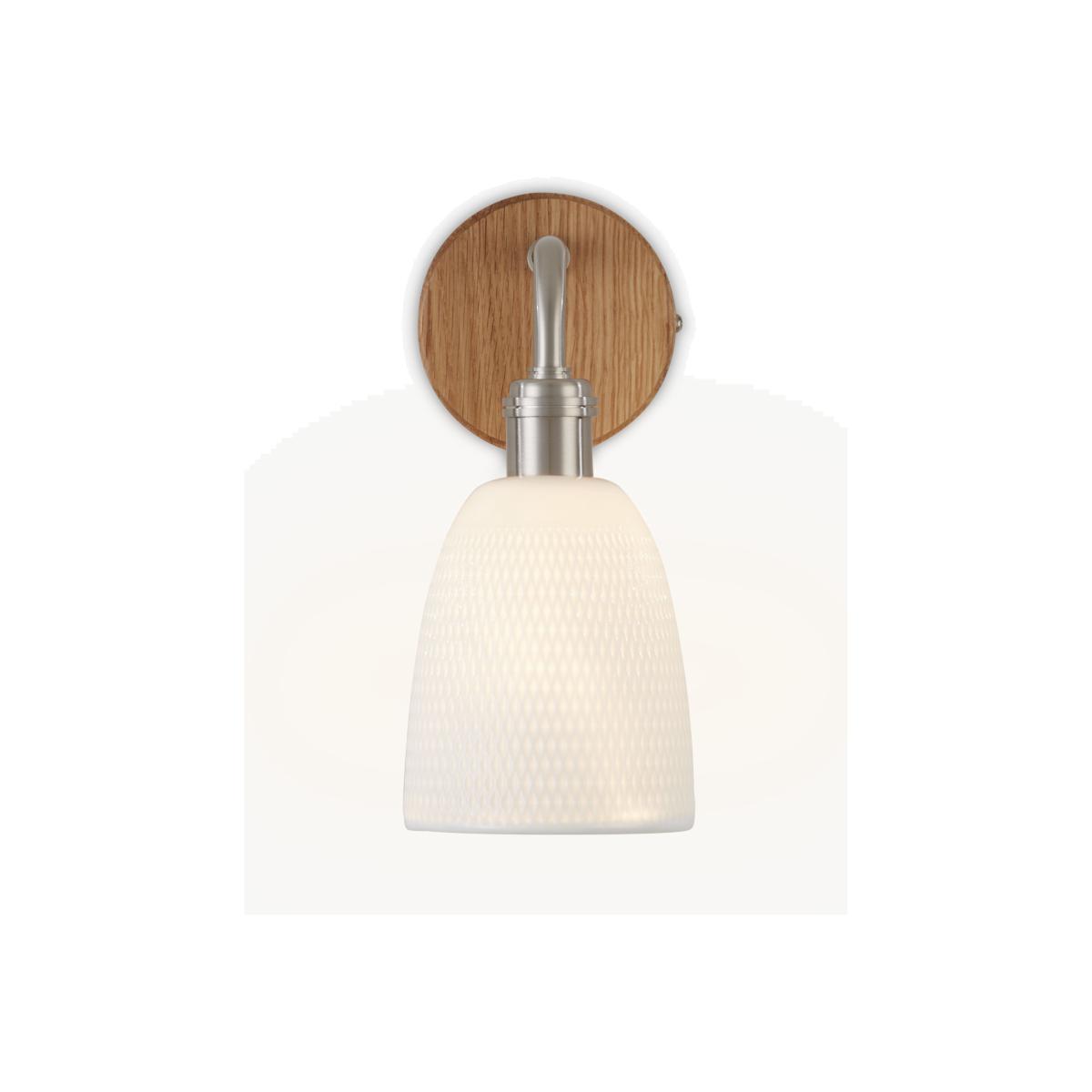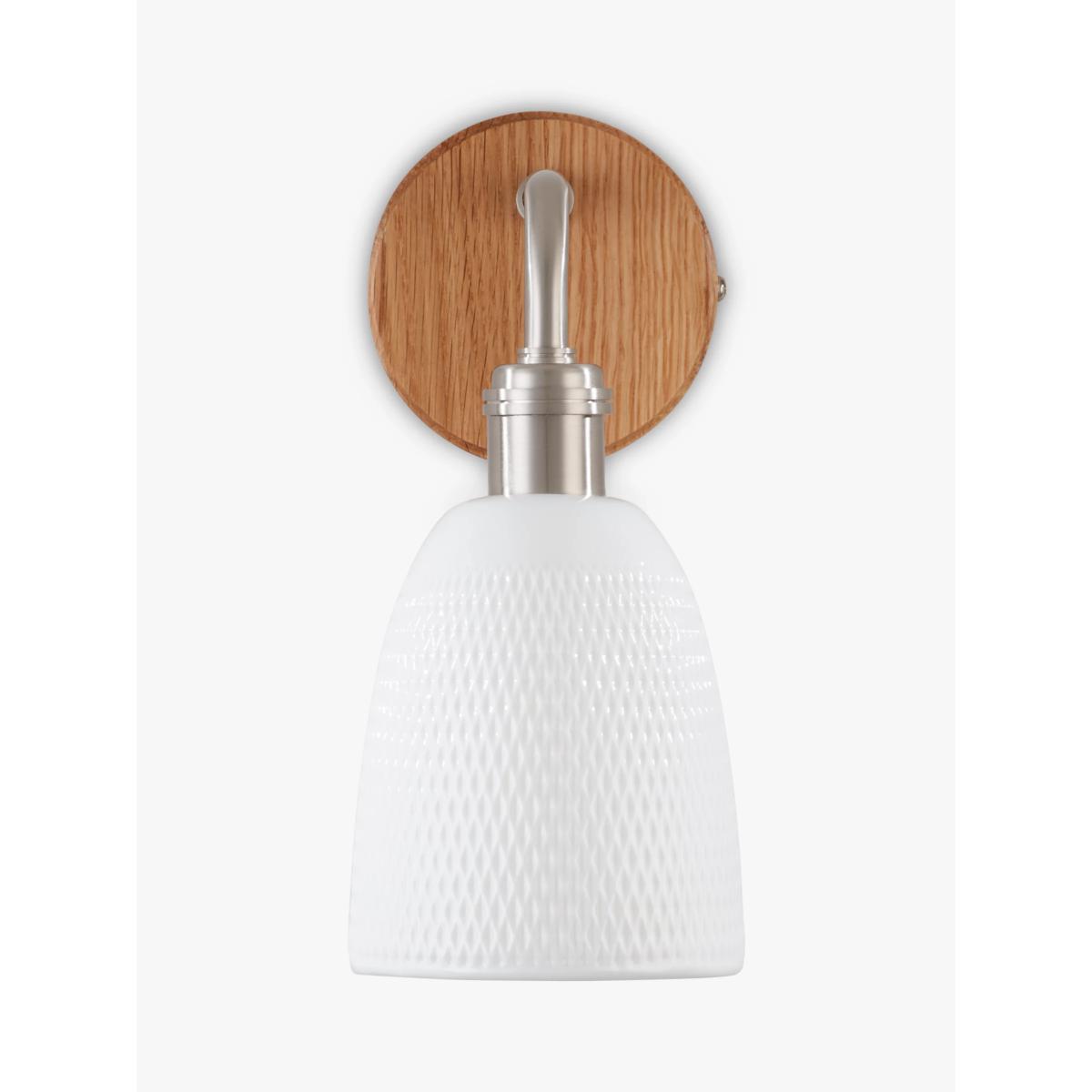The faceted pattern of the Fitcham shade looks especially pretty when lit as the light spills through the porcelain glaze. Fixed to a round natural oak plate with satin nickel detailing, it makes a tactile and modern addition to your wall space.