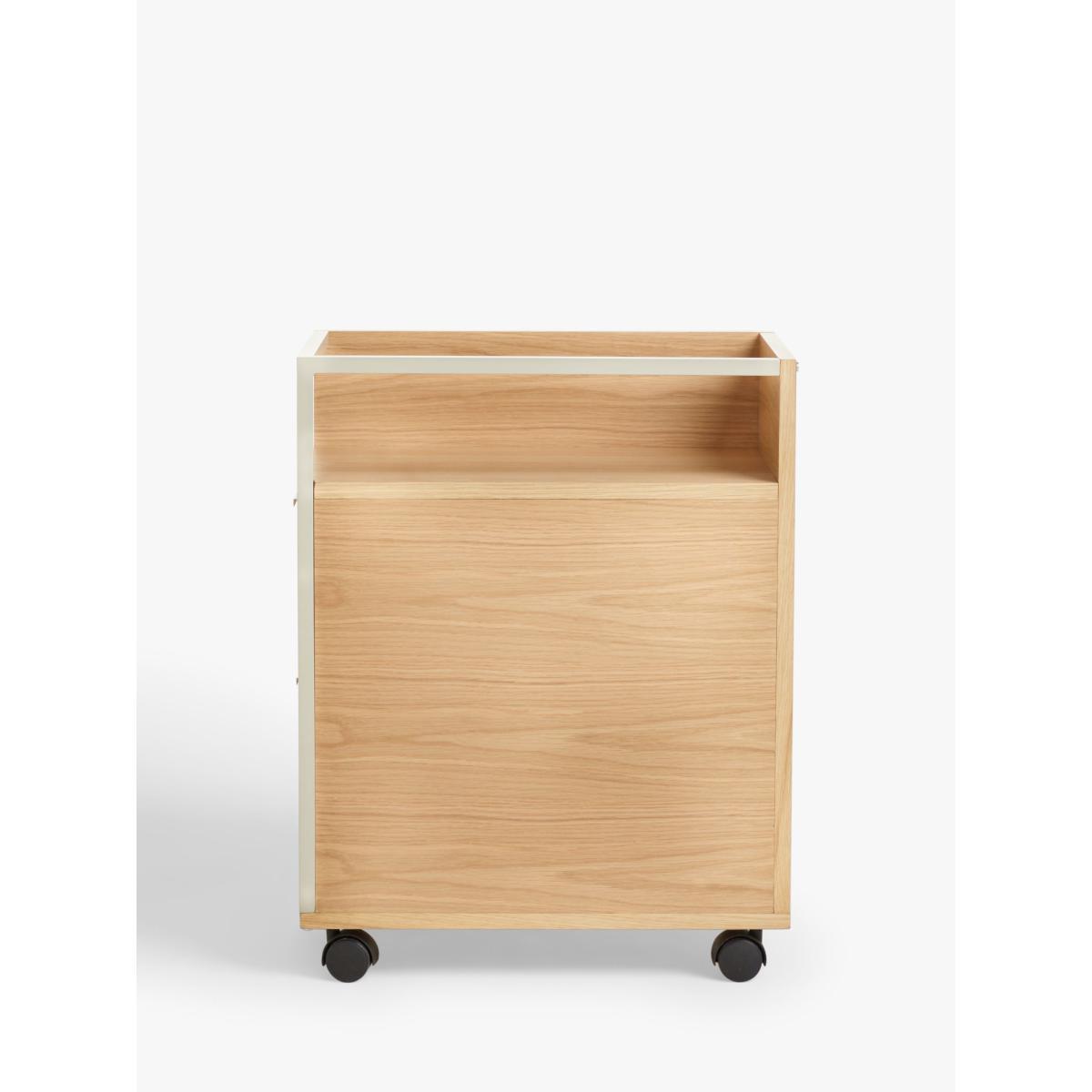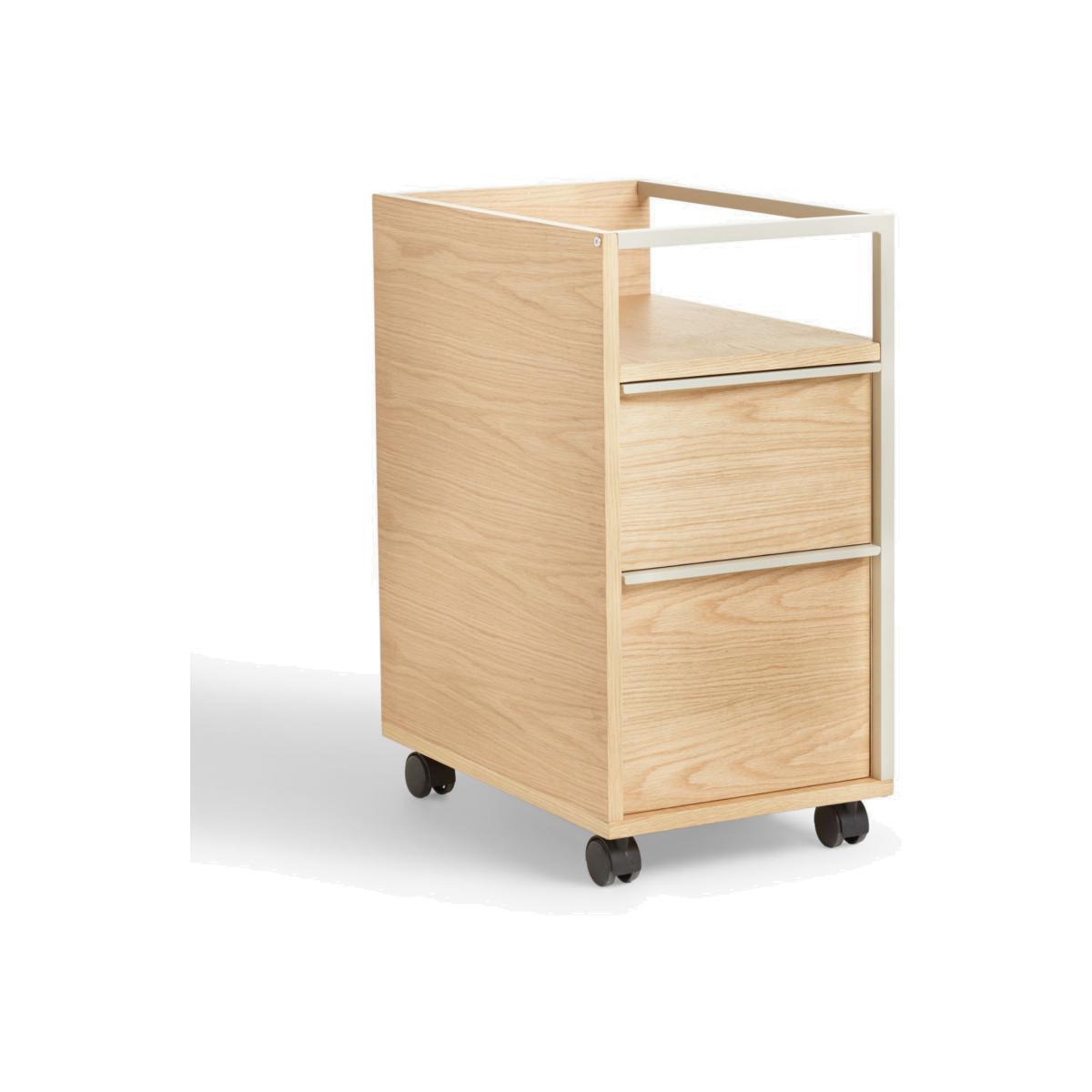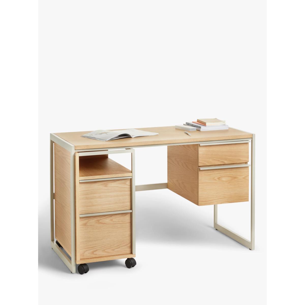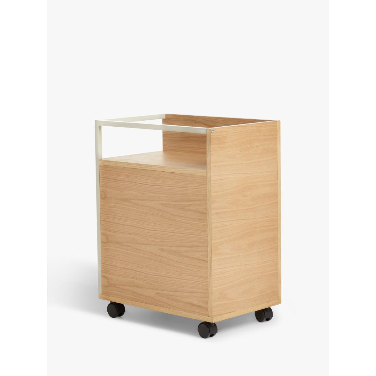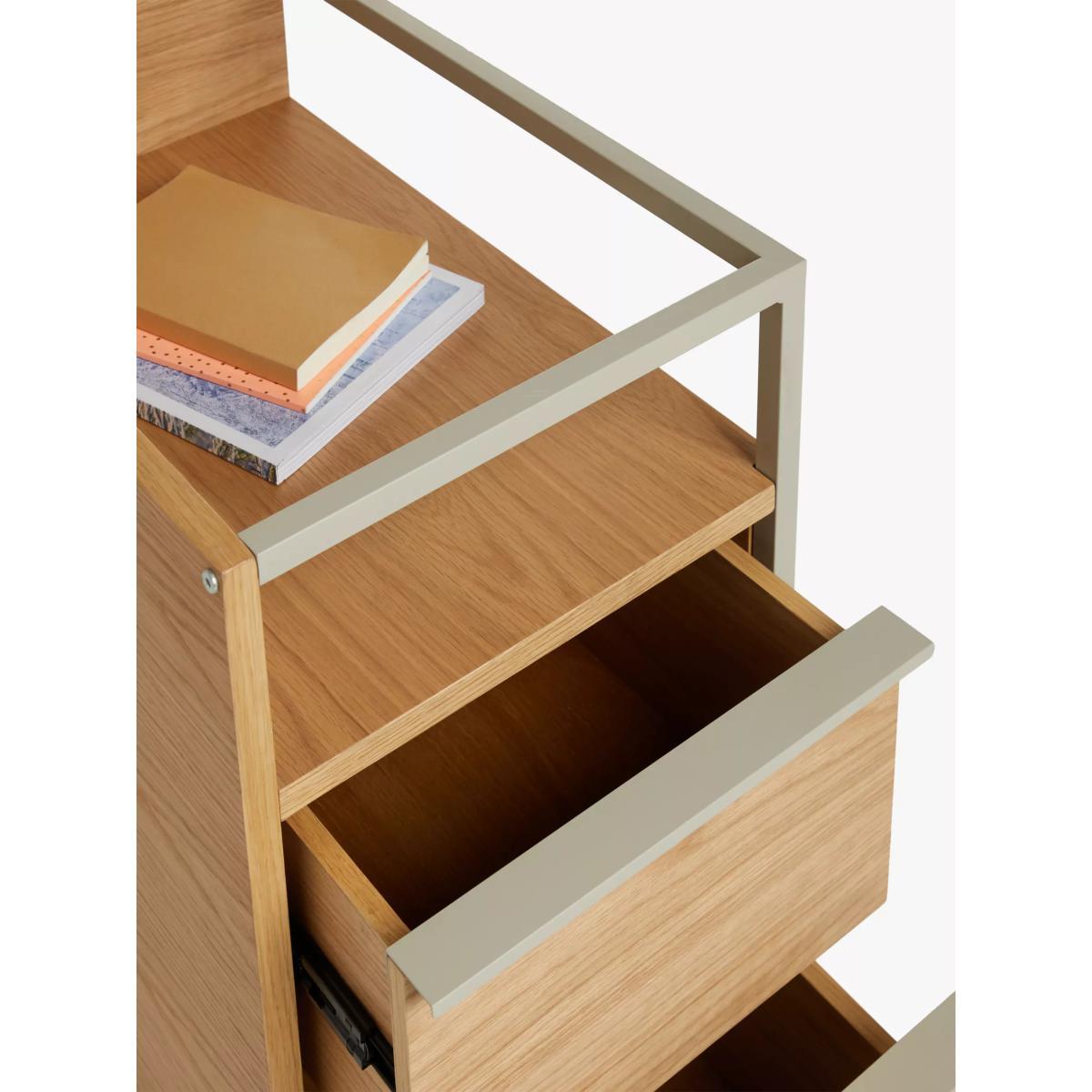 This practical filing cabinet has two spacious drawers and a top, open shelf section. It's made from high-quality oak veneer and MDF and supported by a sturdy metal frame. We like how its warm, natural finish will brighten up your home office and we've coated it in a lacquer for extra durability. Plus, castors on the base make it easy to move around your room. You can also position it under our coordinating desk from the same range. Want to see it first? You may want to see and get a feel for the furniture in one of our shops before ordering. We'll be able to tell you where the range you'd like to view is on display.