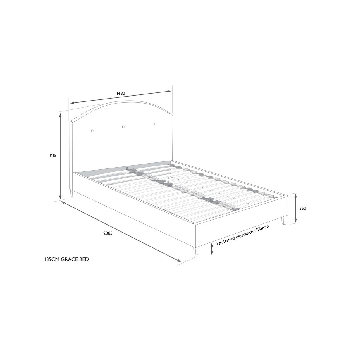The Grace bed frame has an understated sophistication to its design, thanks to button detailing on its curved headboard. Featuring sprung slats that offer additional support for you and your mattress, it's supported by robust wooden legs for a durable finish. Built with Smart Slats This bed frame is designed with wider slats at the shoulders, lumbar and feet. They provide maximum support for you and your mattress so that you experience perfect spinal alignment while you sleep. The standard slat caps are black so we have added grey slat caps to ensure that you know where to place the wider slats. Our Band A fabric, Saga is woven with man-made fibres, making it exceptionally durable and versatile. Our Band A fabric, Topaz is woven to offer a linen-effect feel, and is available in a versatile palette of colours. Our Band B fabric, Erin is woven with man-made fibres to create a beautifully soft yarn. This tactile, velvet-style chenille fabric exhibits a two-tone look in different lights. Our Band B fabric, Opulence offers a luxurious, soft-touch. This velvet-feel fabric is available in a rich colour palette. Our Band B fabric, Mole is a woven wool-blend that's soft and cosy. Piling and bobbling may occur naturally over time. Our Band B fabric, Relaxed Linen is durable, resilient and versatile, woven from man-made and natural fibres Want to see it first? You may want to see and get a feel for the furniture before ordering. Pop into one of our shops to see the full range of colours and fabrics on offer. We'll be able to tell you where the range you'd like to view is on display.