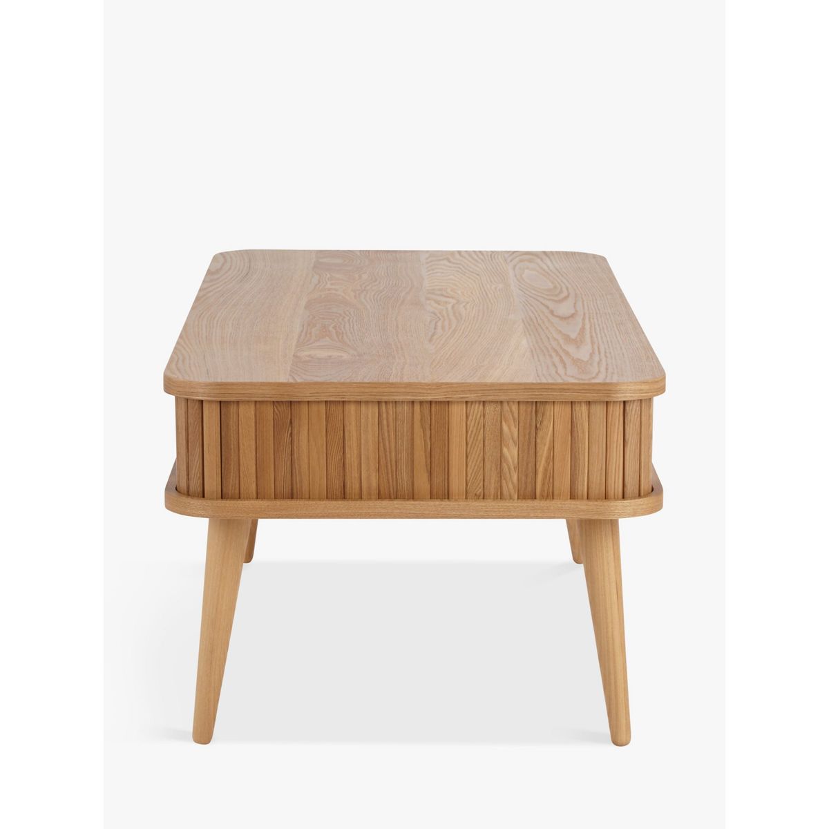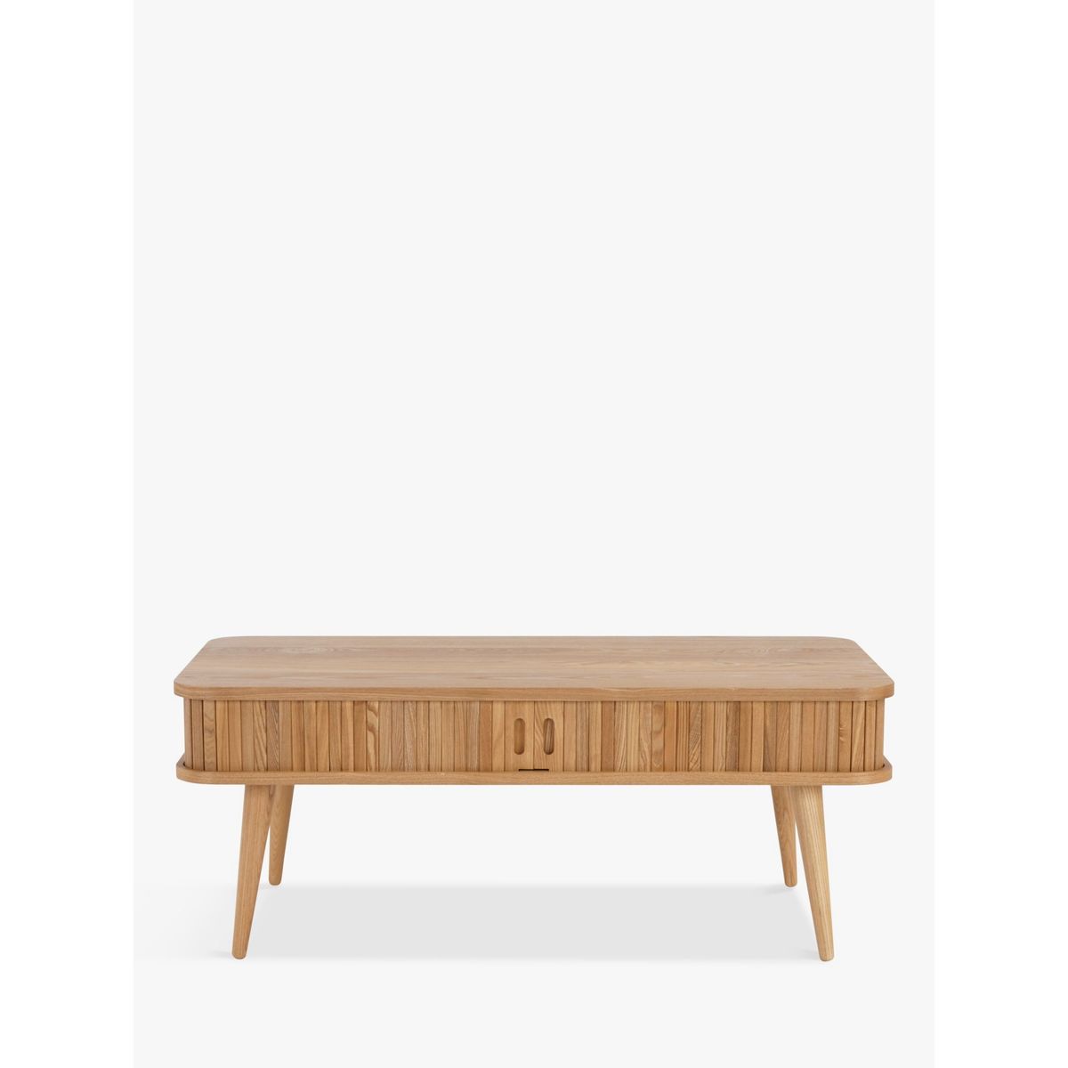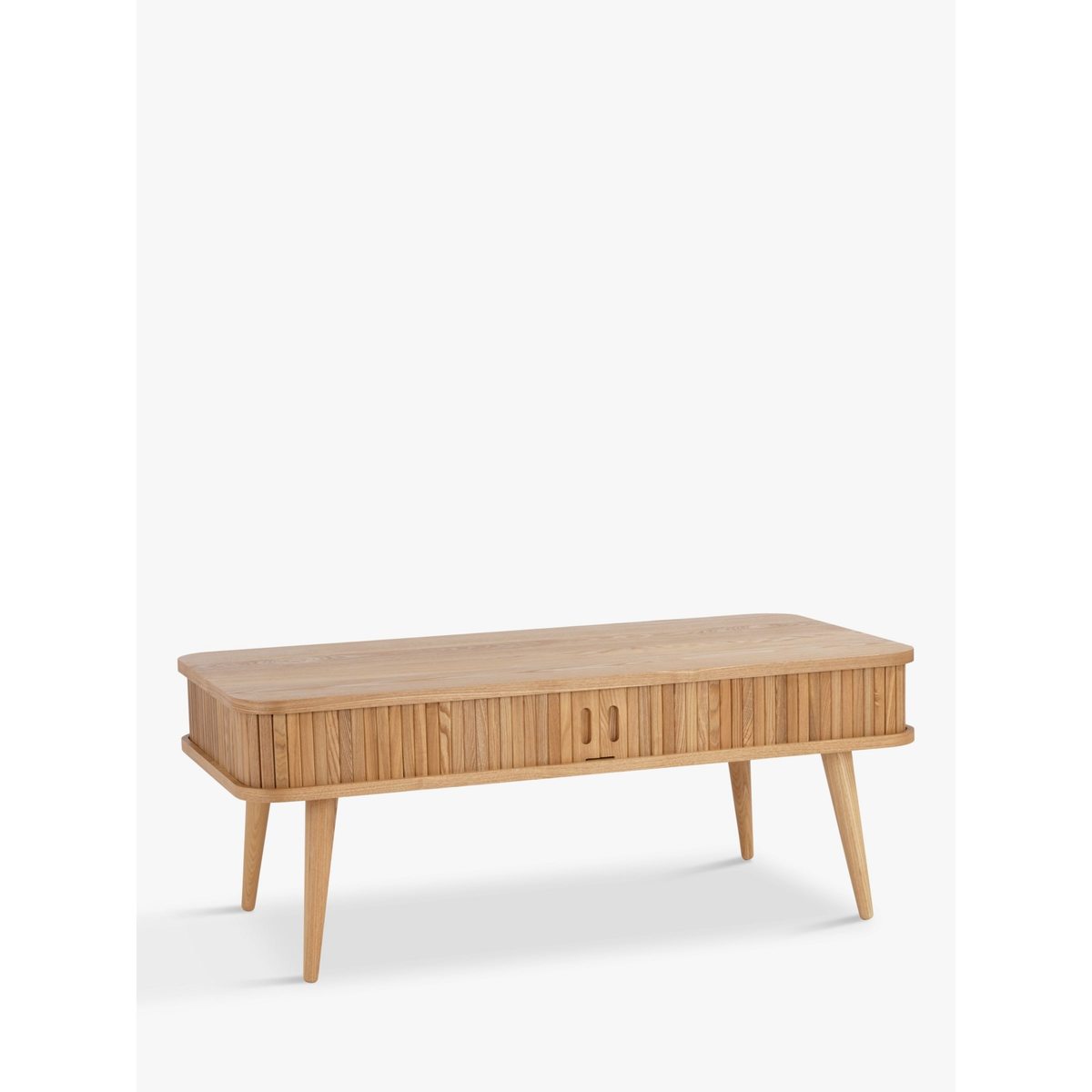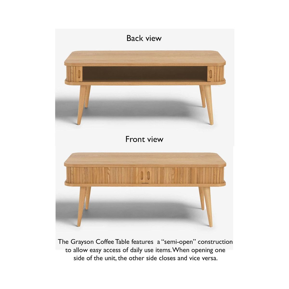 Clever storage for your modern home. We've designed this coffee table so you can keep your living room tidy and clutter-free. Part of our Grayson range, a slatted sliding door around the edge opens to reveal a hollow storage space in the centre. It's made from a combination of high-quality woods in a durable veneered finish, and turned legs give the Scandi-inspired design a sleek and retro edge. Easy to assemble, this practical table is ideal for stashing the remotes away. Composition breakdown: Oak: Surface: Solid American oak and oak veneers on MDF. Legs: Solid American oak Dark: Surface: American walnut veneers on MDF. Legs: Stained rubberwood Want to see it first? You may want to see and get a feel for the furniture in one of our shops before ordering. We'll be able to tell you where the range you'd like to view is on display.