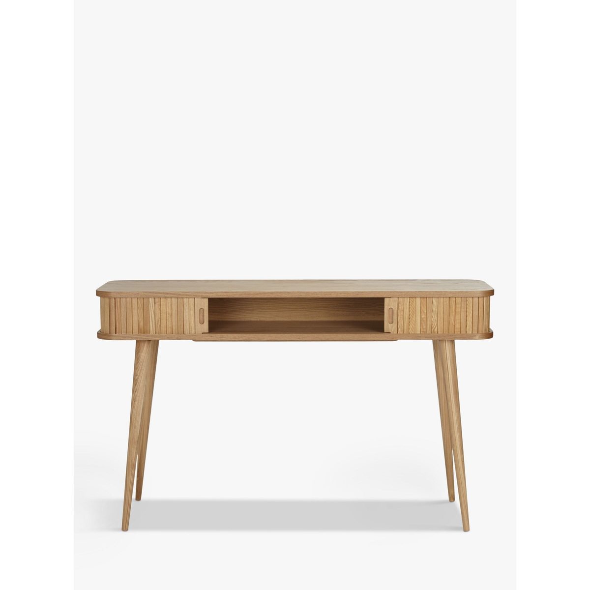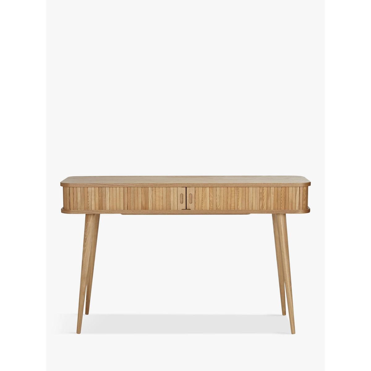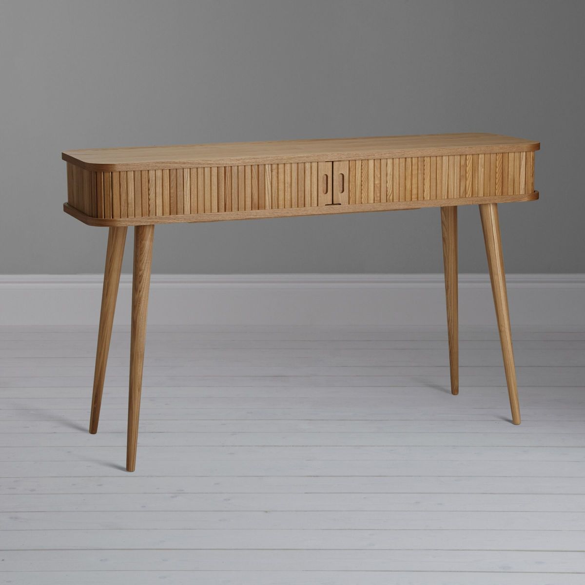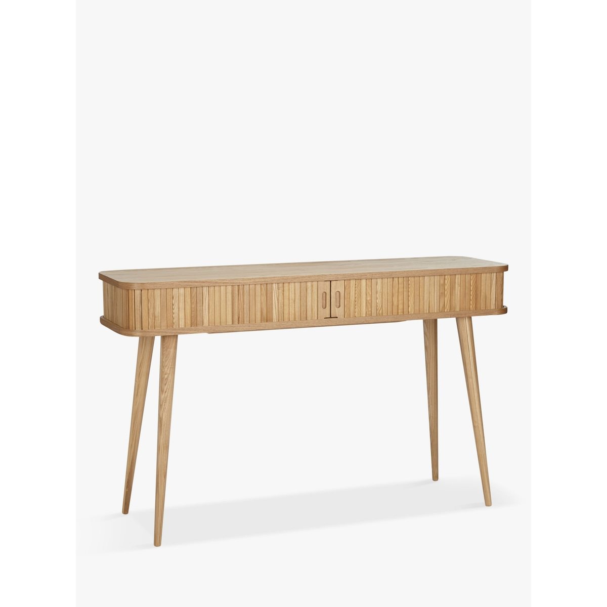 Make the most of your space and pick clever storage options for your modern home. Ideal for hallways or living rooms, our Grayson console table is designed with a slatted sliding door that opens to reveal useful internal storage space. Easy to assemble, we've made it from a combination of high-quality woods that are coated in a sleek veneer for durability. Turned legs give the Scandi-inspired design a retro edge, giving this functional table an eye-catching and stylish finish. Composition breakdown: Oak: Cabinet body: Solid American oak and oak veneers on MDF. Legs: Solid American oak Dark: Cabinet body: American walnut veneers on MDF. Legs: Stained rubberwood Want to see it first? You may want to see and get a feel for the furniture in one of our shops before ordering. We'll be able to tell you where the range you'd like to view is on display.