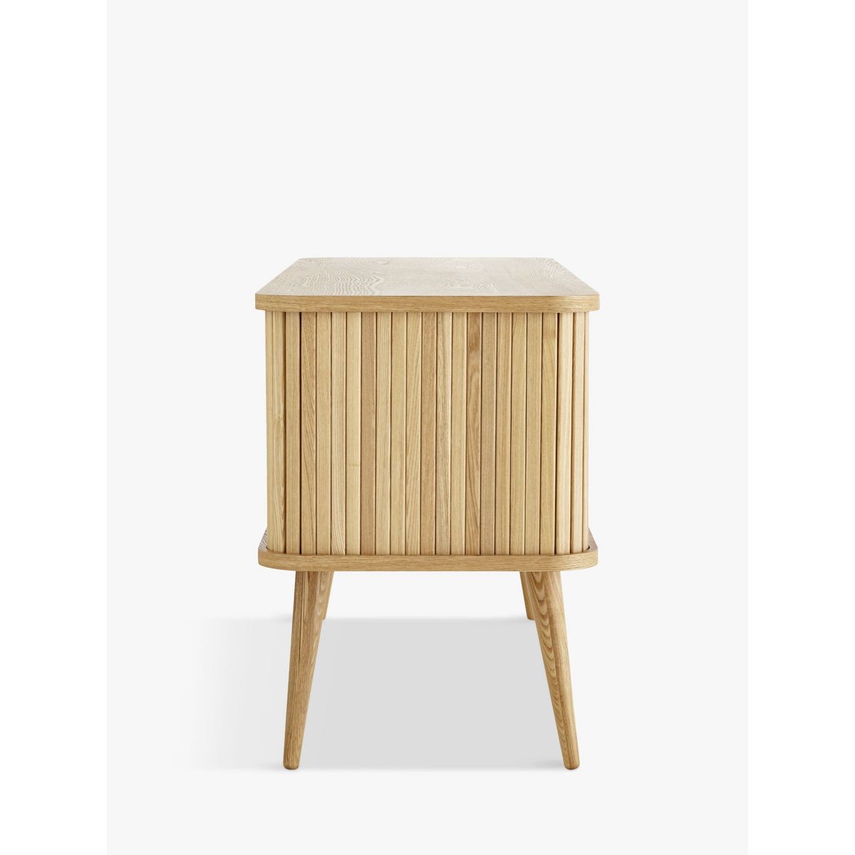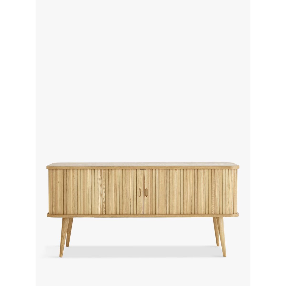 Providing a robust base for your TV, as well as storage space for your media consoles, this spacious TV Stand is ideal for your modern home. Part of our Grayson range, it's made from a combination of high-quality woods which we've coated in a veneer for durability. The slatted doors glide open to reveal two adjustable glass shelves, and there are cable holes to keep unsightly wires in order. While the design has a Scandinavian focus, its turned legs give it a cool, retro edge. Composition breakdown: Oak: Cabinet body: Solid American oak and oak veneers on MDF. Legs: Solid American oak Dark: Cabinet body: American walnut veneers on MDF. Legs: Stained rubberwood Want to see it first? You may want to see and get a feel for the furniture in one of our shops before ordering. We'll be able to tell you where the range you'd like to view is on display.