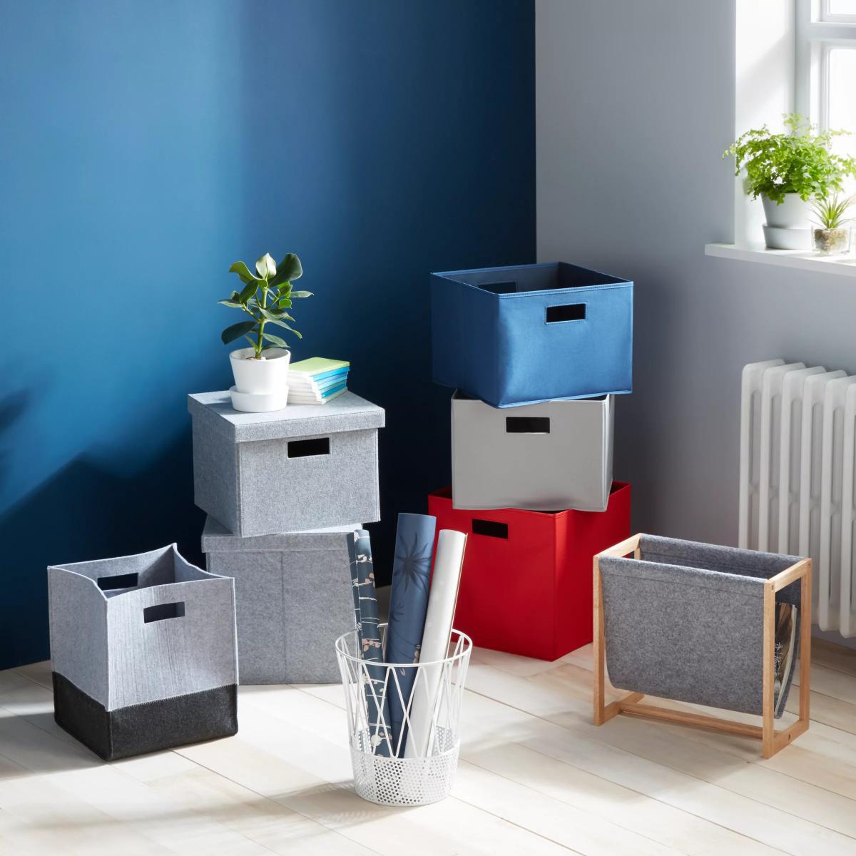 This felt box is ideal for storing all kinds of bits and bobs, helping to keep your home tidy and organised. It has a large capacity and features integrated handles to help you move it from place to place. The outer box collapses for storage, inside the lid, when not in use. Our felt is made using fibres which have been produced using recycled plastic bottles, helping to reduce the volume and environmental impact of plastic which could end up in a landfill. Instead producing beautifully designed, tactile, textured felt items within our House range.