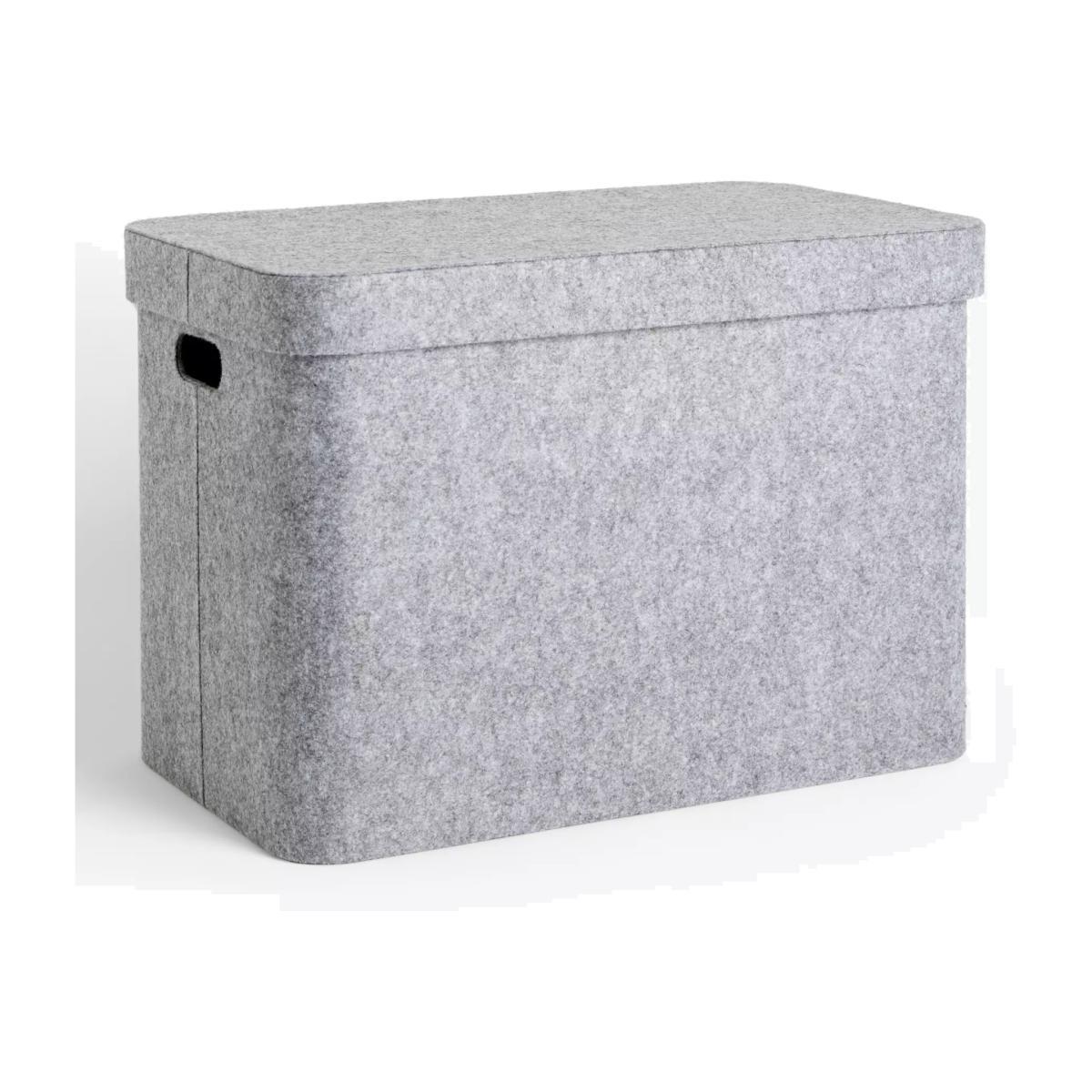 This felt trunk is ideal for storing all kinds of bits and bobs, helping to keep your home tidy and organised. It has a large capacity and features integrated handles to help you move it from place to place. The outer box collapses for storage, inside the lid, when not in use. Our felt is made using fibres which have been produced using recycled plastic bottles, helping to reduce the volume and environmental impact of plastic which could end up in a landfill. Instead producing beautifully designed, tactile, textured felt items within our House range.