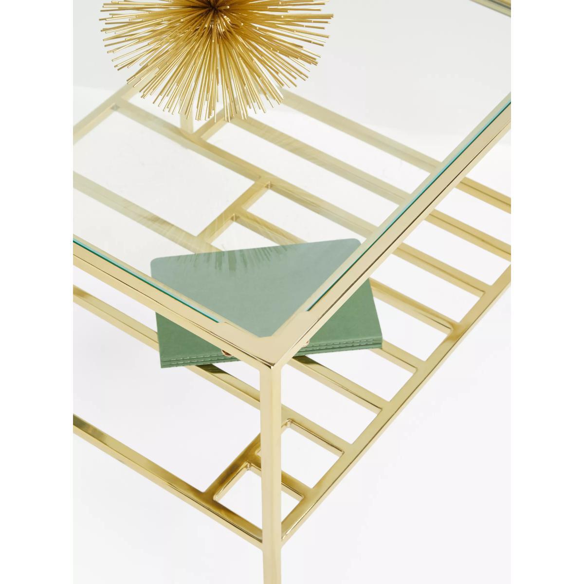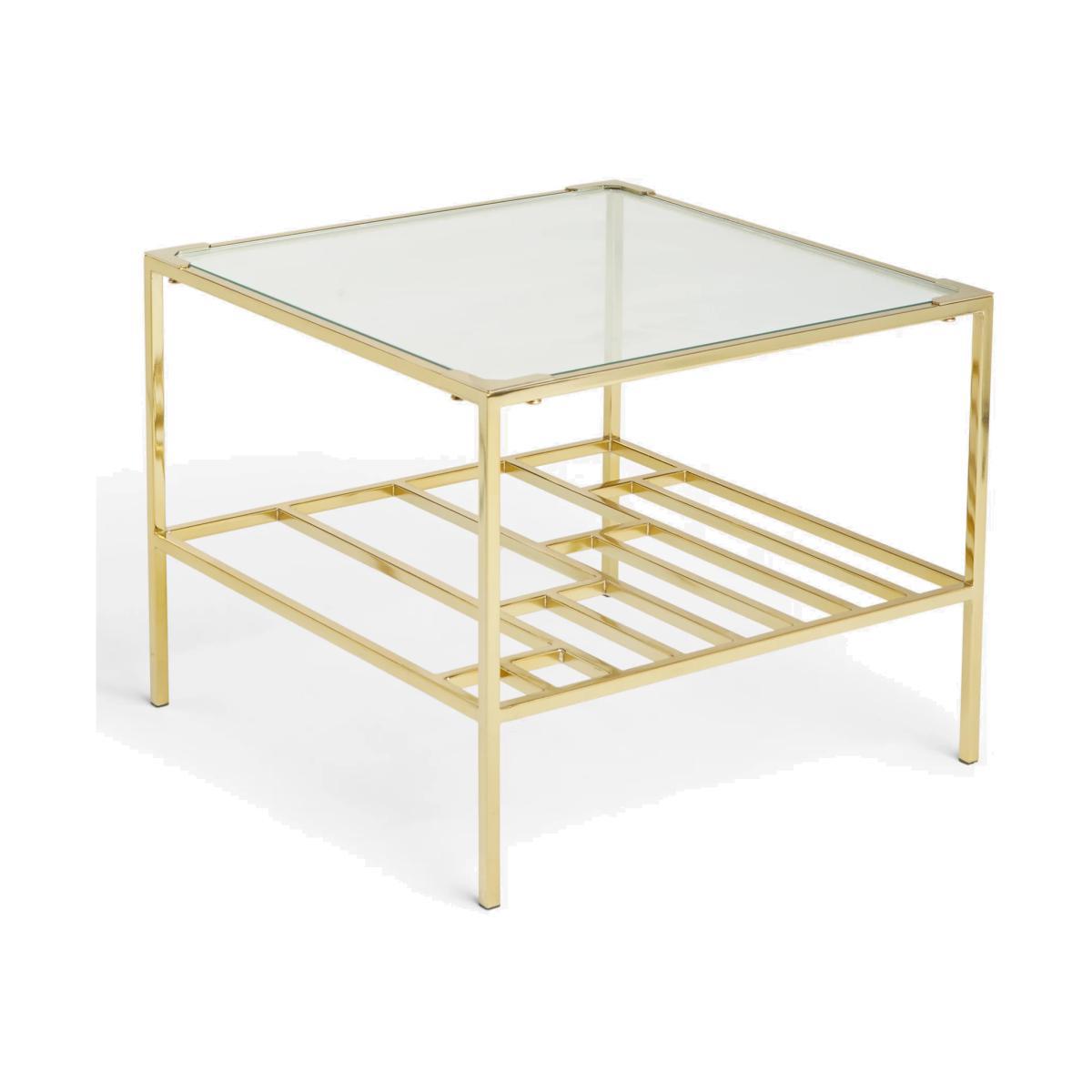 With its bold, Art-Deco-inspired design, this side table will dress up dark corners of your living room. The glass surface top will add a sense of light to your space and it's supported by a robust, welded metal frame in an opulent gold finish. Beneath, there's a metal shelf with a graduated design, perfect for storing books and magazines. Want to see it first? You may want to see and get a feel for the furniture in one of our shops before ordering. We'll be able to tell you where the range you'd like to view is on display.