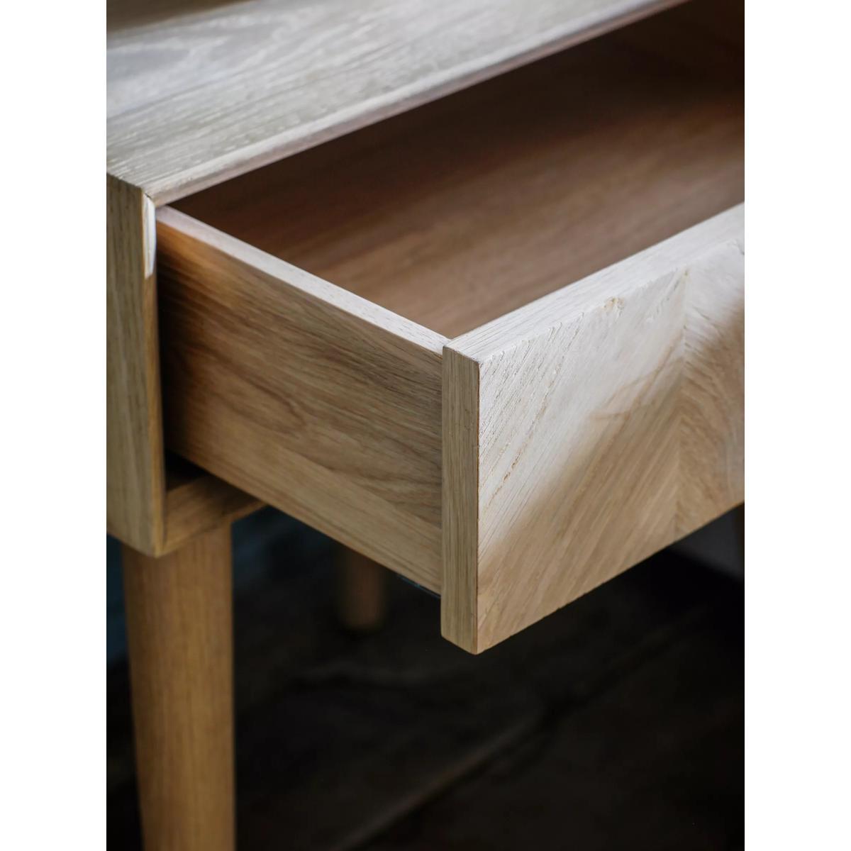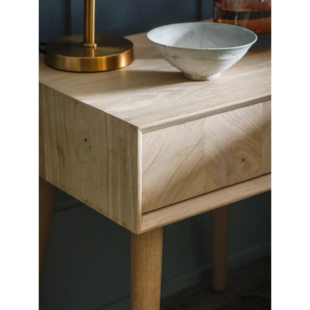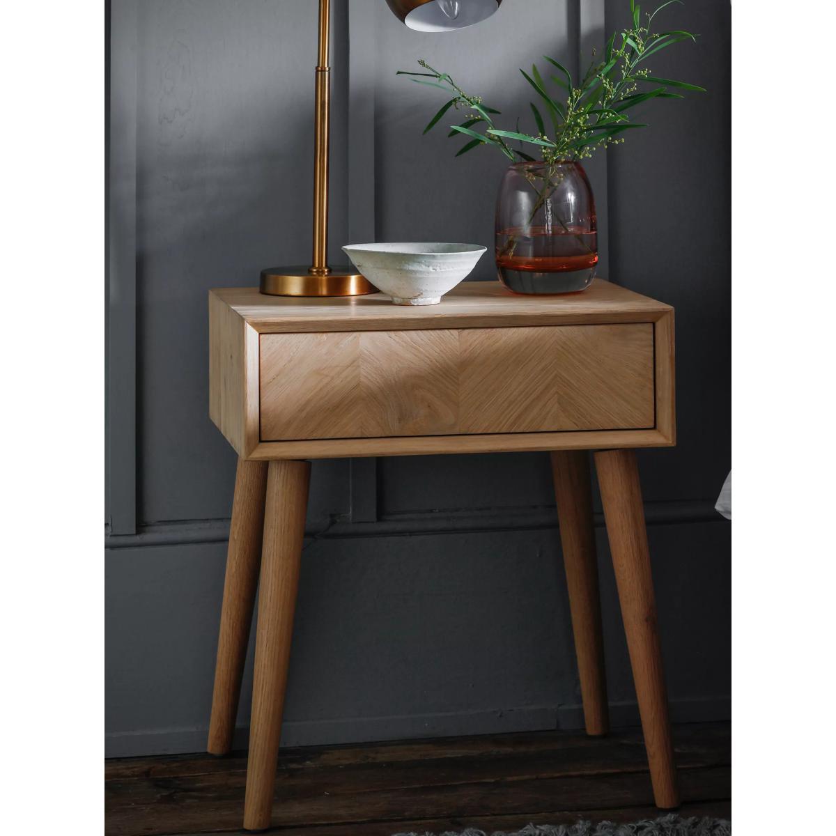 I love the simplicity and natural warmth of the Haegan bed side table. Its oak finish makes it versatile enough to complement various interior styles, from Scandi minimalism to cosy rustic avenues. The clean lines and tapered legs give it a modern yet timeless look, making it a great focal point beside a bed without overwhelming the space. For styling tips, consider layered lighting with a small table lamp or a few favourite books and plants on top to add personality. This piece works particularly well in calm, neutral schemes but can also play a supporting role in more eclectic interiors when paired with textured textiles or bold accessories. Its practicality lies in its compact size and sturdy build, perfect for keeping essentials close without clutter.