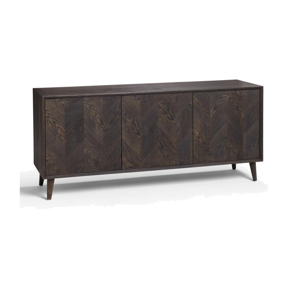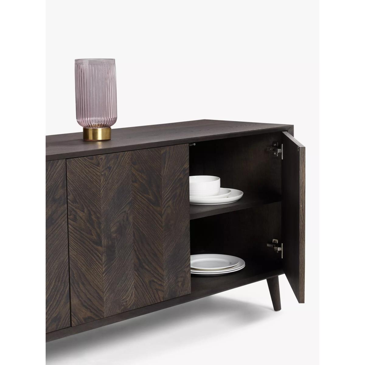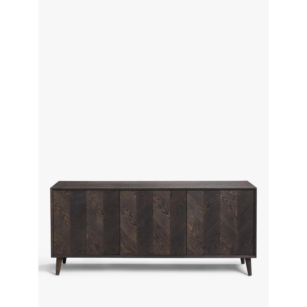 The Haegan range is crafted from European Oak and Rustic Oak structured veneers. Each functional piece showcases the natural grain and knots, that's enhanced in the inlay chevron design. A matt lacquer finish and brushed out grain keeps the wood looking natural and dry, while a subtle mid-century inspired influence makes it ideal for both contemporary and traditional homes. This versatile sideboard is an ideal storage piece for your home. Its three door design opens to reveal two adjustable internal shelves, allowing you to keep your items neatly organised. Supported by slightly angled, short wooden legs, its design features a cable management space to the rear, enabling you to use this sideboard with a TV. Want to see it first? You may want to see and get a feel for the furniture in one of our shops before ordering. We'll be able to tell you where the range you'd like to view is on display.