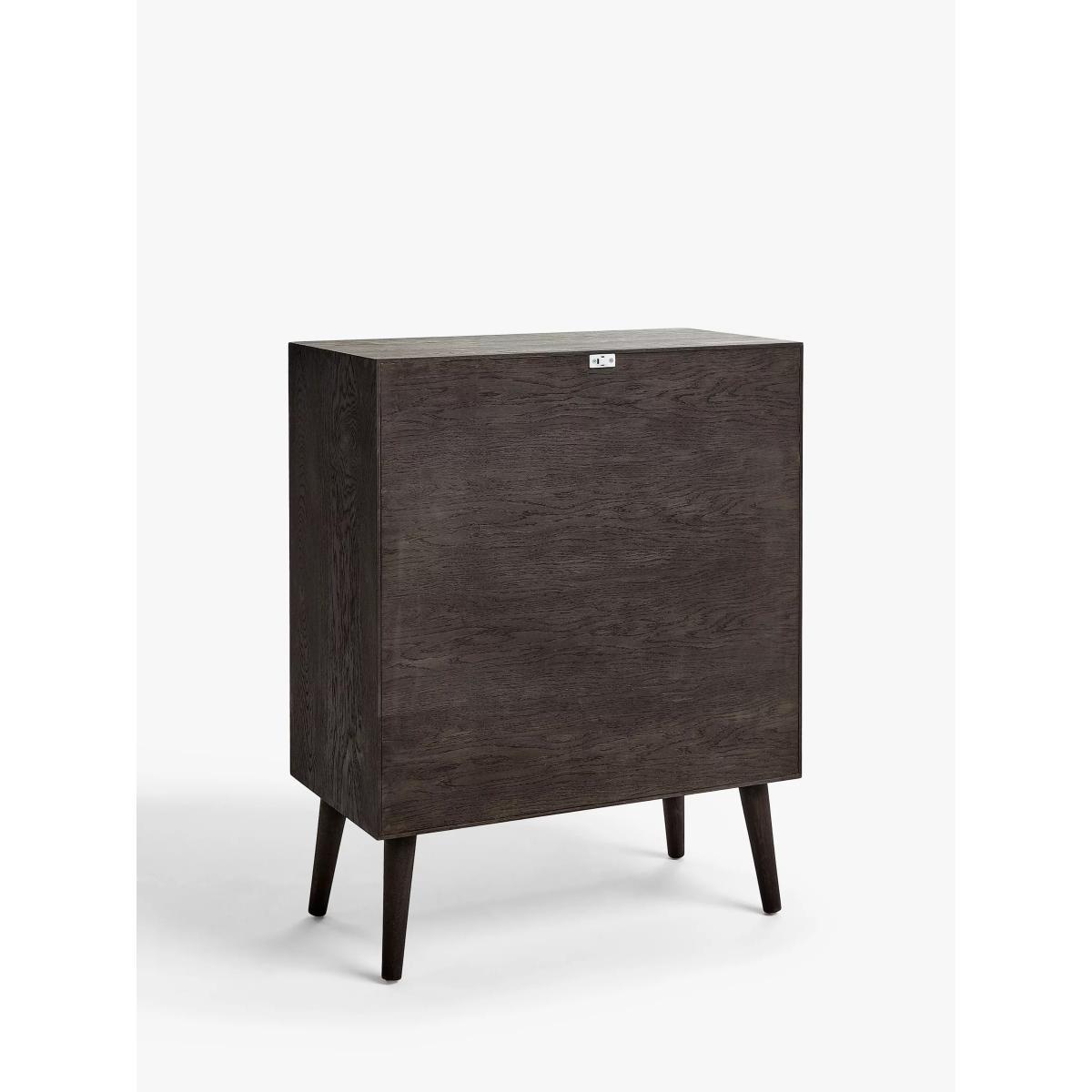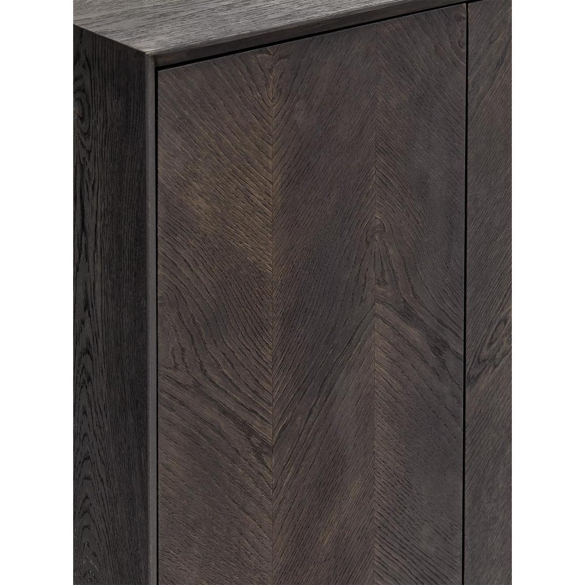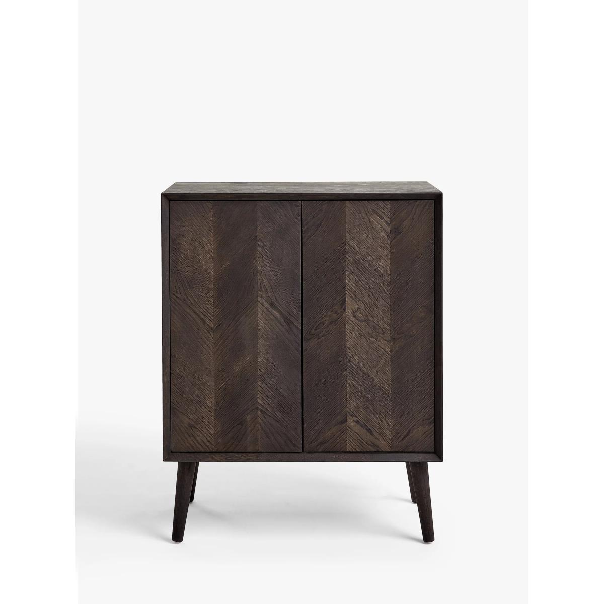 The Haegan range is crafted from European Oak and Rustic Oak structured veneers. Each functional piece showcases the natural grain and knots, that's enhanced in the inlay chevron design. A matt lacquer finish and brushed out grain keeps the wood looking natural and dry, while a subtle mid-century inspired influence makes it ideal for both contemporary and traditional homes. This versatile storage cabinet is ideal for living rooms and hallways. Designed with rounded splayed legs that offer a sturdy base, it opens to reveal an internal adjustable shelf, allowing you to keep your home essentials neatly stored and organised. Want to see it first? You may want to see and get a feel for the furniture in one of our shops before ordering. We'll be able to tell you where the range you'd like to view is on display.