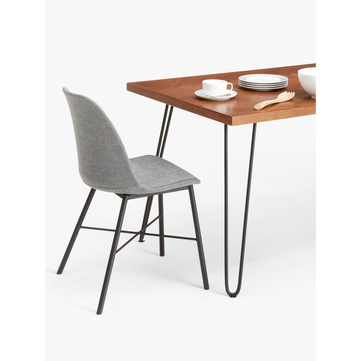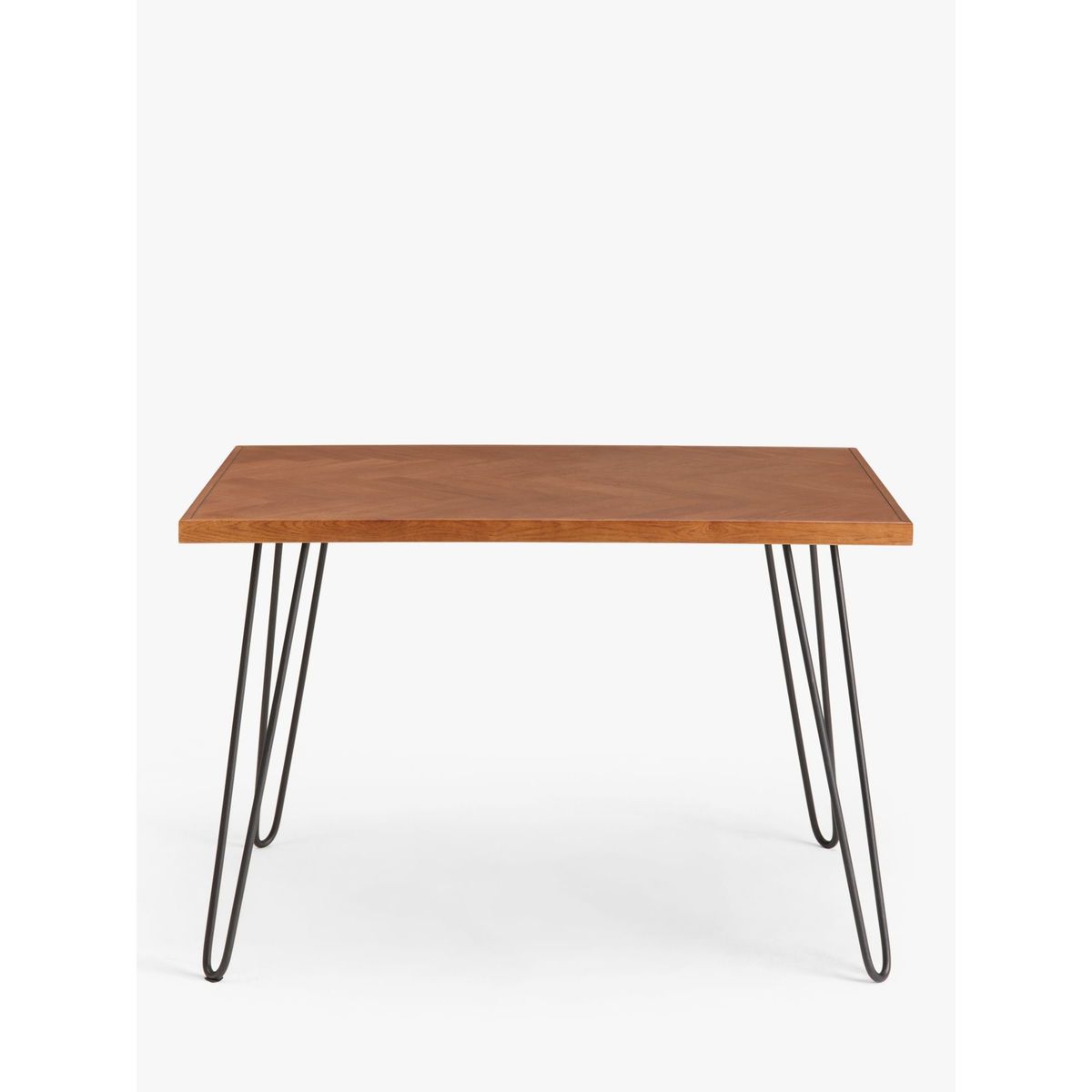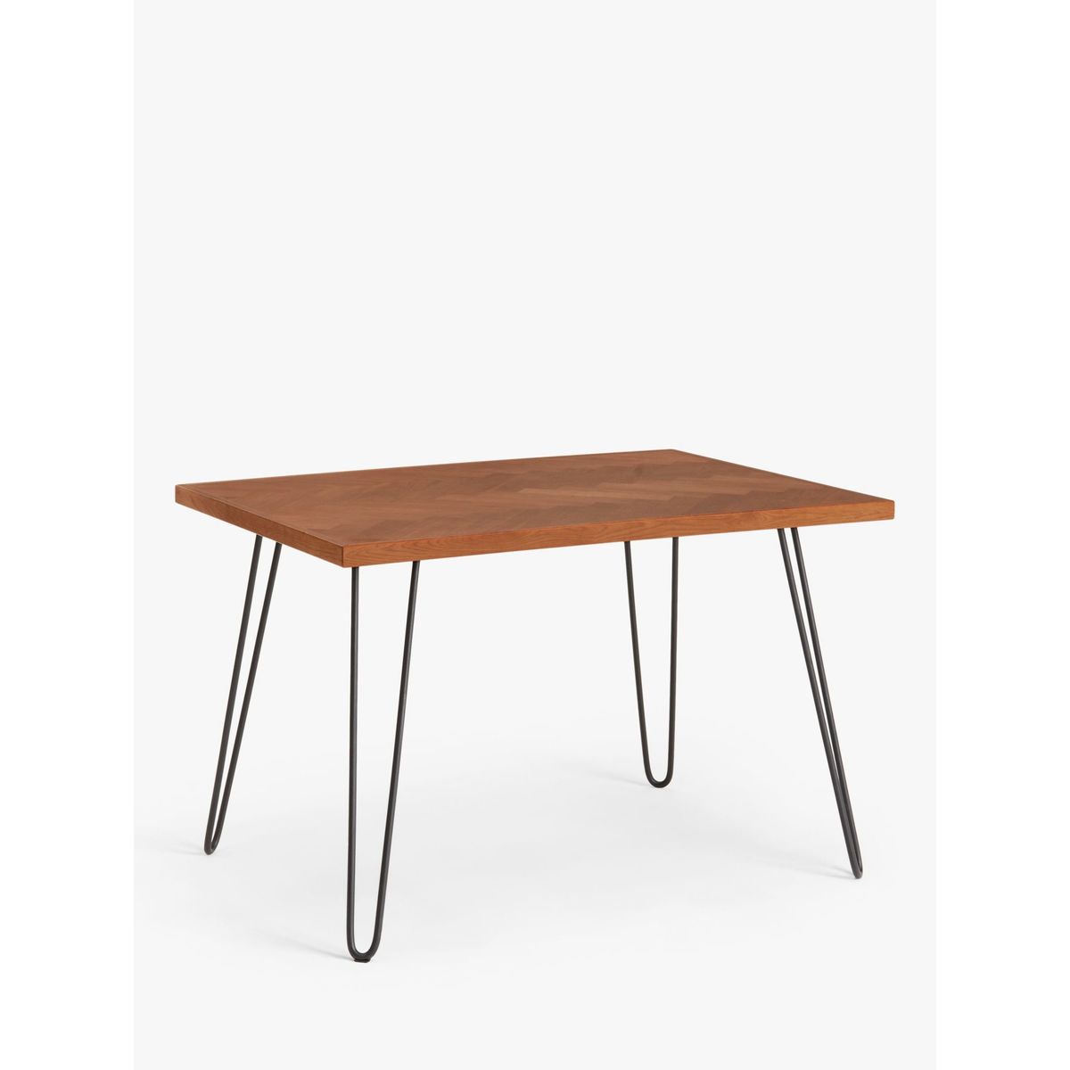 With its sturdy surface top and sleek, hairpin-shaped legs, we've designed this functional dining table with a retro edge. It seats up to six people and its minimalist metal frame makes it well-suited in smaller, more compact rooms as it keeps the design light and airy, so it won't make your space feel overcrowded. The table itself is made from a combination of high-quality solid oak, veneers and particleboard and assembled in a striking parquet pattern. This exposes the natural markings and colour of the warm wood grain and gives the design a timeless finish. Want to see it first? You may want to see and get a feel for the furniture in one of our shops before ordering. We'll be able to tell you where the range you'd like to view is on display.
