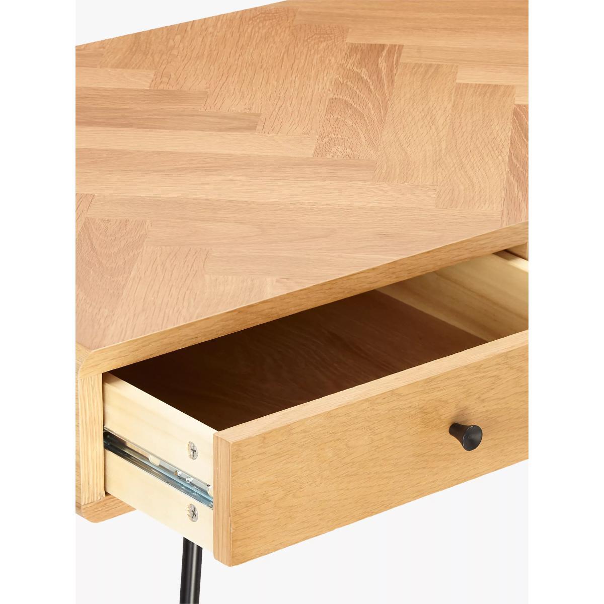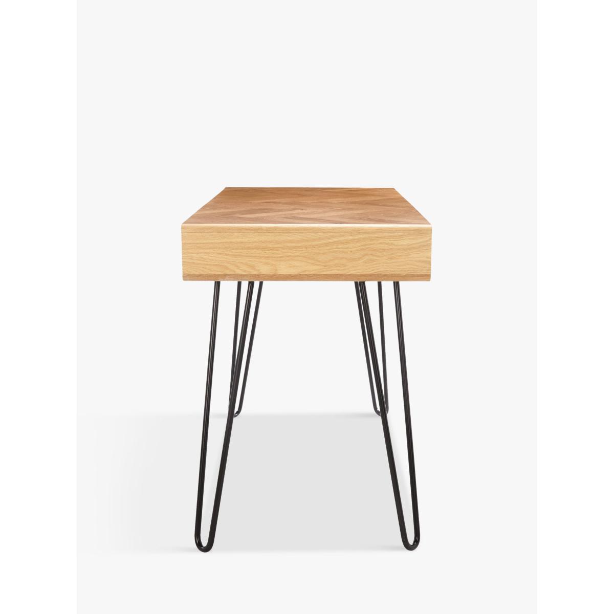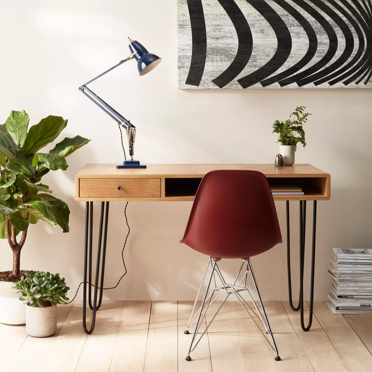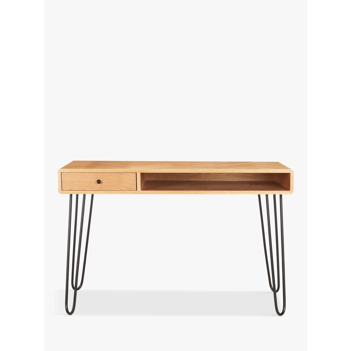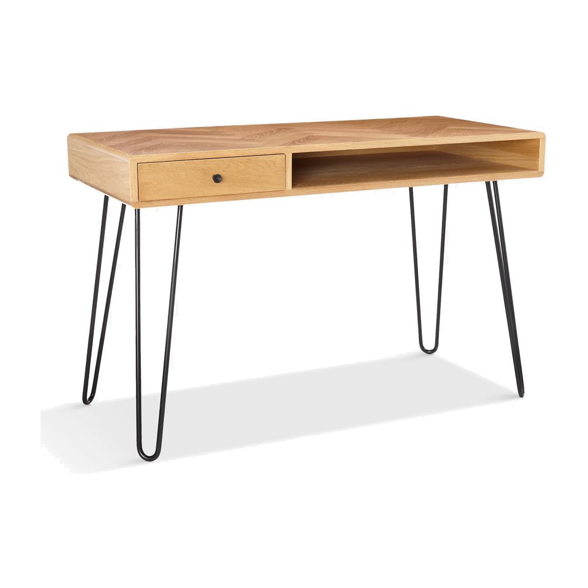 Our freestanding Hairpin Desk combines modern design with sleek functionality. Crafted from oak veneer, its appealingly natural look and feel is enhanced by its parquet finish, that lends a bespoke styling accent. Featuring a useful drawer (H9 x W76 x D54cm) that sits next to a hollow compartment, it's perfect for keeping your home office essentials neatly organised and tidy. Juxtaposing its classic top texture, it sits atop four rounded, splayed metal legs, that boast an eye-catching hairpin aesthetic, lending a nod to contemporary craftmanship and design. Please note: not all our ranges are on display in our shops.