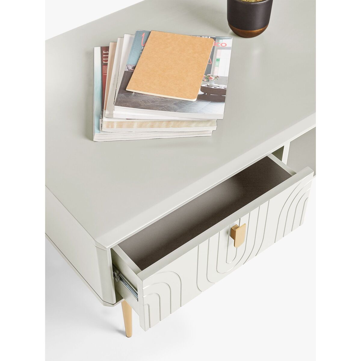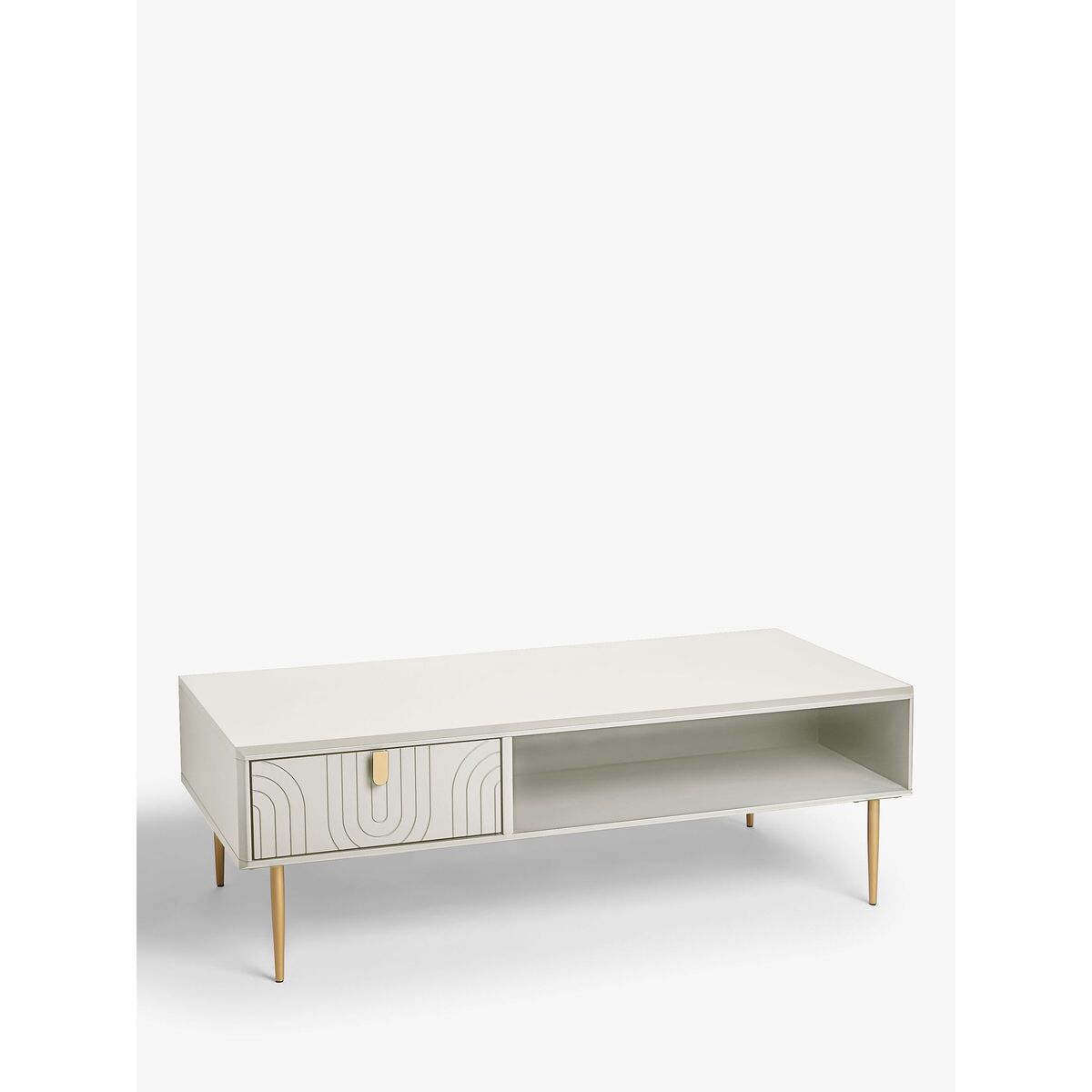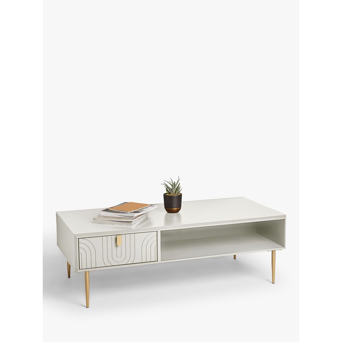 Our Harvard range of furniture combines Art-Deco style with modern shapes to inject character into your space. This coffee table is made from sturdy MDF in a painted finish and features an open shelf section and handy storage drawer. We love the fluid pattern inset on the front of the drawer, as well as the sleek tapered legs, which both add to its playful and contemporary look. Want to see it first? You may want to see and get a feel for the furniture in one of our shops before ordering. We'll be able to tell you where the range you'd like to view is on display.