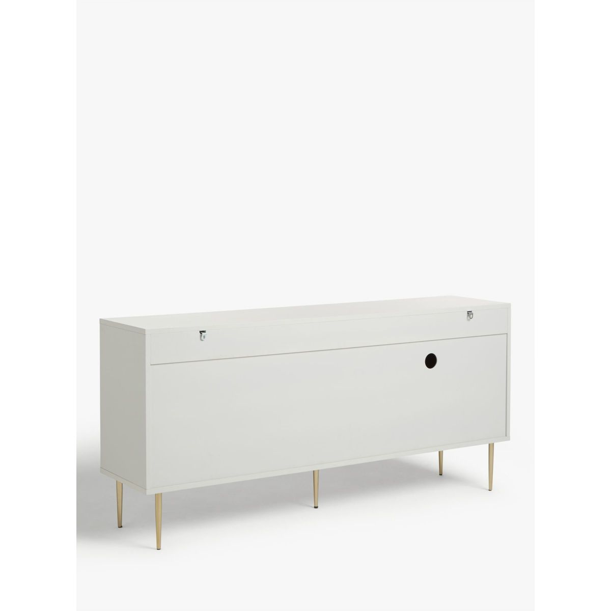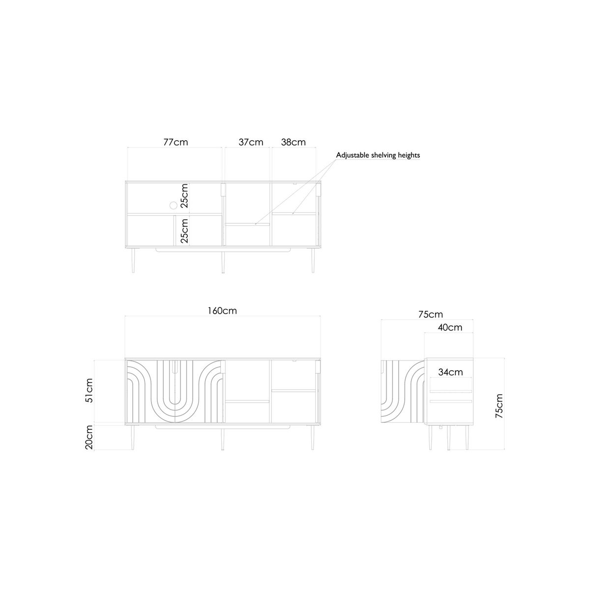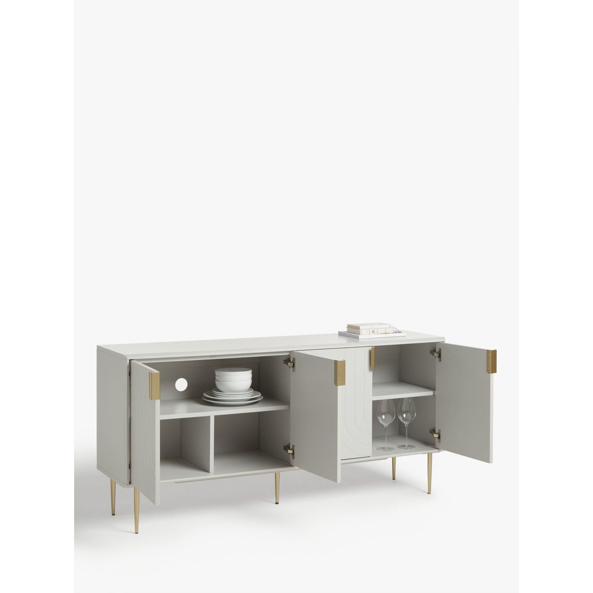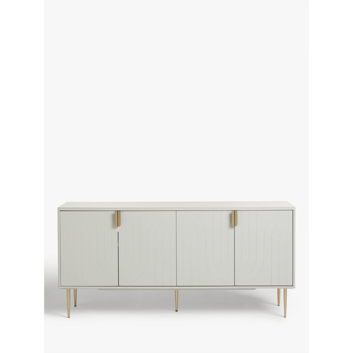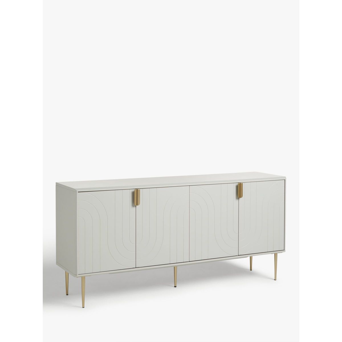 Our Havard range is made up of functional, high-quality products that fuse Art-Deco inspiration with modern geometric shapes. The smooth, matt painted finish of each piece is offset against the warm tone of its fine, gold painted hardware, while a grooved, fluid pattern to the front lends a contemporary detail. This 4 door sideboard is a practical and sophisticated storage option for your living room. Designed with internal shelving to keep your items organised, its clean lined profile and contrasting grooved doors are complemented with subtly tapered steel legs. Cable management holes to the back ensure unsightly console cables are neatly stored away, so you can use also use this sideboard as a TV stand.