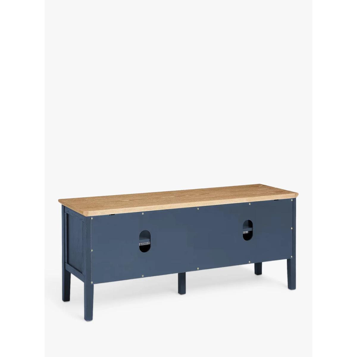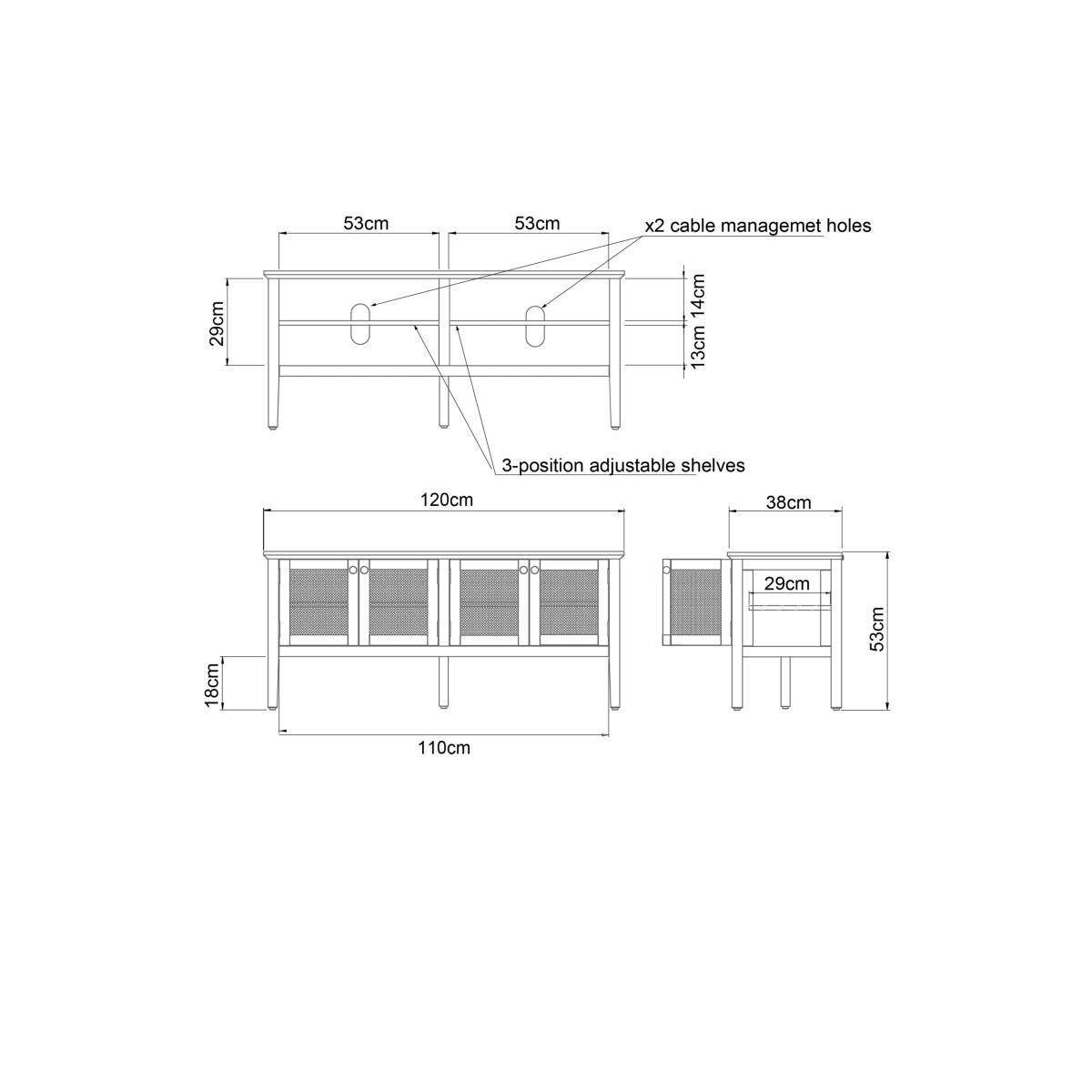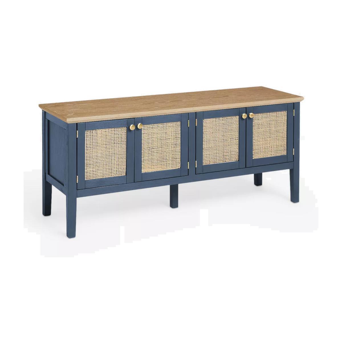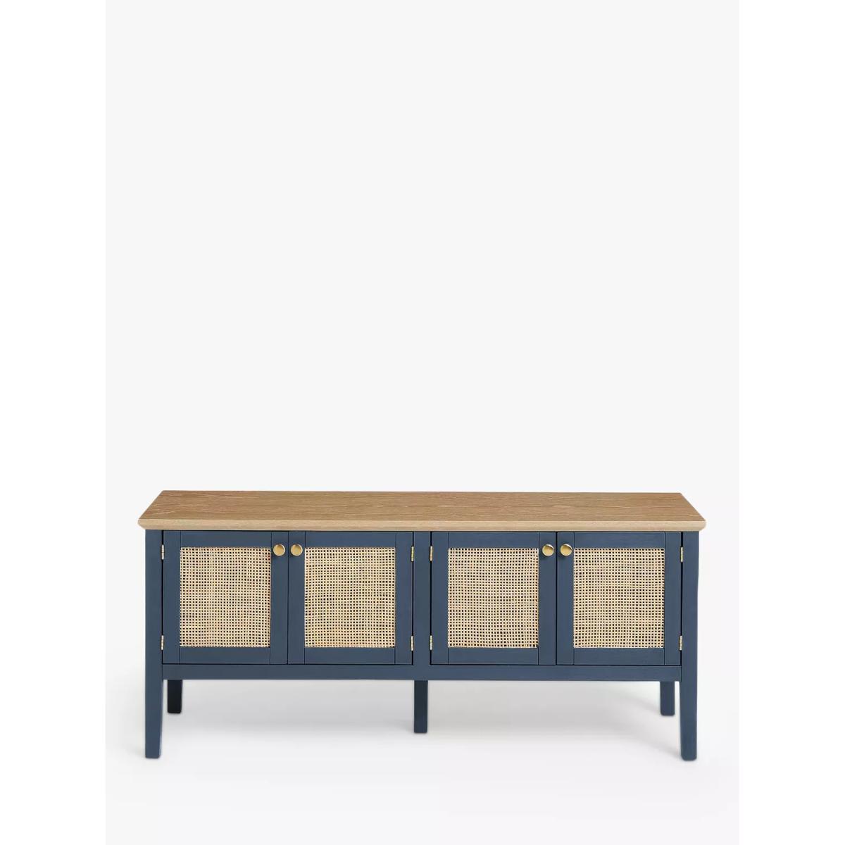 It's the modern country aesthetic that sells this TV stand sideboard, which is built from high-quality timbers using the best crafting techniques. There's plenty of space for media consoles in the two cupboard sections, which have an adjustable shelf inside and a hole at the back to feed cables through. It's made from a combination of acacia wood, MDF and oak with natural rattan adding visual lightness to the front of the doors. The frame is painted to give your space an accent of colour, but we've kept the surface natural for the classic look. Want to see it first? You may want to see and get a feel for the furniture in one of our shops before ordering. We'll be able to tell you where the range you'd like to view is on display.