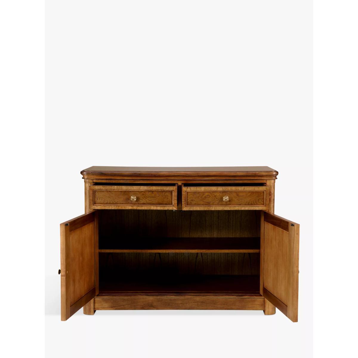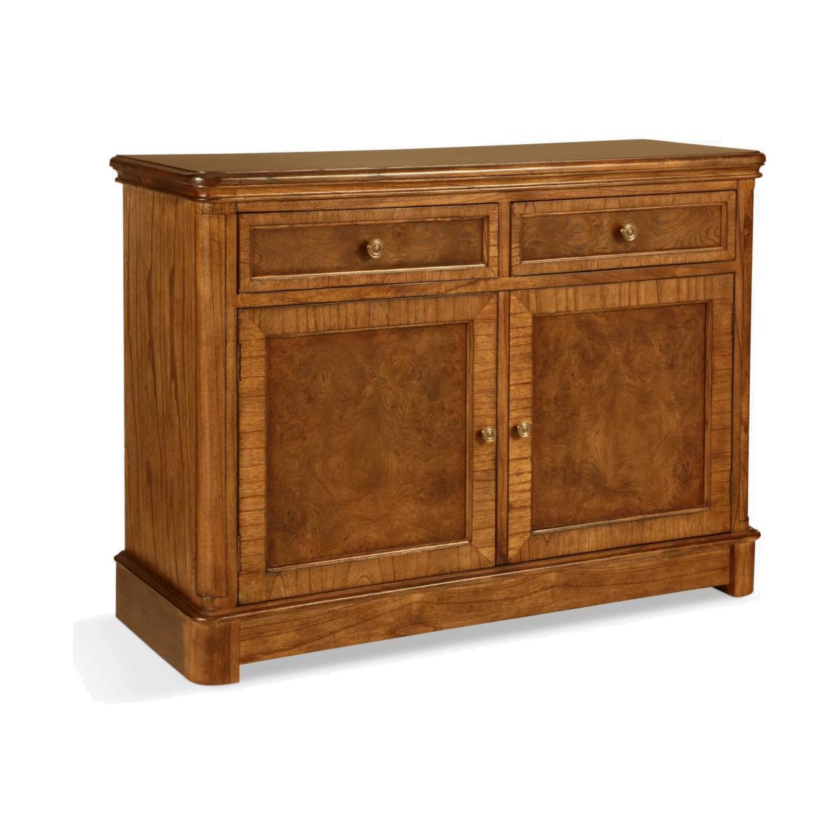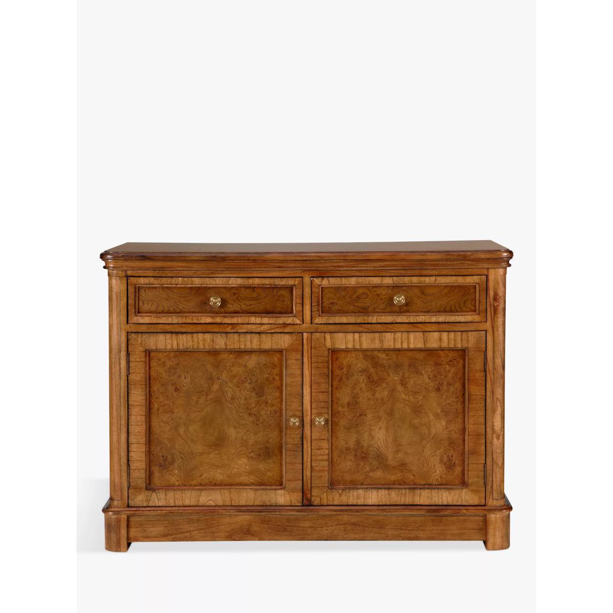 This formal sideboard with 2 drawers and 2 cupboards is made from melia oak solids and pippy oak veneers and is hand-polished with wax lacquer. It’s finished with antiqued brass knob handles and can provide essential storage space in your living room, dining room, bedroom or hallway. Pippy oak features small, tight clusters of knots, which appear sporadically in the growth of the tree. This feature is highly valued by master craftsmen for its decorative appearance. Melia ash is a fast growing tree, taking only 20-25 years to mature, and has been used for its stable and durable qualities. The cane used in Hemingway is natural and handmade This elegant furniture is inspired by the formal yet practical look of the late 19th century Arts and Crafts movement. Each piece in the Hemingway range is made from melia oak solids and pippy oak veneers, stained a rich deep colour, and hand-polished with wax lacquer. For a traditional finish, doors and drawers are finished with antiqued brass knob handles. The Hemingway range features a beautifully distressed finish, which makes each piece utterly unique to its owner. Please note: not all our ranges are on display in our shops.