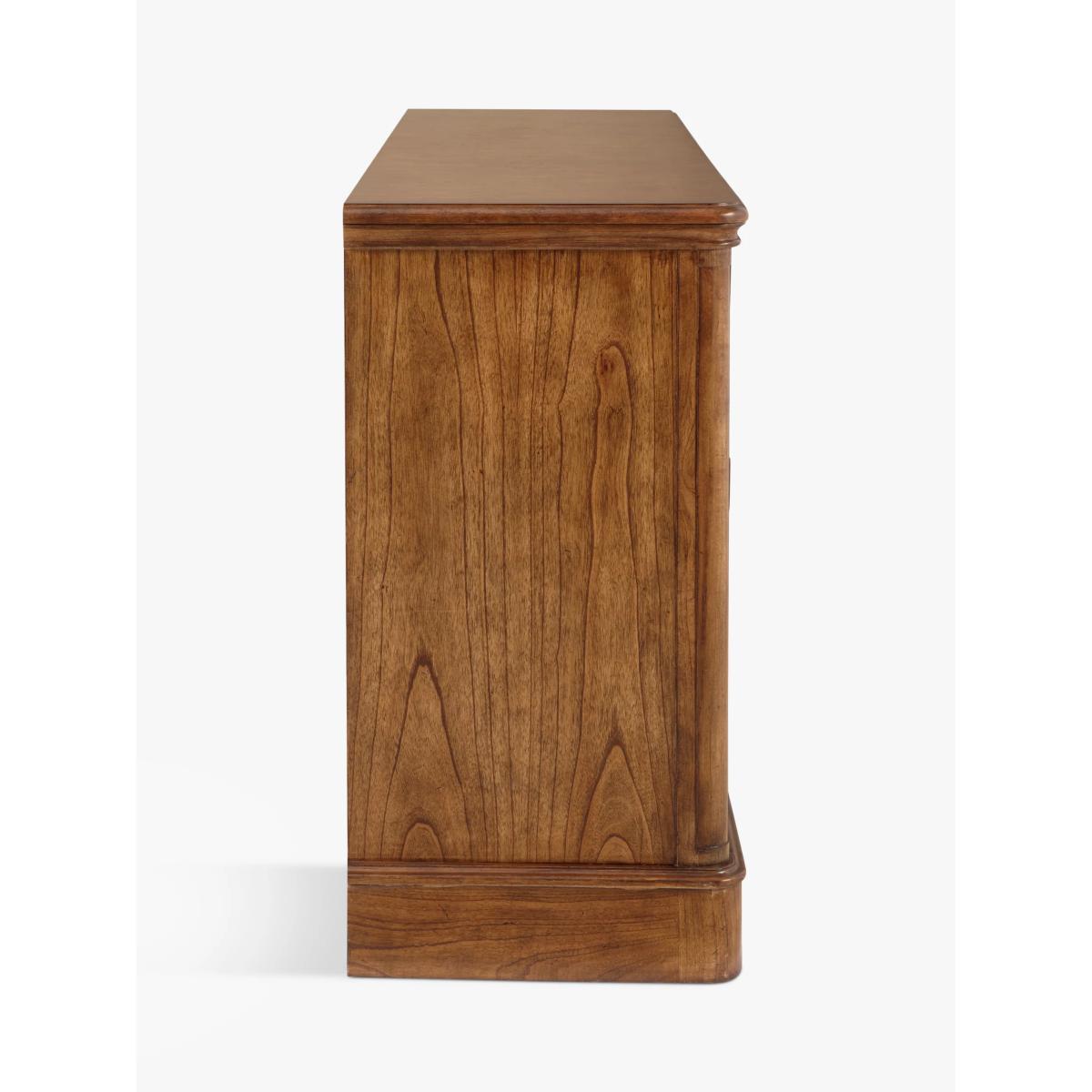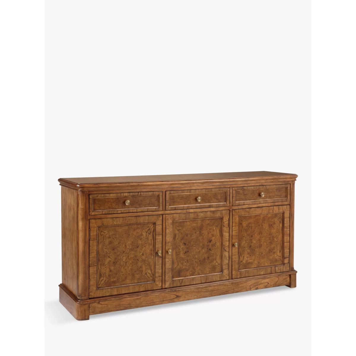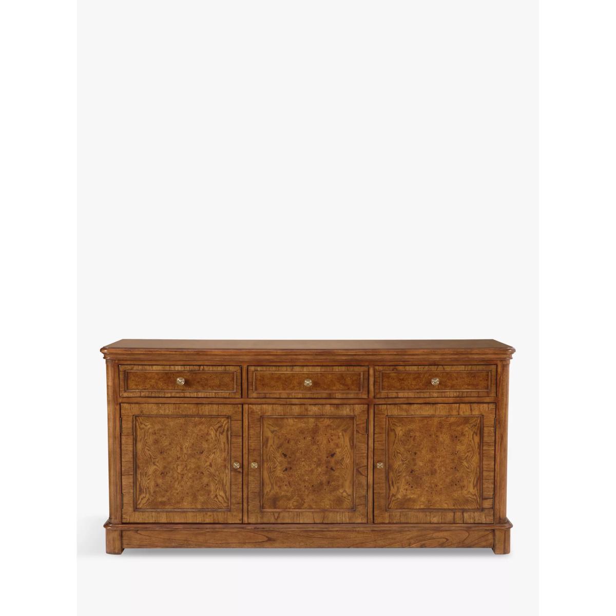 This formal sideboard with 3 drawers and 3 cupboards is made from melia oak solids and pippy oak veneers and is hand-polished with wax lacquer. It’s finished with antiqued brass knob handles and can provide essential storage space in your living room, dining room, bedroom or hallway. Pippy oak features small, tight clusters of knots, which appear sporadically in the growth of the tree. This feature is highly valued by master craftsmen for its decorative appearance. Melia ash is a fast growing tree, taking only 20-25 years to mature, and has been used for its stable and durable qualities. The cane used in Hemingway is natural and handmade This elegant furniture is inspired by the formal yet practical look of the late 19th century Arts and Crafts movement. Each piece in the Hemingway range is made from melia oak solids and pippy oak veneers, stained a rich deep colour, and hand-polished with wax lacquer. For a traditional finish, doors and drawers are finished with antiqued brass knob handles. The Hemingway range features a beautifully distressed finish, which makes each piece utterly unique to its owner. Please note: not all our ranges are on display in our shops.