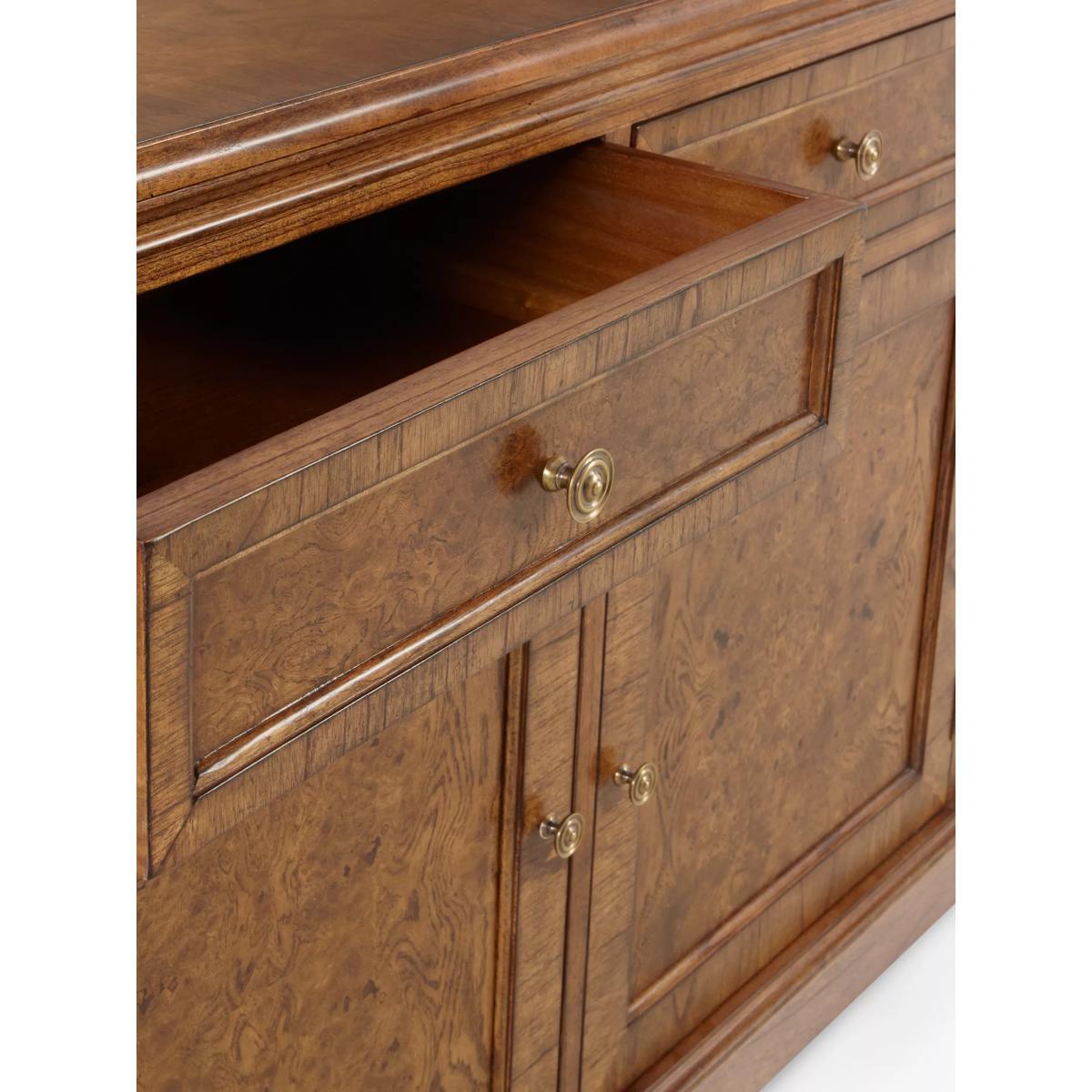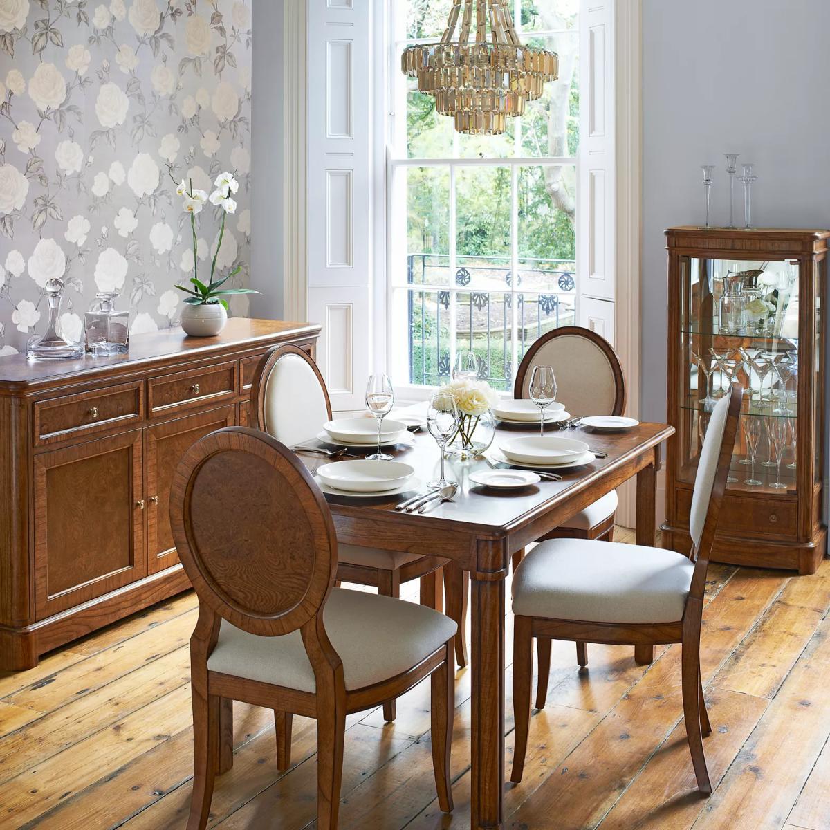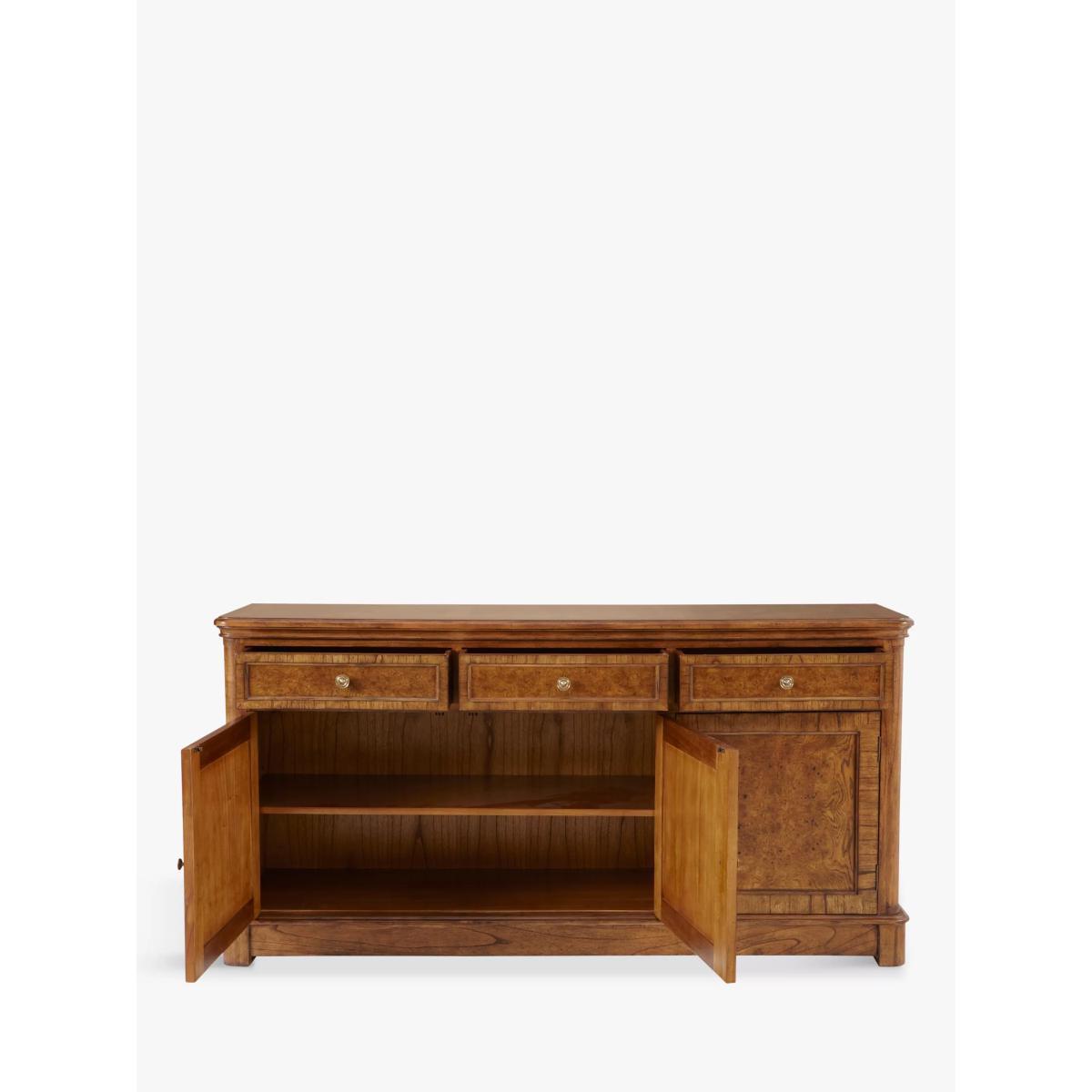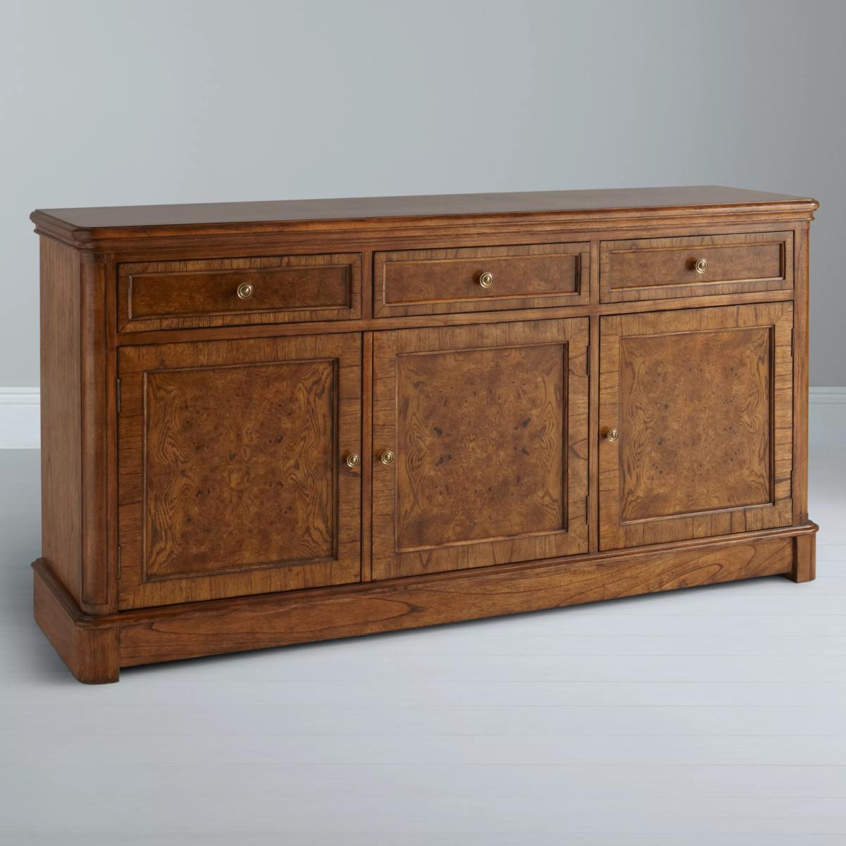 This formal sideboard with 3 drawers and 3 cupboards is made from melia oak solids and pippy oak veneers and is hand-polished with wax lacquer. It’s finished with antiqued brass knob handles and can provide essential storage space in your living room, dining room, bedroom or hallway. Pippy oak features small, tight clusters of knots, which appear sporadically in the growth of the tree. This feature is highly valued by master craftsmen for its decorative appearance. Melia ash is a fast growing tree, taking only 20-25 years to mature, and has been used for its stable and durable qualities. The cane used in Hemingway is natural and handmade This elegant furniture is inspired by the formal yet practical look of the late 19th century Arts and Crafts movement. Each piece in the Hemingway range is made from melia oak solids and pippy oak veneers, stained a rich deep colour, and hand-polished with wax lacquer. For a traditional finish, doors and drawers are finished with antiqued brass knob handles. The Hemingway range features a beautifully distressed finish, which makes each piece utterly unique to its owner. Please note: not all our ranges are on display in our shops.