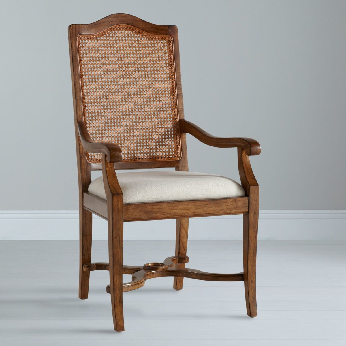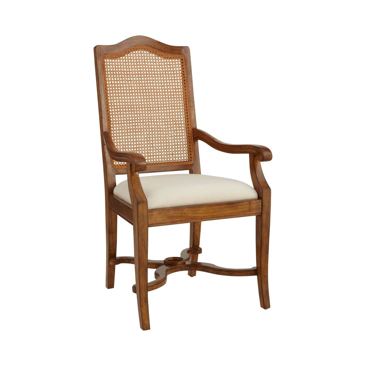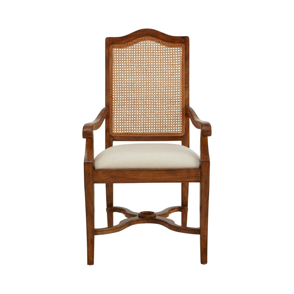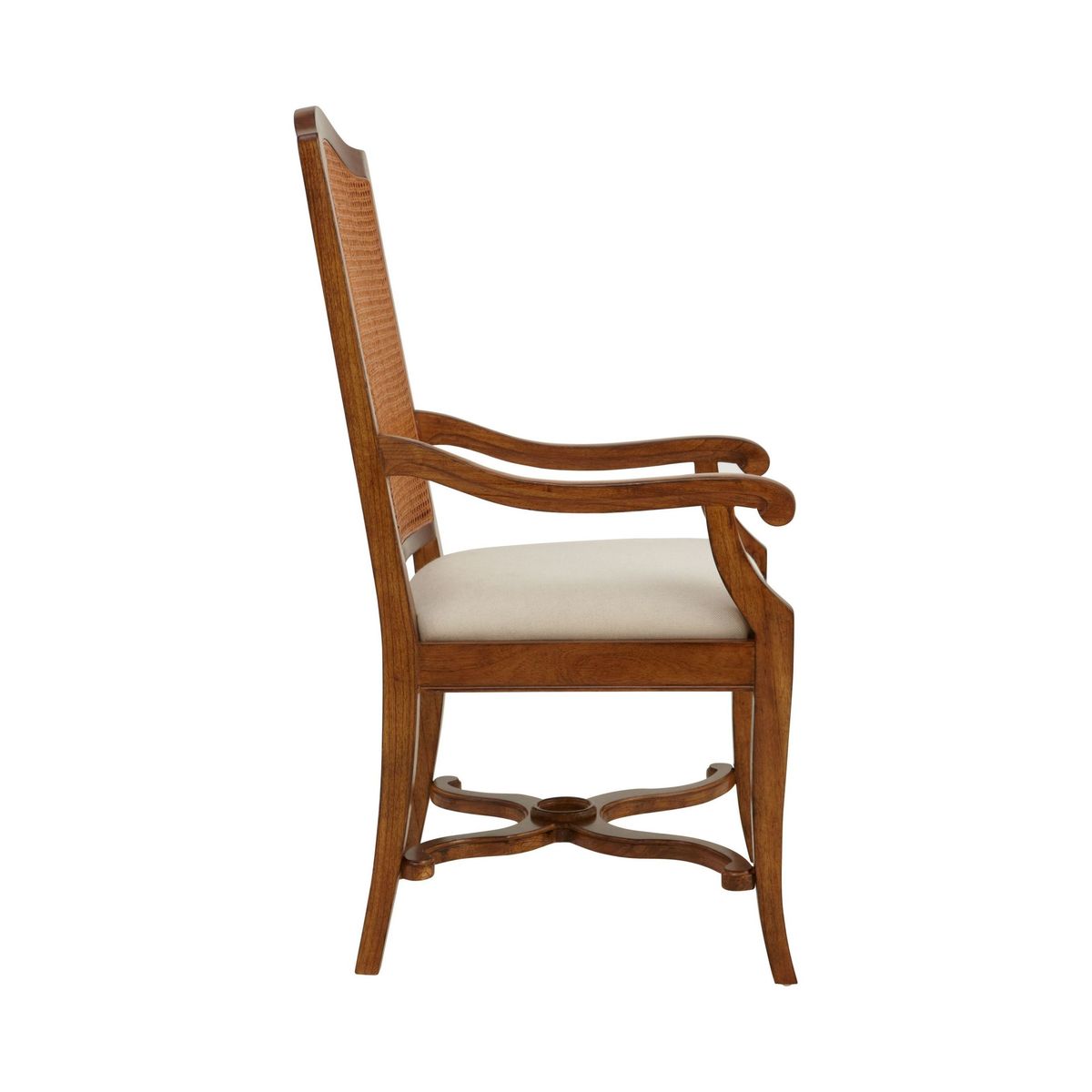 This armchair is made from melia ash and pippy oak veneers. With a cane backrest, plump upholstered seat, and X-shaped stretchers between the tapering legs. , it would make a wonderful addition to your home. Pippy oak features small, tight clusters of knots, which appear sporadically in the growth of the tree. This feature is highly valued by master craftsmen for its decorative appearance. Melia ash is a fast growing tree, taking only 20-25 years to mature, and has been used for its stable and durable qualities. The cane used in Hemingway is natural and handmade This elegant furniture is inspired by the formal yet practical look of the late 19th century Arts and Crafts movement. Each piece in the Hemingway range is made from melia oak solids and pippy oak veneers, stained a rich deep colour, and hand-polished with wax lacquer. For a traditional finish, doors and drawers are finished with antiqued brass knob handles. Please note: not all our ranges are on display in our shops.
