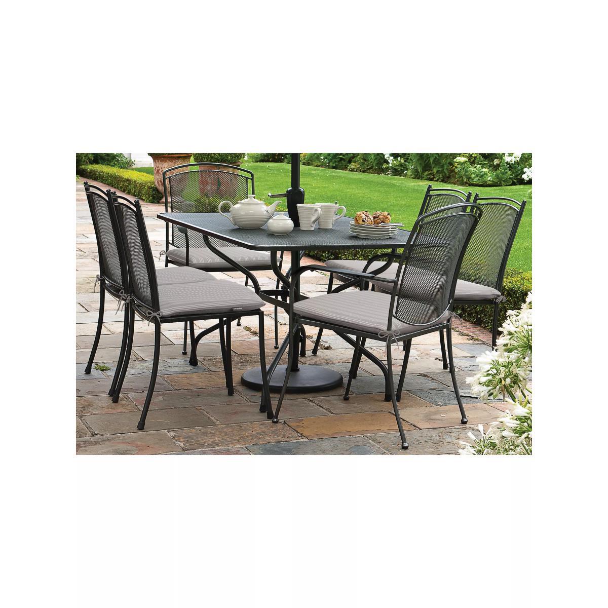 A pair of Henley garden dining chairs with straight sides and wrought iron frames, mesh backrest and seat, in a tough all-weather finish. We've included protective footcaps for indoor as well as outdoor use and the chairs are stackable. The chair's robust frame has been tested to withstand 17 stone (120kg). Elegant and sturdy, the John Lewis & Partners Henley by KETTLER range is made from wrought iron and steel, with a hard-wearing and enhanced Thermoguard+ coating to prevent rusting. The wrought iron frames are coated at 350-degrees Celsius in a mixture of polyester and aluminium to create a tough iron-grey finish that's seven times thicker than paint. Specially developed for outdoor conditions, the coating offers excellent weather protection. This range of garden furniture can withstand the elements and, apart from the cushions, can stay outdoors all year round. It's low maintenance and only requires an occasional wash with mild soapy water. For durability and strength, the range's thick gauge steel mesh surfaces are welded directly to the frames rather than spot-welded. All nuts and bolts are stainless steel for weather-resistant longevity. The range comes with a five-year anti-rust guarantee. Key features: Pair of stackable straight-sided garden chairs Comes with protective footcaps Wrought iron and steel mesh frame Withstands up to 17 stone (120kg) Low maintenance and weather-resistant Enhanced Thermoguard+ coating prevents rusting Cushion sold separately Match with other furniture in the range Want to see it first? You may want to see and get a feel for the product in one of our shops before ordering. We'll be able to tell you where the range you'd like to view is on display.