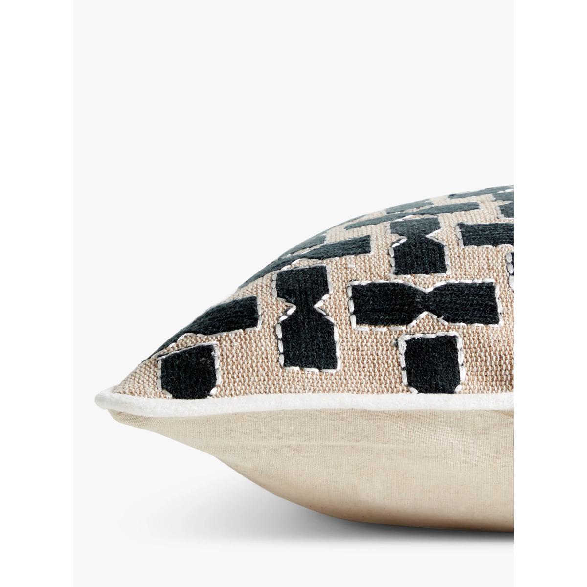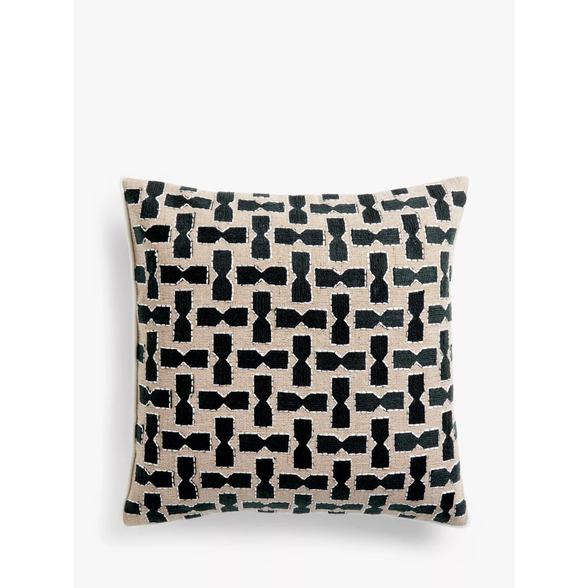A bold and playful geometric cushion, with tessellated hourglass embroidery on a natural jute base.
