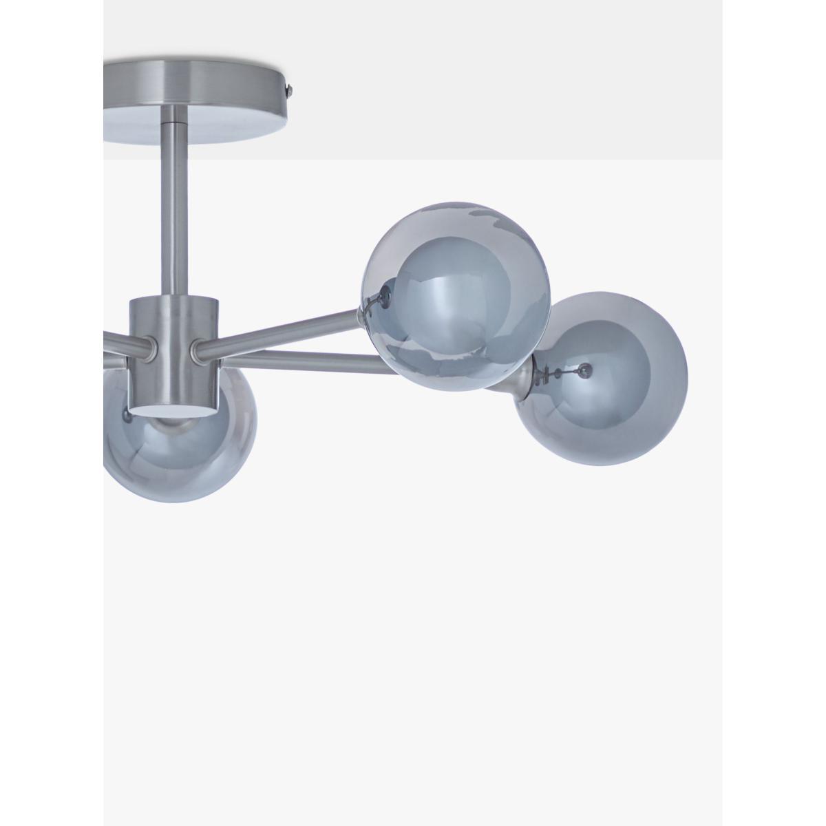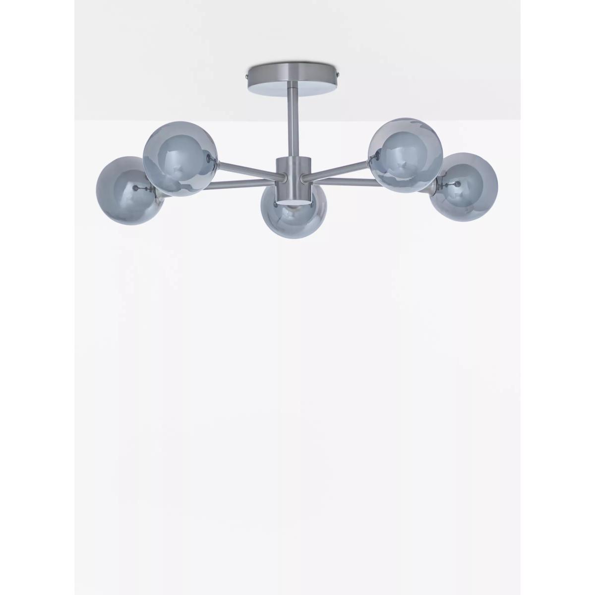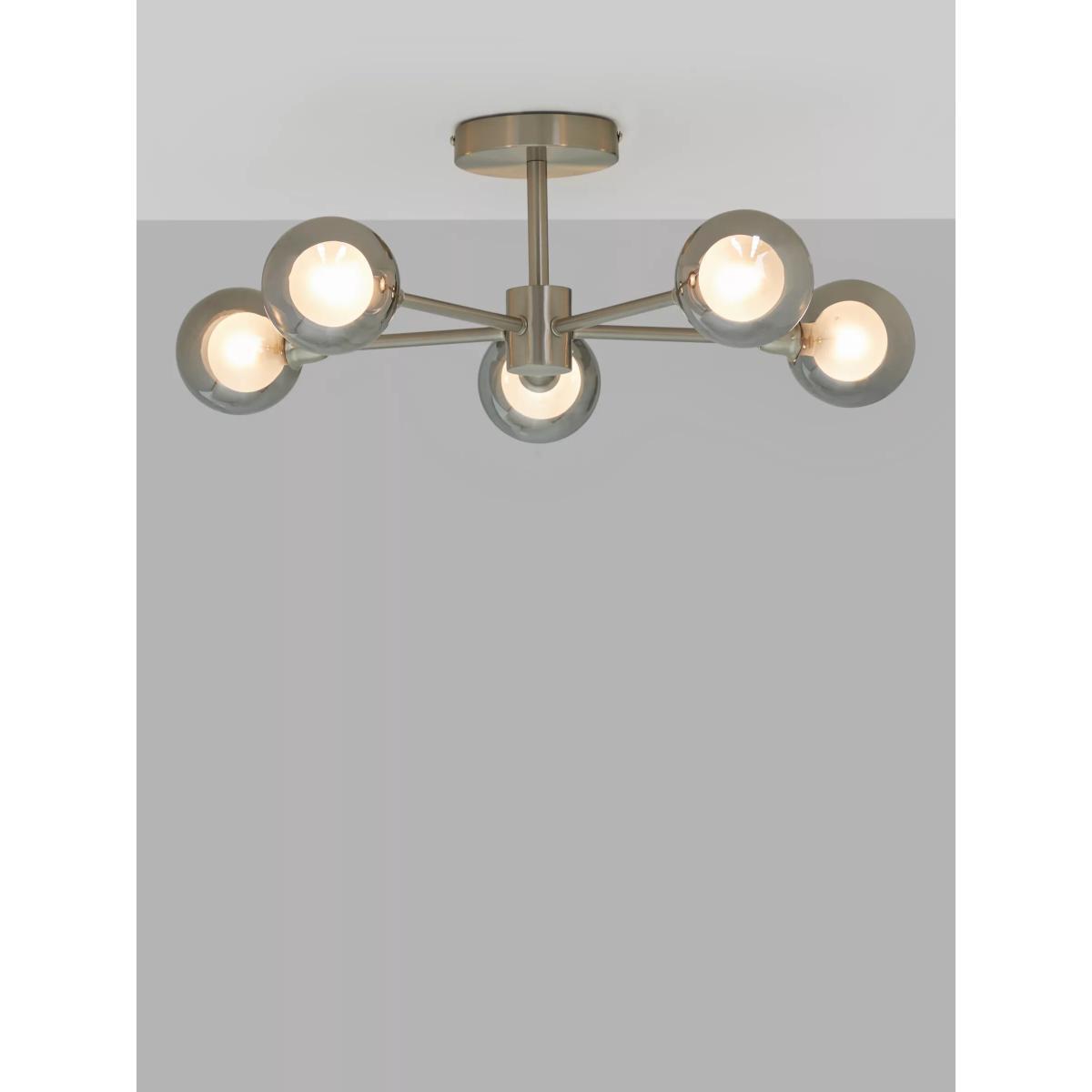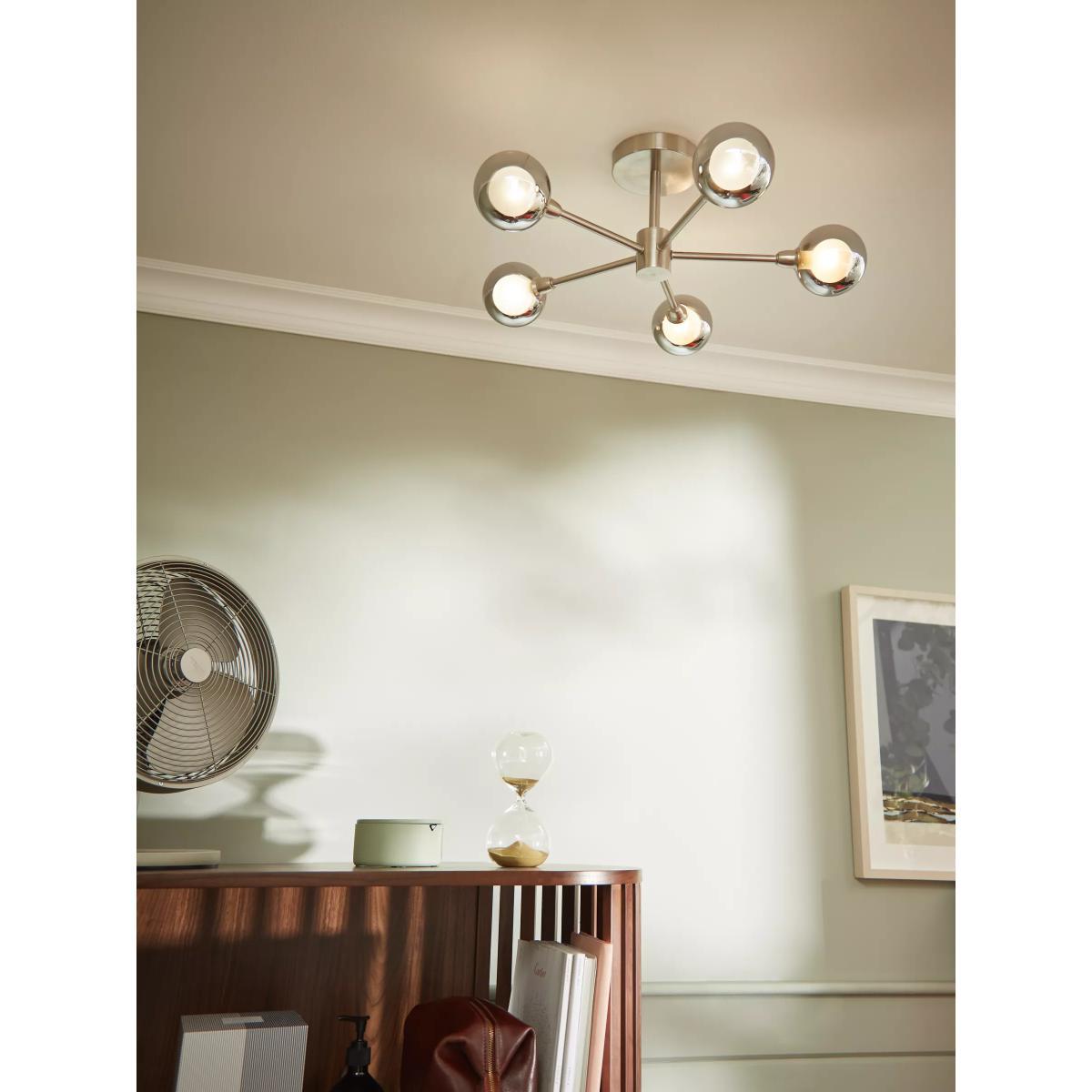 Bold and sleek with a hint of Art-Deco, this fitting is designed with five arms so it will spread light around your room. The shades have a dual-glass design, incorporating both an outer glass and inner glass shade to create two different styles. When switched off, the shades appear semi-transparent, but when the light is switched on, they glow like orbs and create a diffused effect that will draw the eye. Great for bedrooms, living and dining spaces, especially where the ceiling is low or space is limited. Five LED bulbs are required.