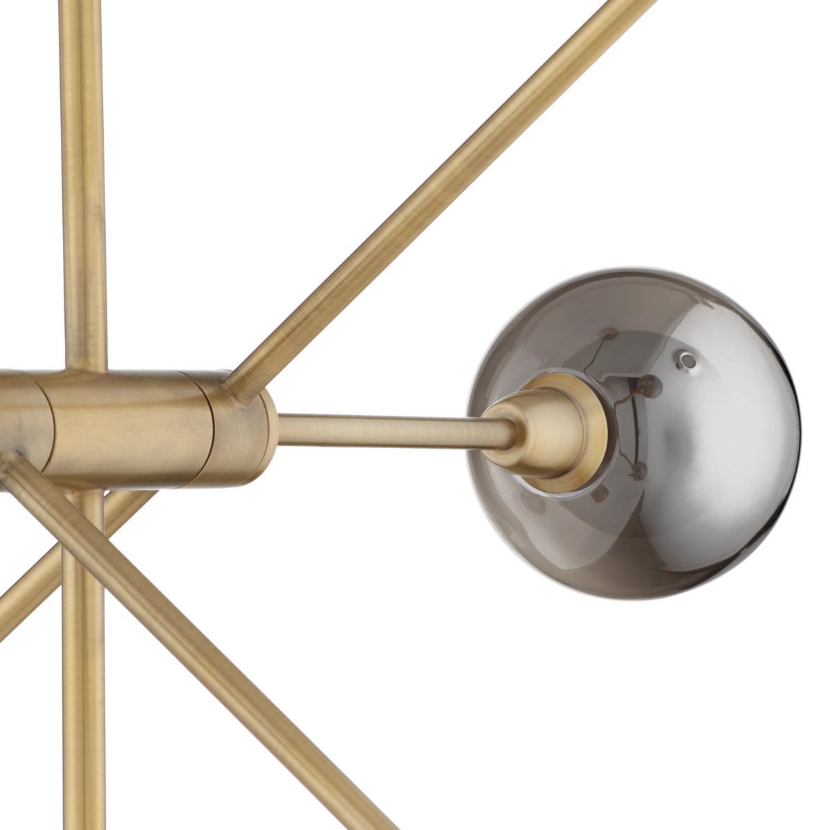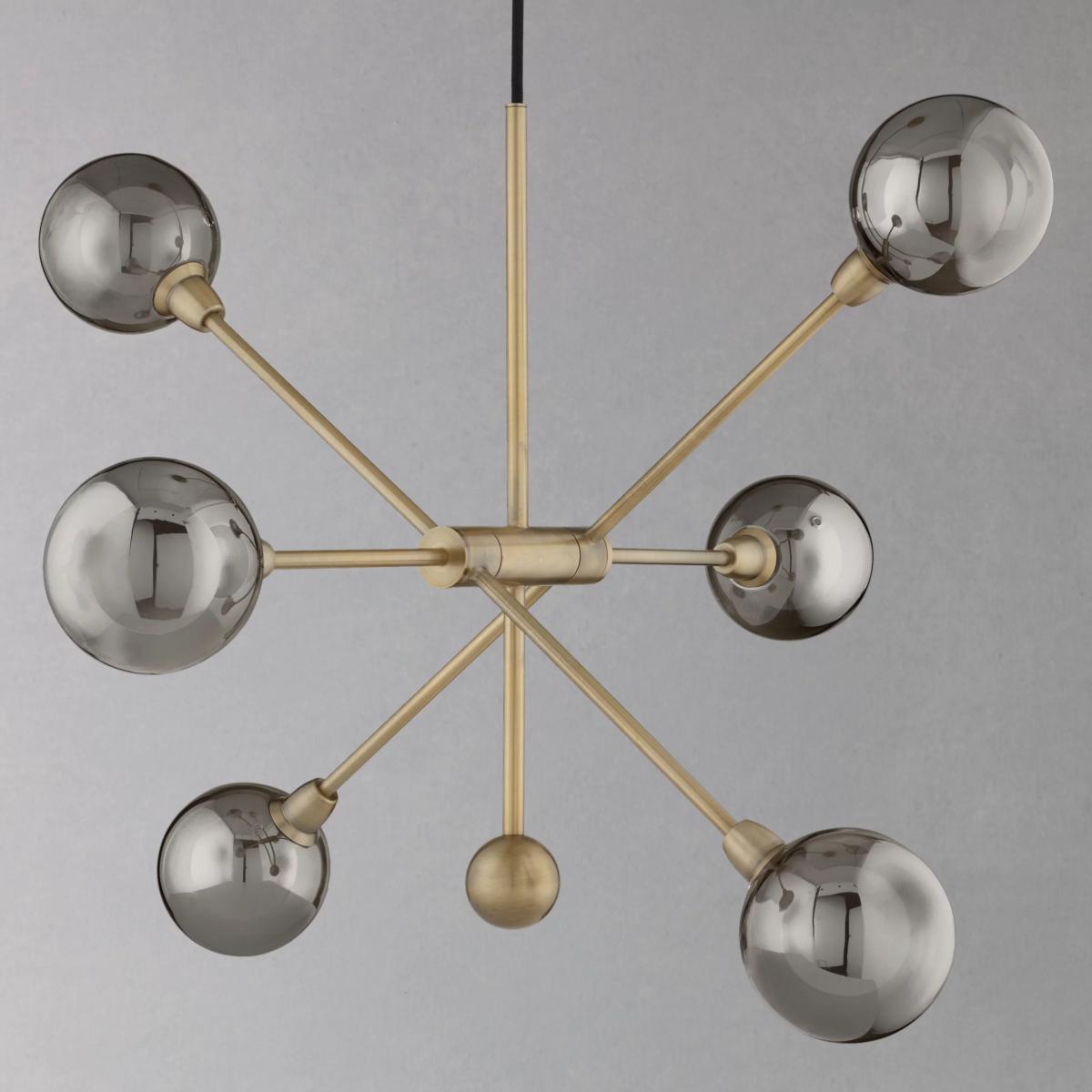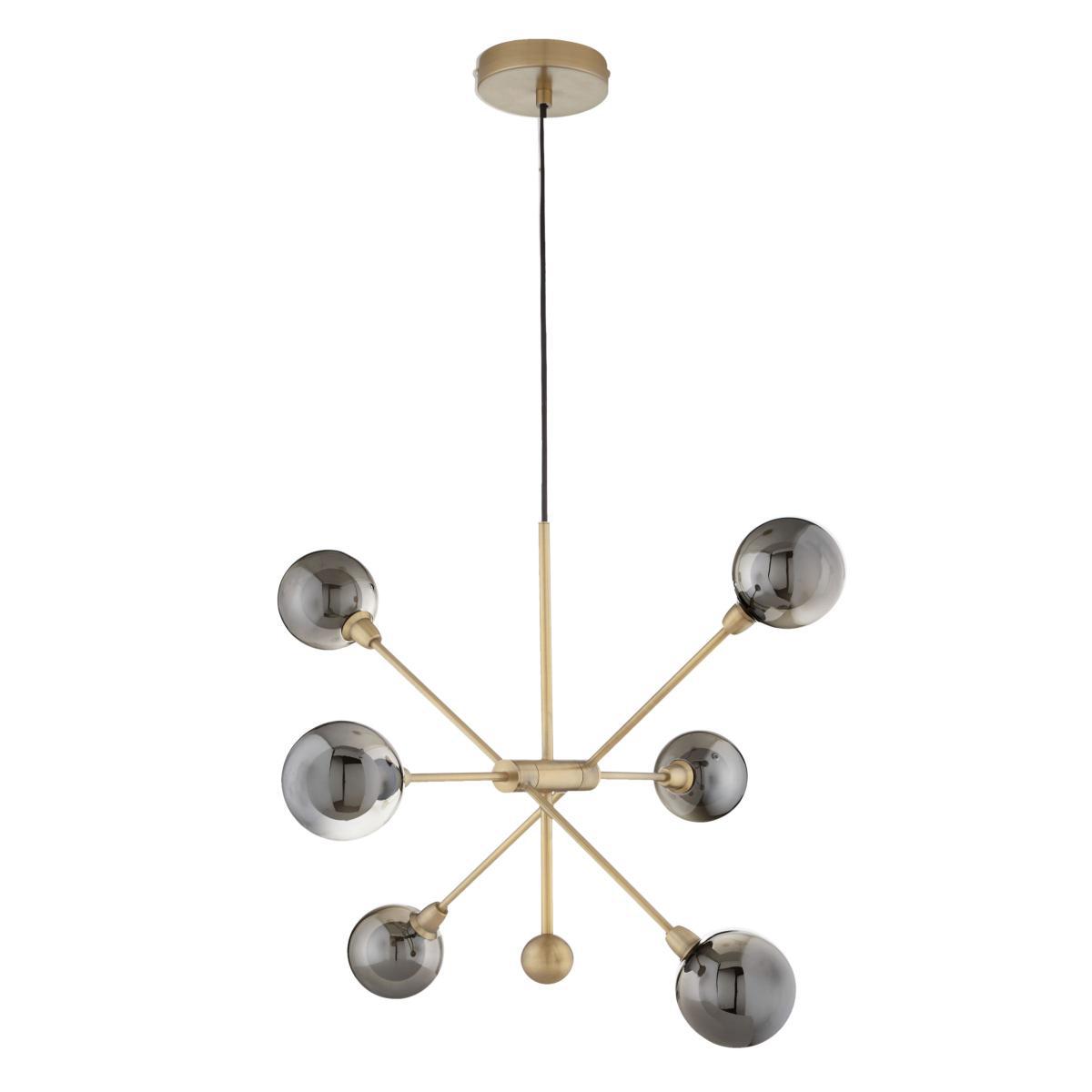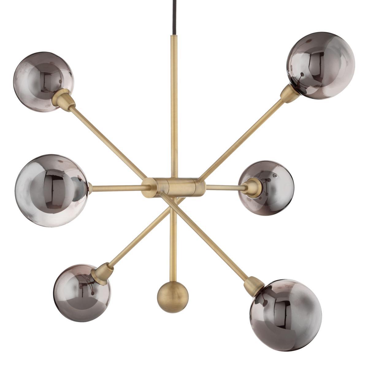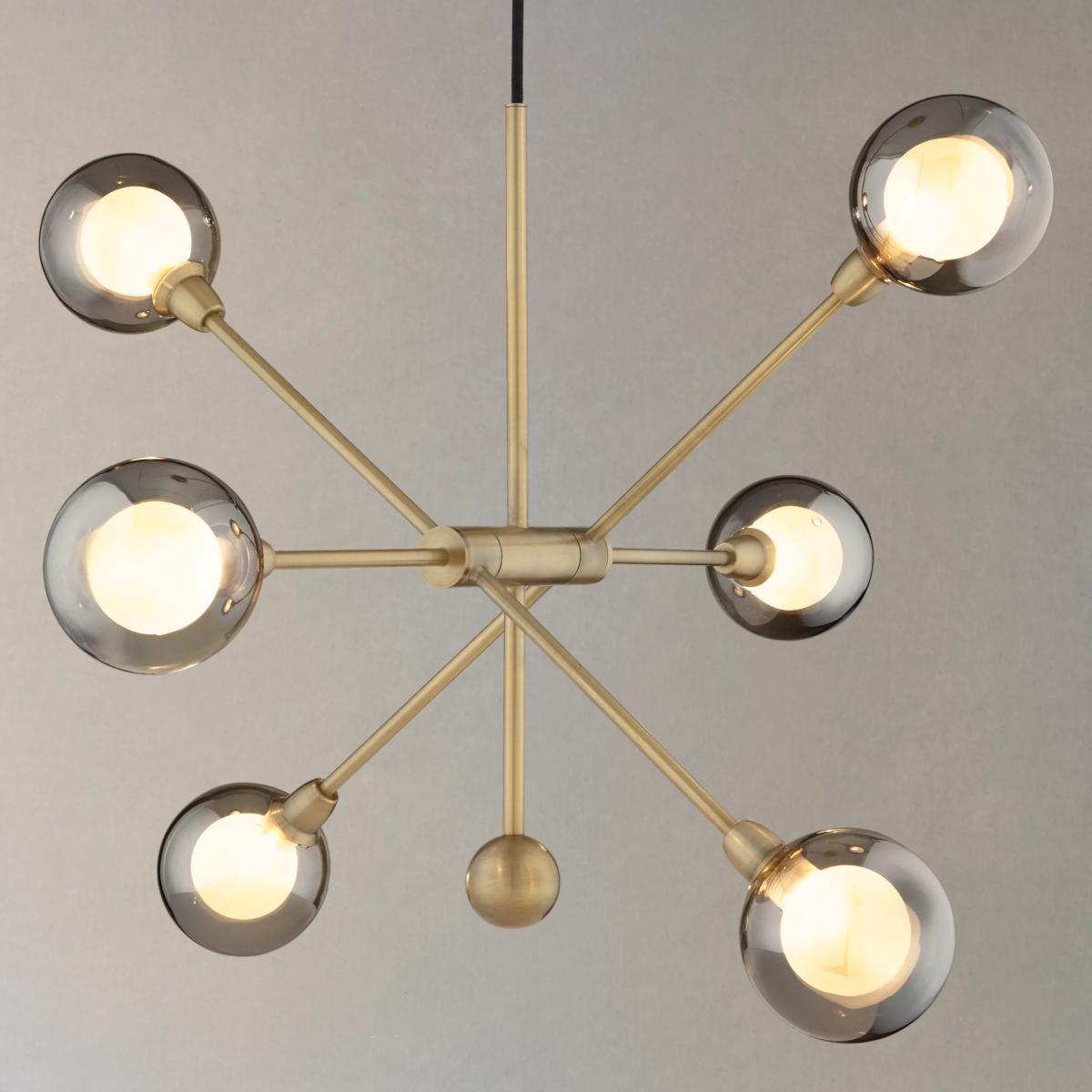 With a striking retro design, our multi-armed Huxley ceiling light provides a bright, yet diffused wash of light. The exposed, smoked glass bulbholders lend a mid-century inspired feel, creating the illusion of larger bulbs, while complementing the antique brass or smoked finish of each arm. Suspended from a fabric cord, it's easy to install and adjust at your chosen height, and will look equally as impressive in your room when switched on or off.