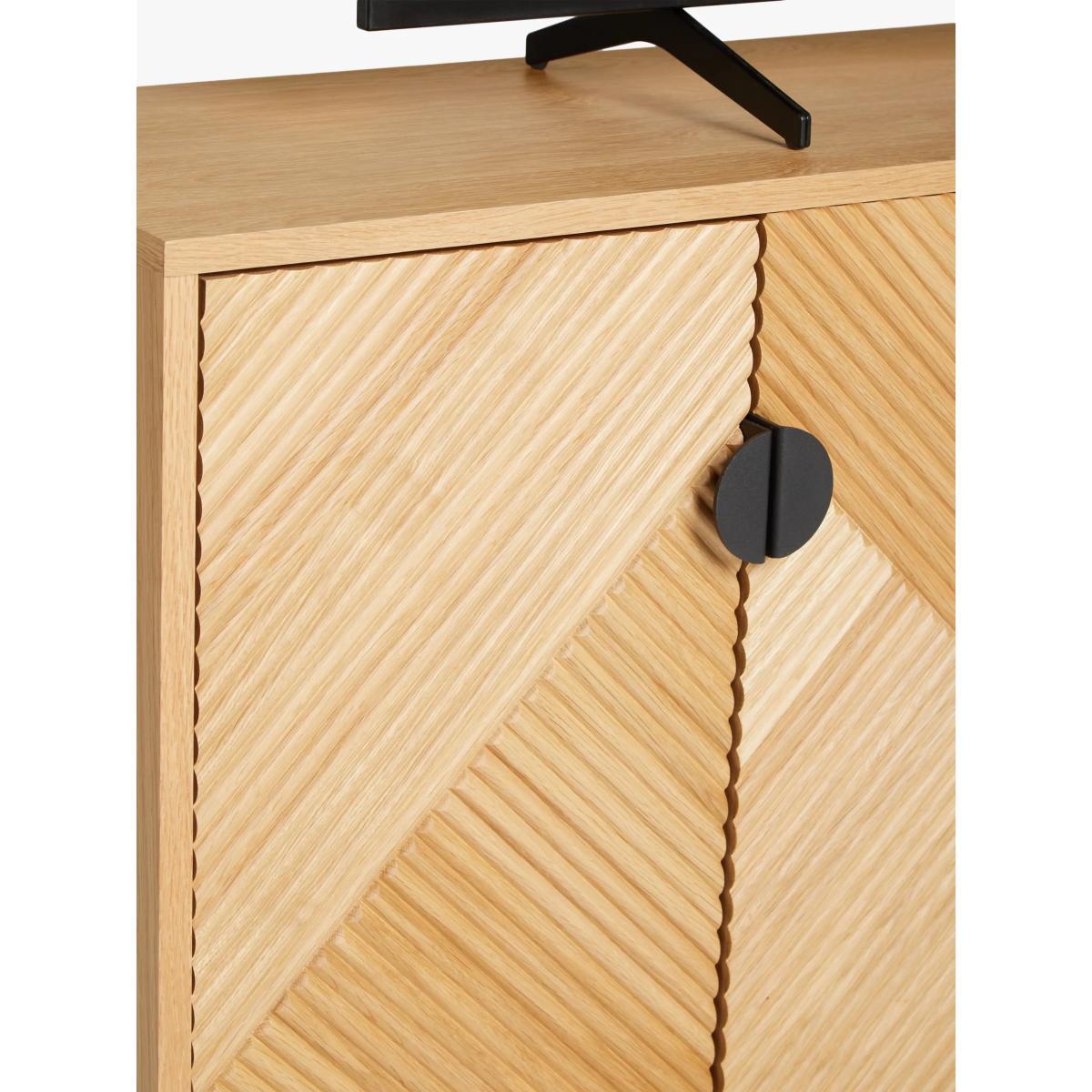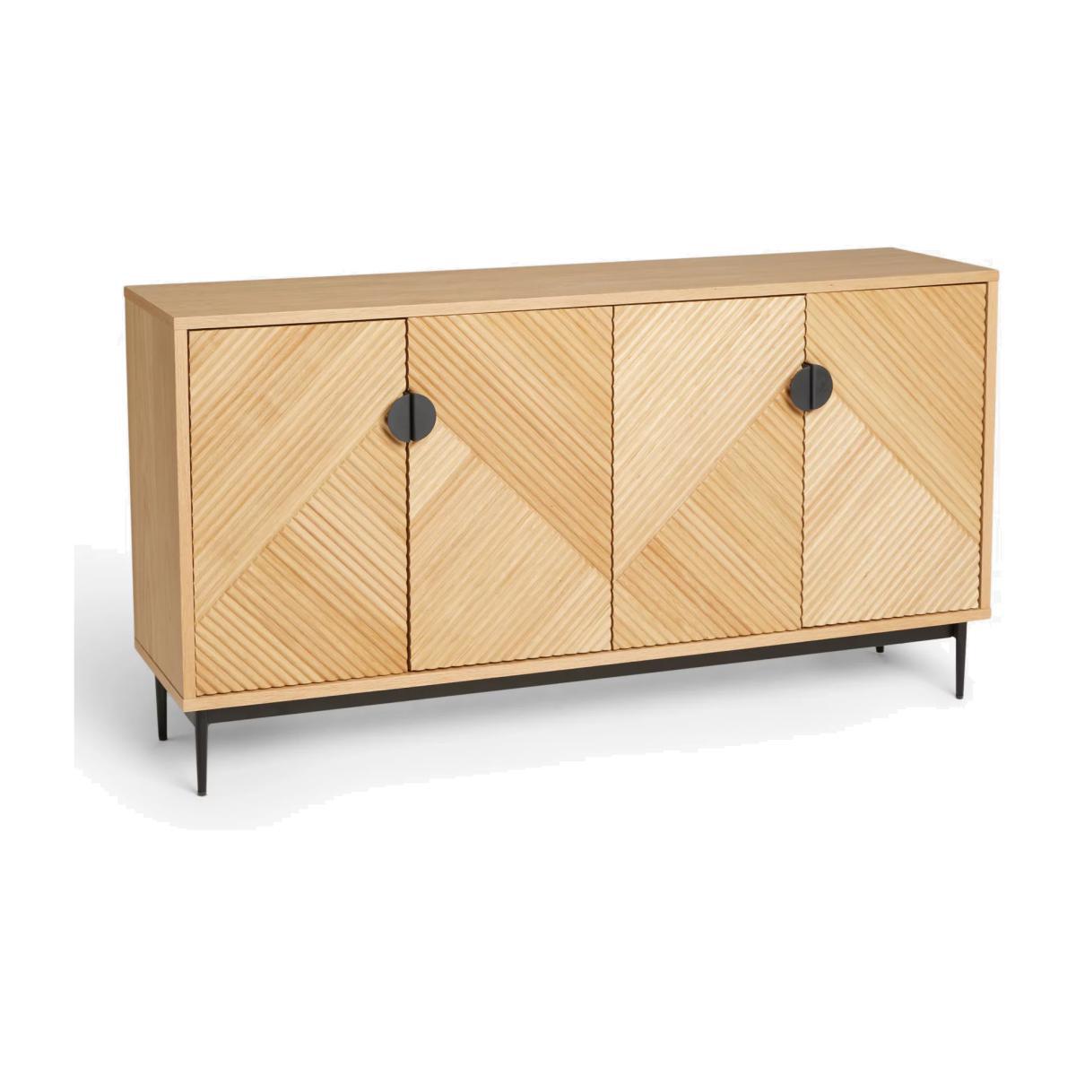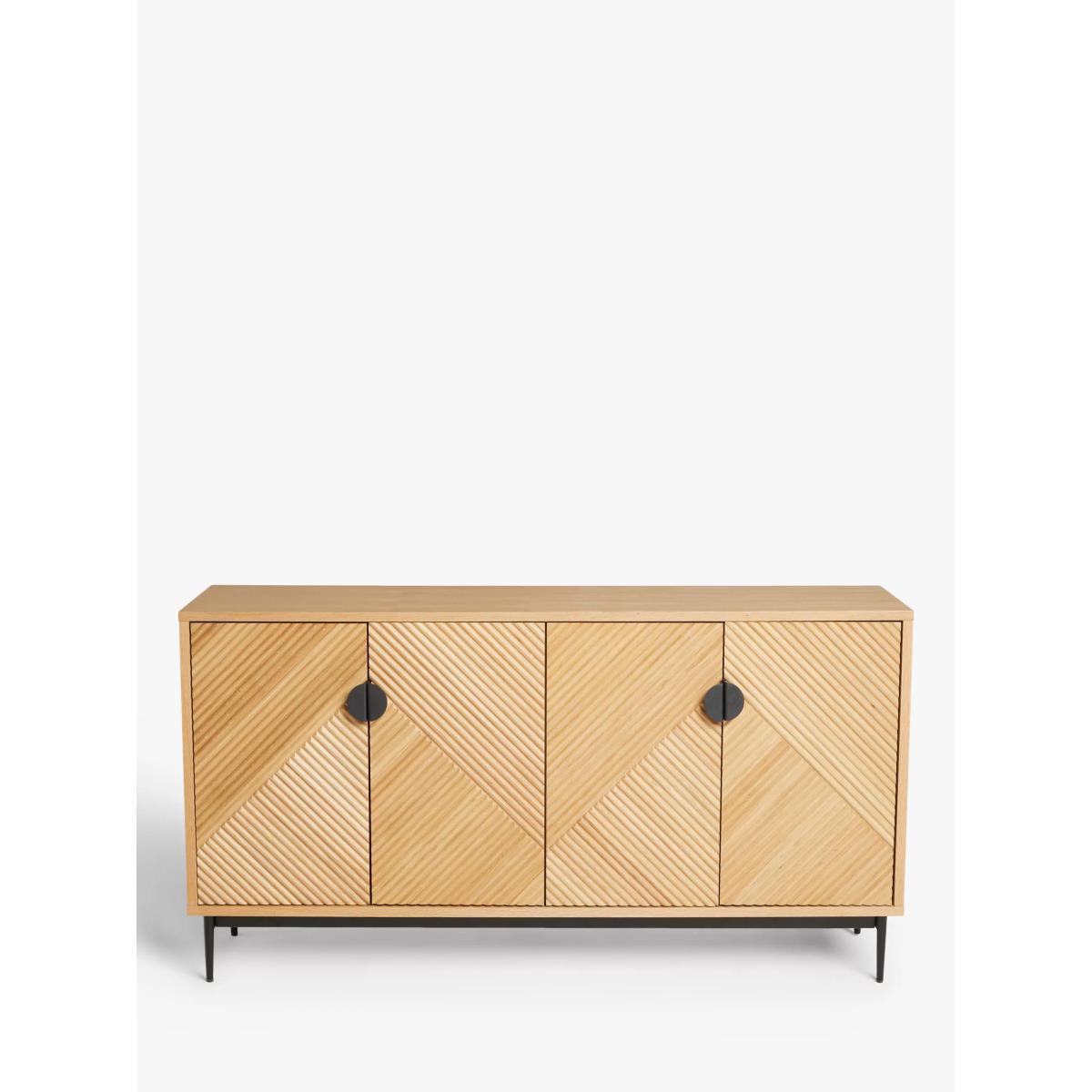 Fill your home with furniture that catches the eye but also keeps your space feeling calm and uncluttered. This spacious sideboard is made from a combination of high-quality timbers, including solid oak and oak veneers, which have naturally warm tones and grains. It's designed with soft-close feature doors that are made with a ridged pattern and assembled in a modern, geometric formation. There's an adjustable shelf inside each cupboard section and we've coated the wood in a varnish for extra durability. Plus, to create a contrast, we've added a black metal base and handles for an on-trend, statement finish. Want to see it first? You may want to see and get a feel for the furniture in one of our shops before ordering. We'll be able to tell you where the range you'd like to view is on display.