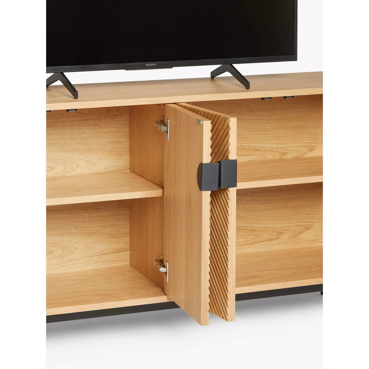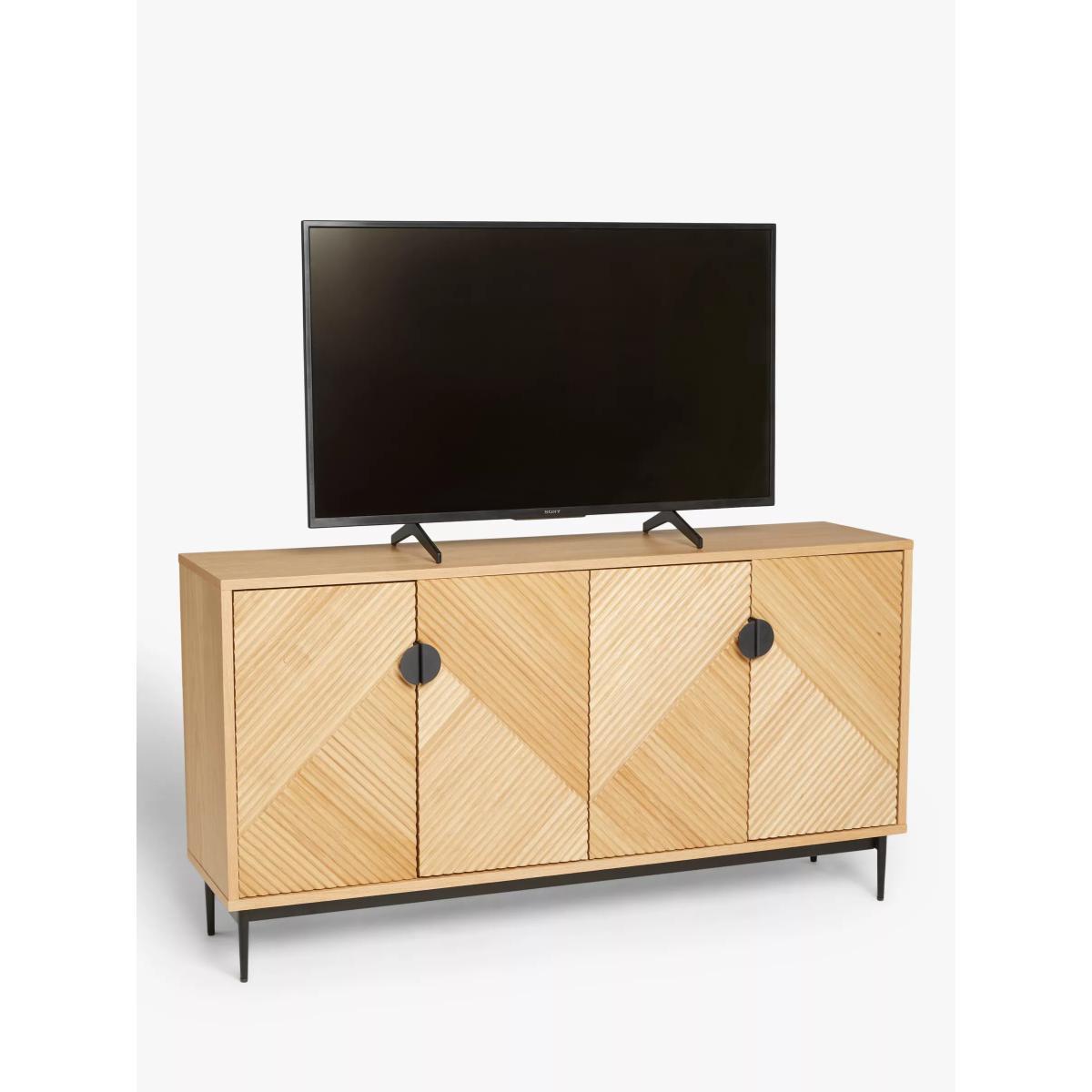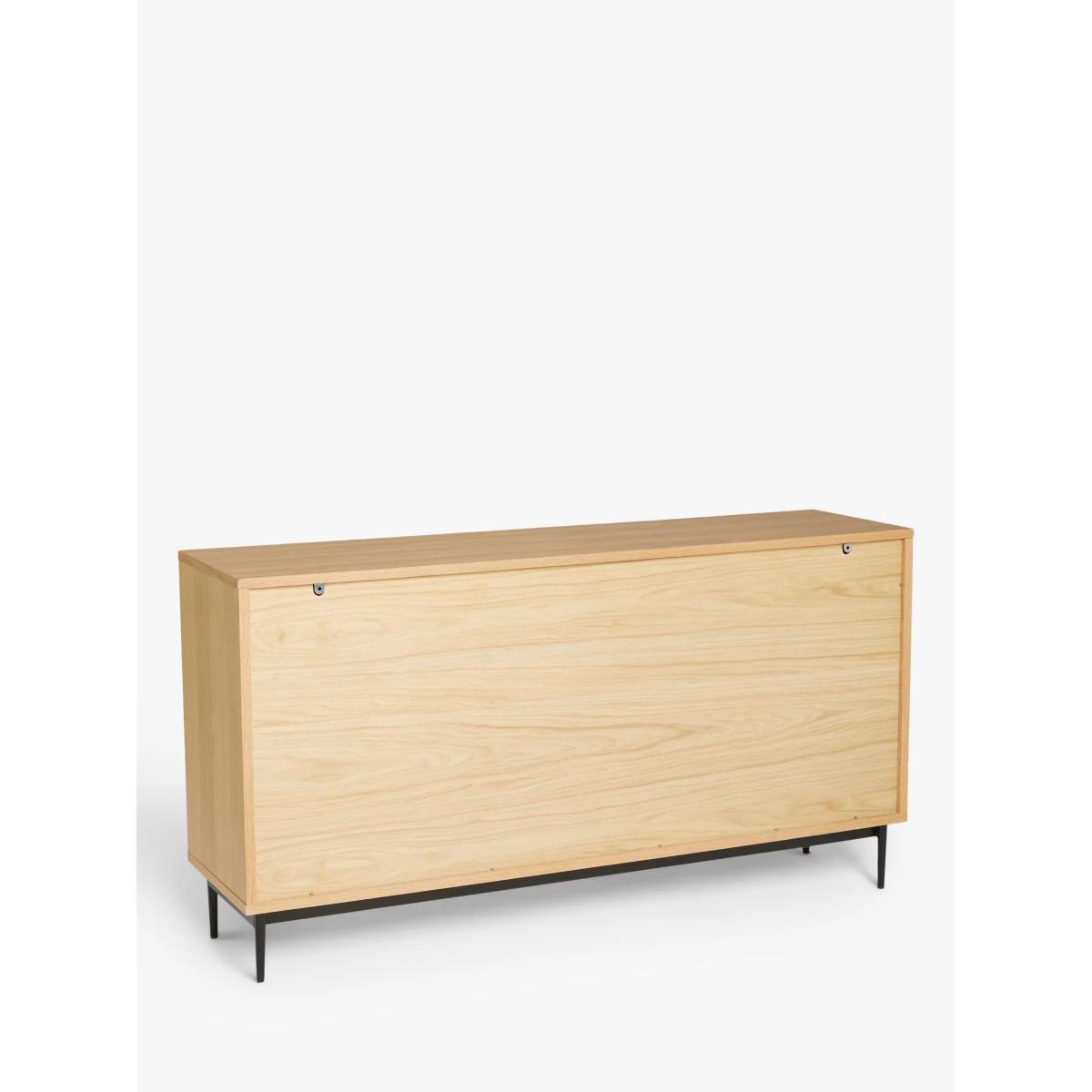 Fill your home with furniture that catches the eye but also keeps your space feeling calm and uncluttered. This spacious sideboard is made from a combination of high-quality timbers, including solid oak and oak veneers, which have naturally warm tones and grains. It's designed with soft-close feature doors that are made with a ridged pattern and assembled in a modern, geometric formation. There's an adjustable shelf inside each cupboard section and we've coated the wood in a varnish for extra durability. Plus, to create a contrast, we've added a black metal base and handles for an on-trend, statement finish. Want to see it first? You may want to see and get a feel for the furniture in one of our shops before ordering. We'll be able to tell you where the range you'd like to view is on display.