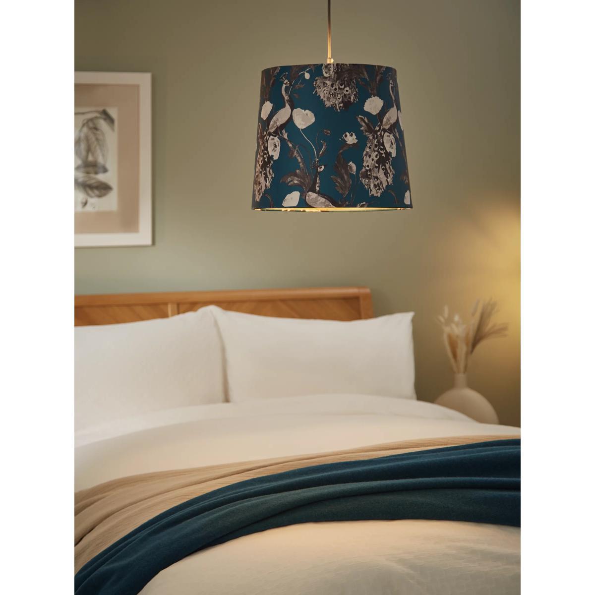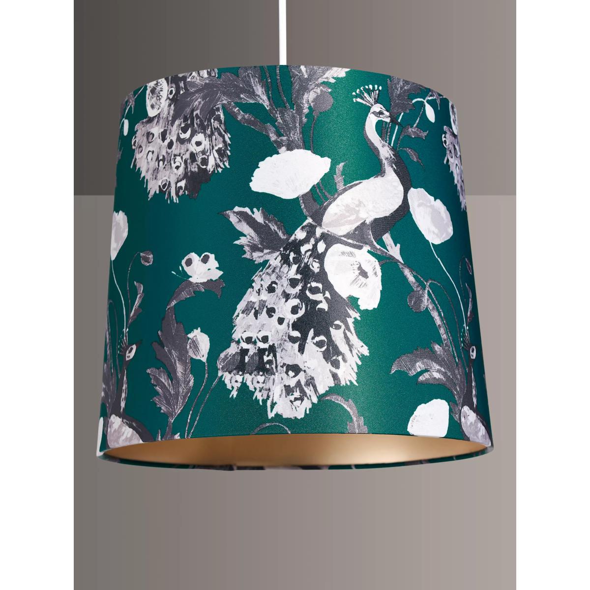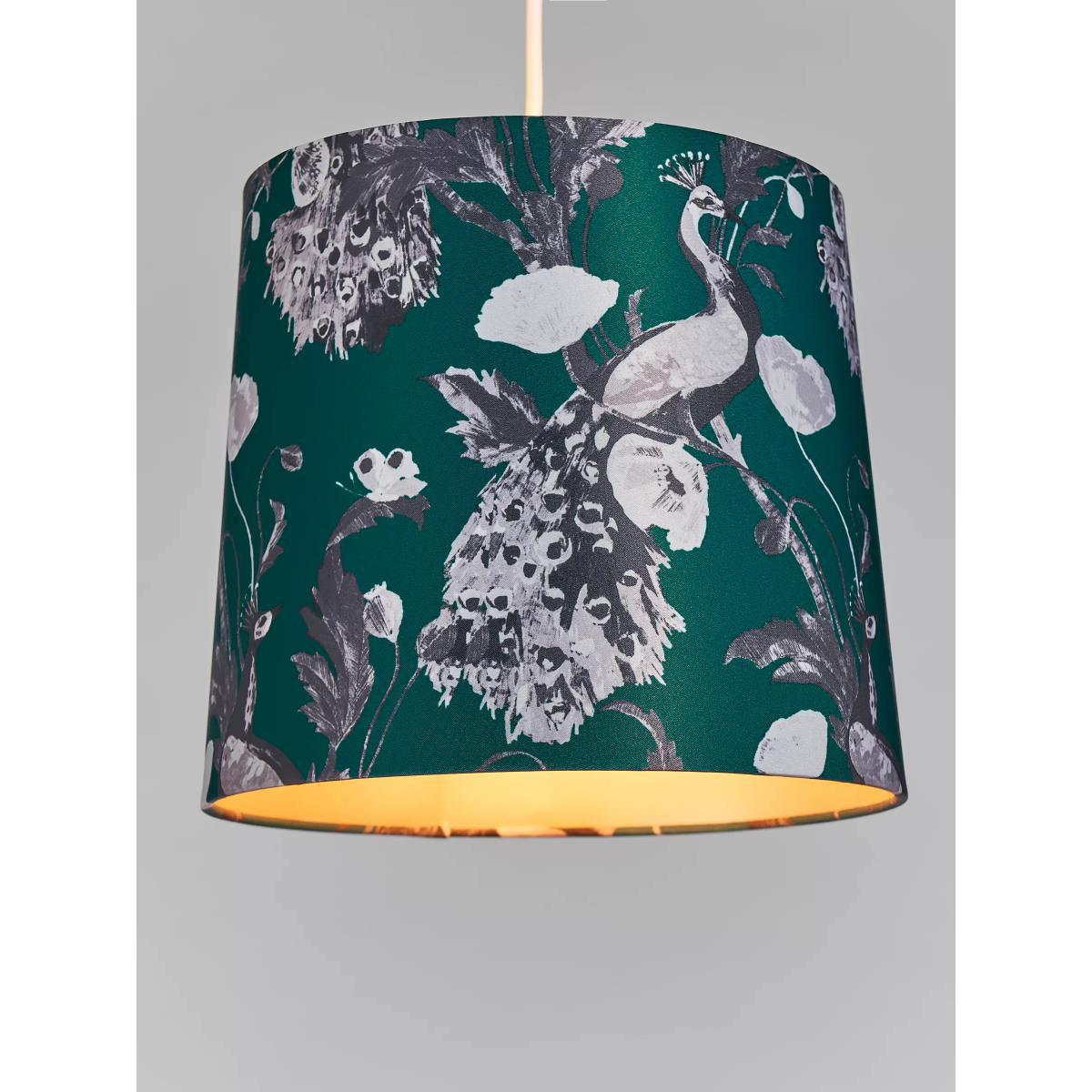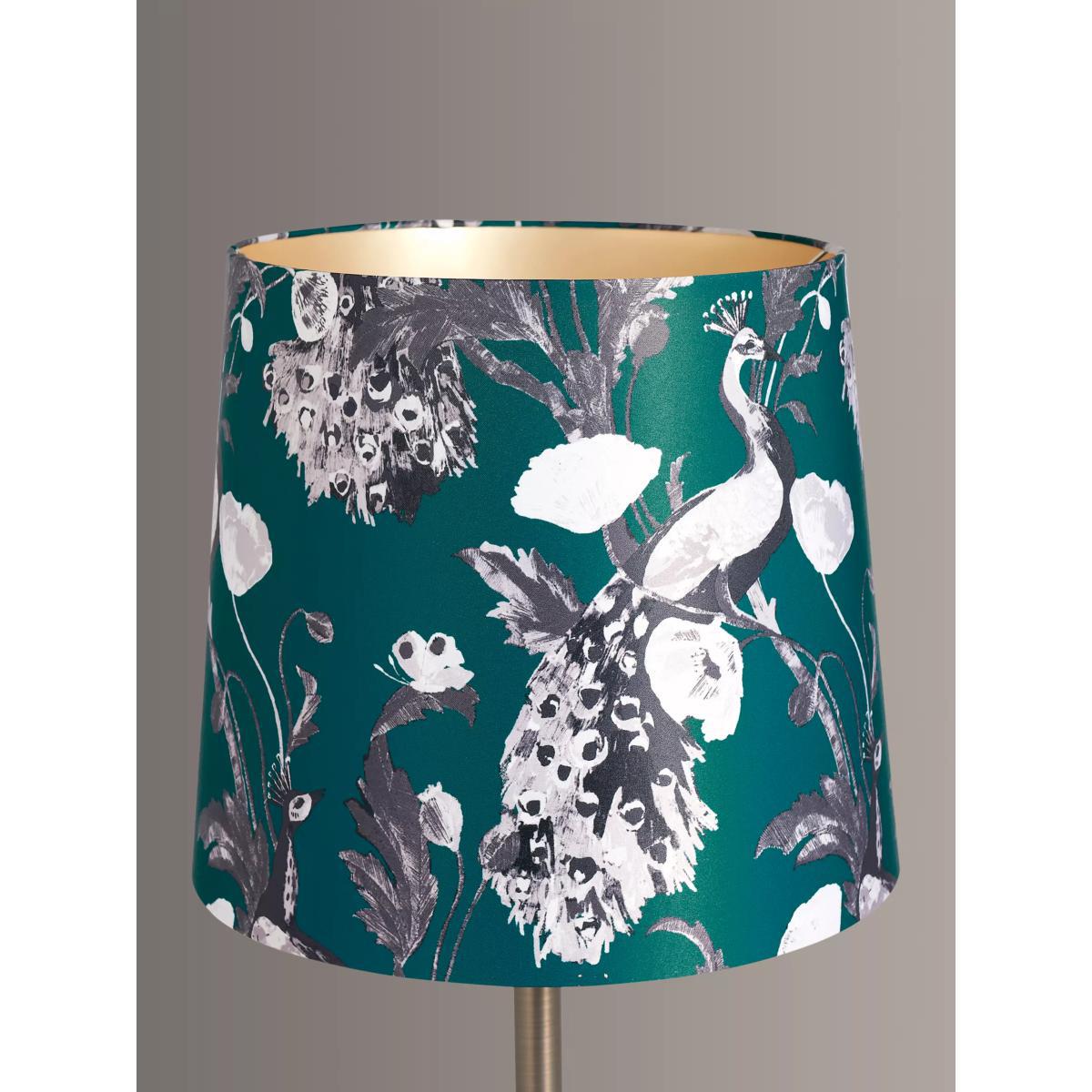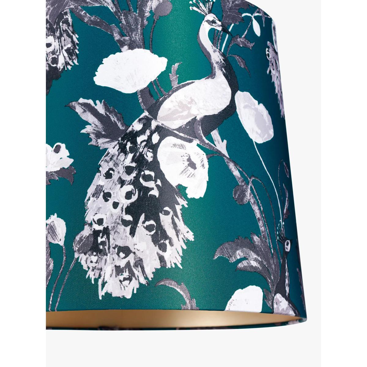 This gently tapered lampshade is made in a satin polyester fabric and digitally printed with a striking floral and peacock pattern. We like the metallic card lining which helps to reflect light and create a warm glow. It's sure to instantly dress up simple lamp bases or ceiling fittings.
