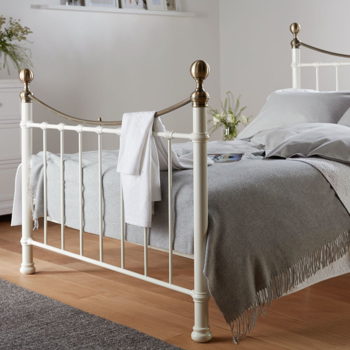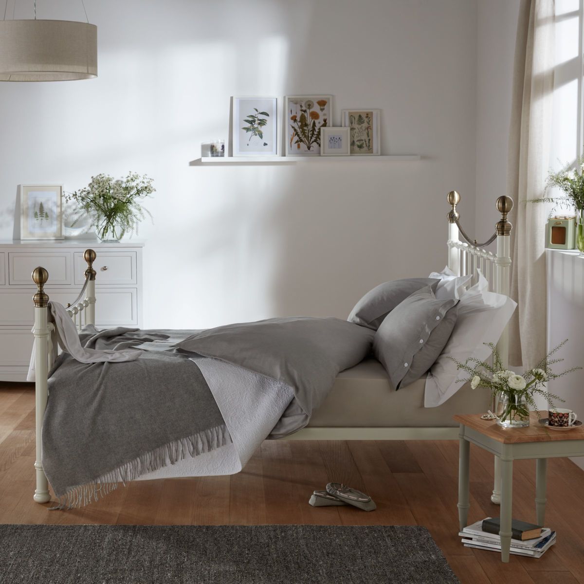 Boasting a traditional yet timeless powder coated metal frame, our Jayne bed features classic lines at the head and foot, elegant rounded feet and beautiful brass tone detailing. And, with a sprung slat base, you'll experience a more responsive level of support throughout the night. Instantly imparting a country feel, why not layer the bed frame with pretty floral bedding and chunky knit accessories to truly take on the trend and create your very own rural retreat, whatever your location. Taking us to a relaxed and cosy country farmhouse, Relaxed Country is a very inviting environment with easy to live with distressed finishes and textiles. Its patterns are heavily influenced from nature, florals are soft and fluid. Colours are fresh and neutral.