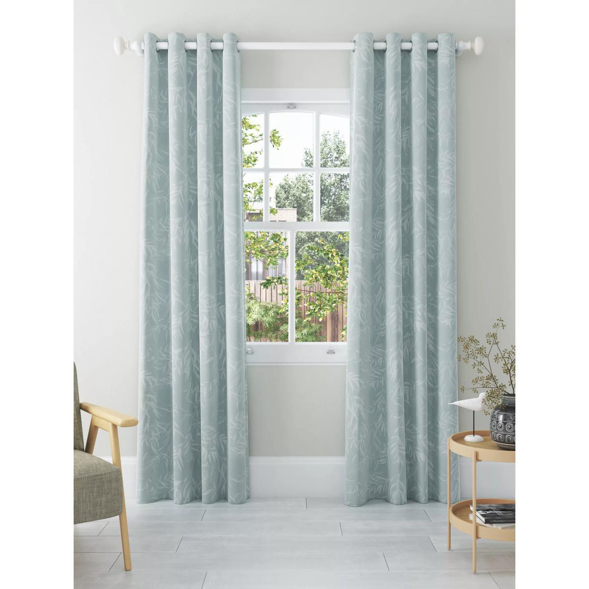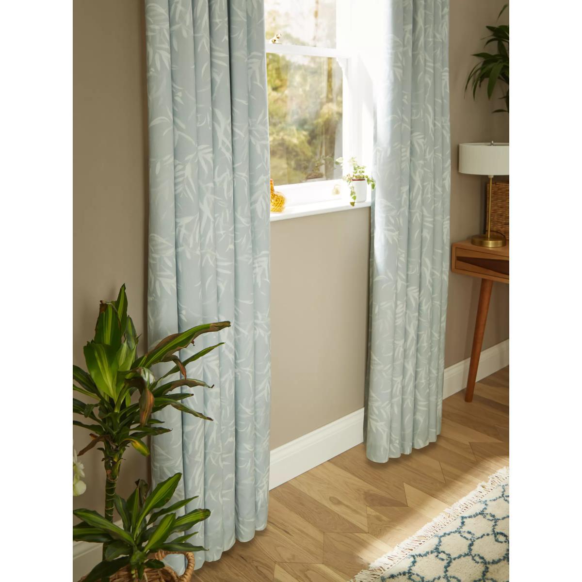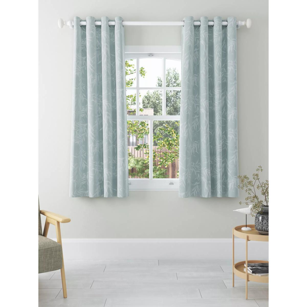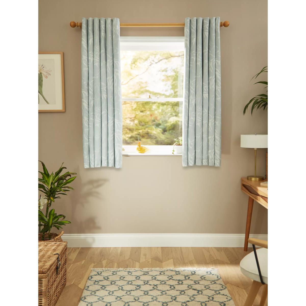 In a calming duck egg blue, our Karri curtains feature overlapping, trailing leaves, coloured in different shades to create depth. The eyelet heading gives them a more contemporary look with large, even folds and the blackout lining eliminates light and lends a full look to the curtains, improving the drape and enhancing the vibrancy of the pattern. By buying cotton products from John Lewis & Partners, you're supporting more sustainable cotton farming through the Better Cotton Initiative. BCI is a not-for-profit organisation which exists to make global cotton production better for the people who produce it, better for the environment it grows in, and better for the sector's future. BCI works with partners around the world such as WWF, Solidaridad and Cotton Connect to train farmers to produce cotton more sustainably. Better Cotton is sourced via a principle of mass balance and is not physically traceable to end products. However, BCI Farmers benefit from the demand for Better Cotton in equivalent volumes to those we source. Learn more about mass balance here. Warm in winter, cool in summer As the blackout lining on these curtains blocks out sunlight they help keep your room cool as well as dark. This lining also adds an extra layer of insulation to the curtains, giving them the added benefit of being thermal. They protect against both heat loss and heat gain, regulating the temperature of your room so you're kept warm in winter and cool in summer. The width stated indicates the size of one curtain panel when laid completely flat. This pack contains two panels and the track/pole length we've recommended allows for the two panels to be gathered when the curtains are drawn. For a fuller look, increase the curtain width. One pair of 117cm width curtains will fit a curtain track/pole size 117-167cm One pair of 167cm width curtains will fit a curtain track/pole size 133-167cm One pair of 228cm width curtains will fit a curtain track/pole size 182-228cm Worth knowing... We package our curtains in recycled materials to keep them protected whilst they make their way to you. This means that when they arrive there could be some creases in them. We recommend you hang them for a few days to allow them to flatten and for the creases to fall out. If after this period your curtains still show signs of being folded then follow the ironing instructions on the back of the packaging. Be aware that each style of curtain has different ironing instructions, including heat limitations according to the fabric, so do make sure you follow the guidance provided to get the best results. Do you need a curtain pole and accessories? Shop them here.