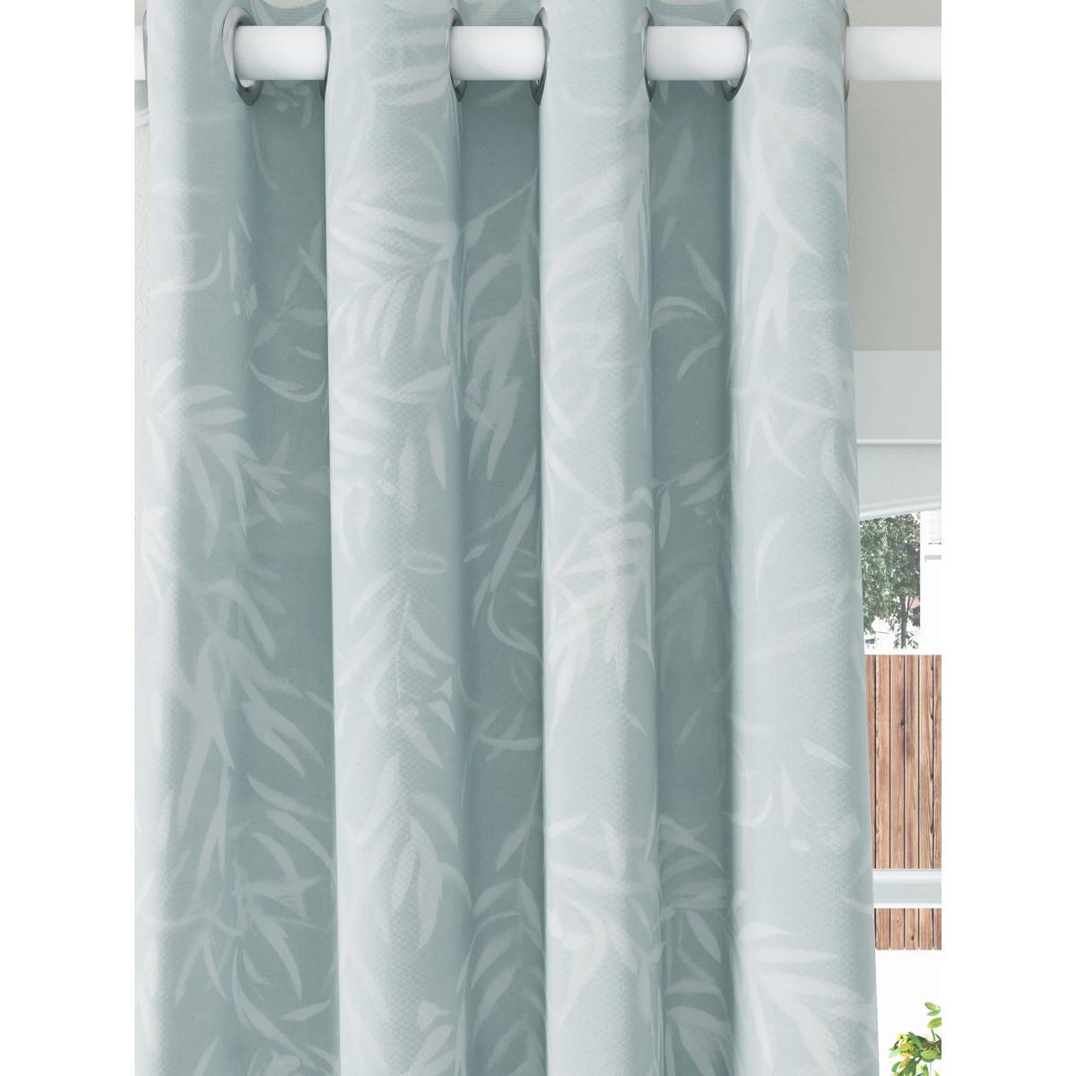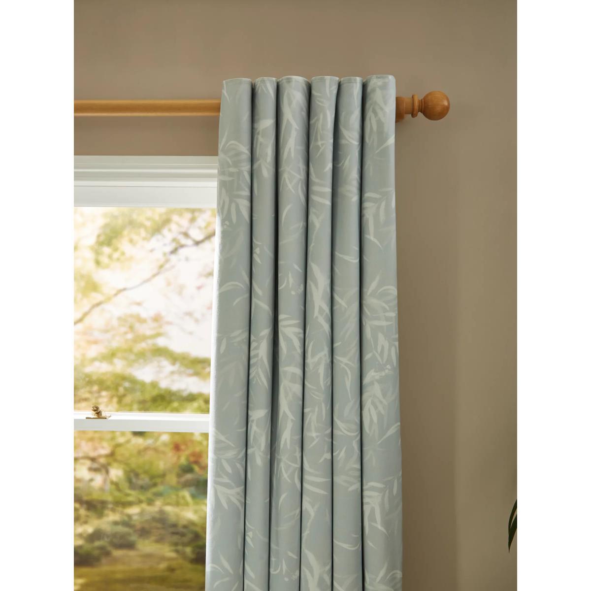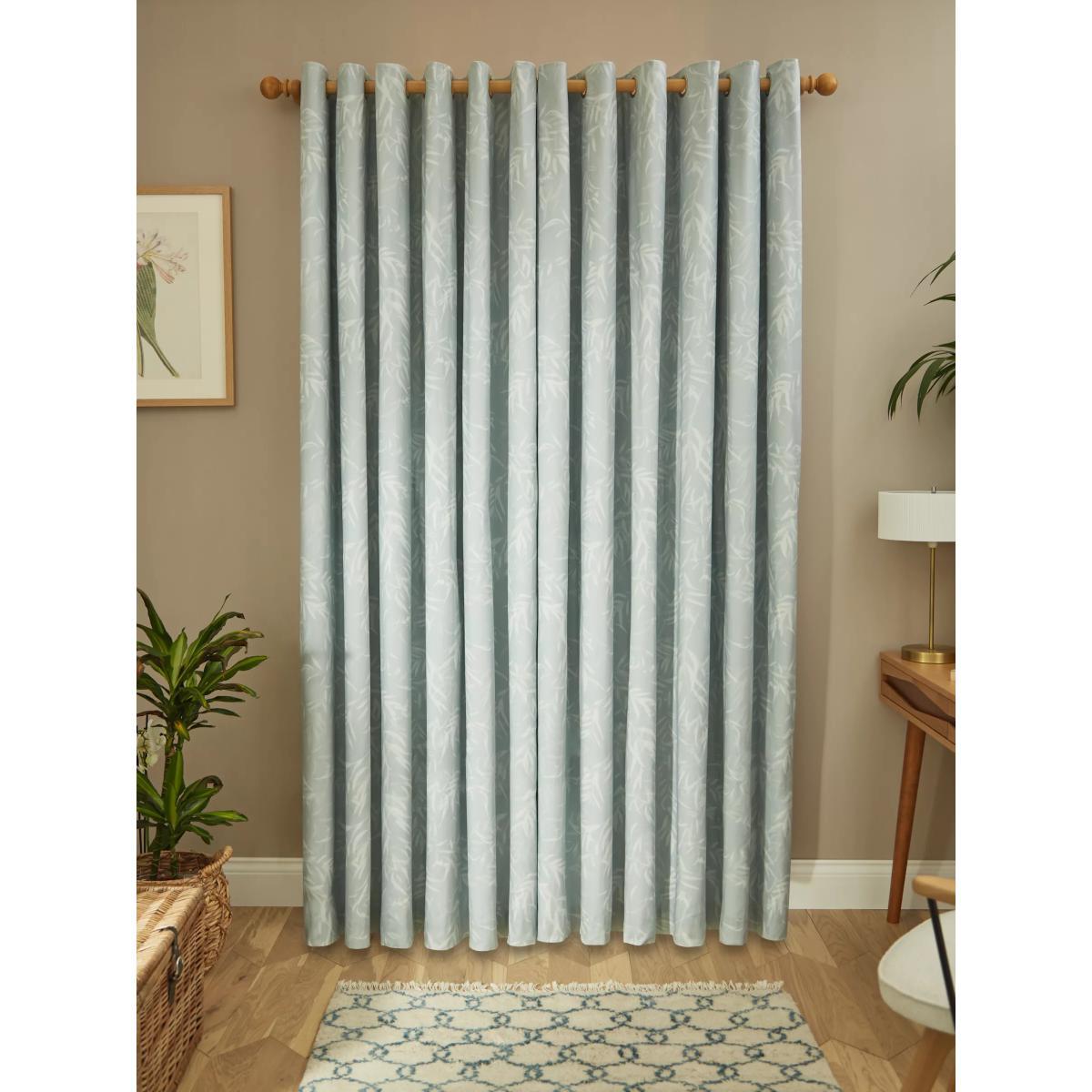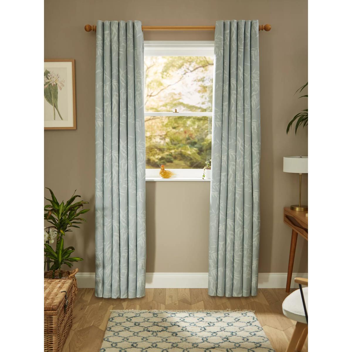 In a calming duck egg blue, our Karri curtains feature overlapping, trailing leaves, coloured in different shades to create depth. The eyelet heading gives them a more contemporary look with large, even folds and the blackout lining eliminates light and lends a full look to the curtains, improving the drape and enhancing the vibrancy of the pattern. By buying cotton products from John Lewis & Partners, you're supporting more sustainable cotton farming through the Better Cotton Initiative. BCI is a not-for-profit organisation which exists to make global cotton production better for the people who produce it, better for the environment it grows in, and better for the sector's future. BCI works with partners around the world such as WWF, Solidaridad and Cotton Connect to train farmers to produce cotton more sustainably. Better Cotton is sourced via a principle of mass balance and is not physically traceable to end products. However, BCI Farmers benefit from the demand for Better Cotton in equivalent volumes to those we source. Learn more about mass balance here. Warm in winter, cool in summer As the blackout lining on these curtains blocks out sunlight they help keep your room cool as well as dark. This lining also adds an extra layer of insulation to the curtains, giving them the added benefit of being thermal. They protect against both heat loss and heat gain, regulating the temperature of your room so you're kept warm in winter and cool in summer. The width stated indicates the size of one curtain panel when laid completely flat. This pack contains two panels and the track/pole length we've recommended allows for the two panels to be gathered when the curtains are drawn. For a fuller look, increase the curtain width. One pair of 117cm width curtains will fit a curtain track/pole size 117-167cm One pair of 167cm width curtains will fit a curtain track/pole size 133-167cm One pair of 228cm width curtains will fit a curtain track/pole size 182-228cm Worth knowing... We package our curtains in recycled materials to keep them protected whilst they make their way to you. This means that when they arrive there could be some creases in them. We recommend you hang them for a few days to allow them to flatten and for the creases to fall out. If after this period your curtains still show signs of being folded then follow the ironing instructions on the back of the packaging. Be aware that each style of curtain has different ironing instructions, including heat limitations according to the fabric, so do make sure you follow the guidance provided to get the best results. Do you need a curtain pole and accessories? Shop them here.