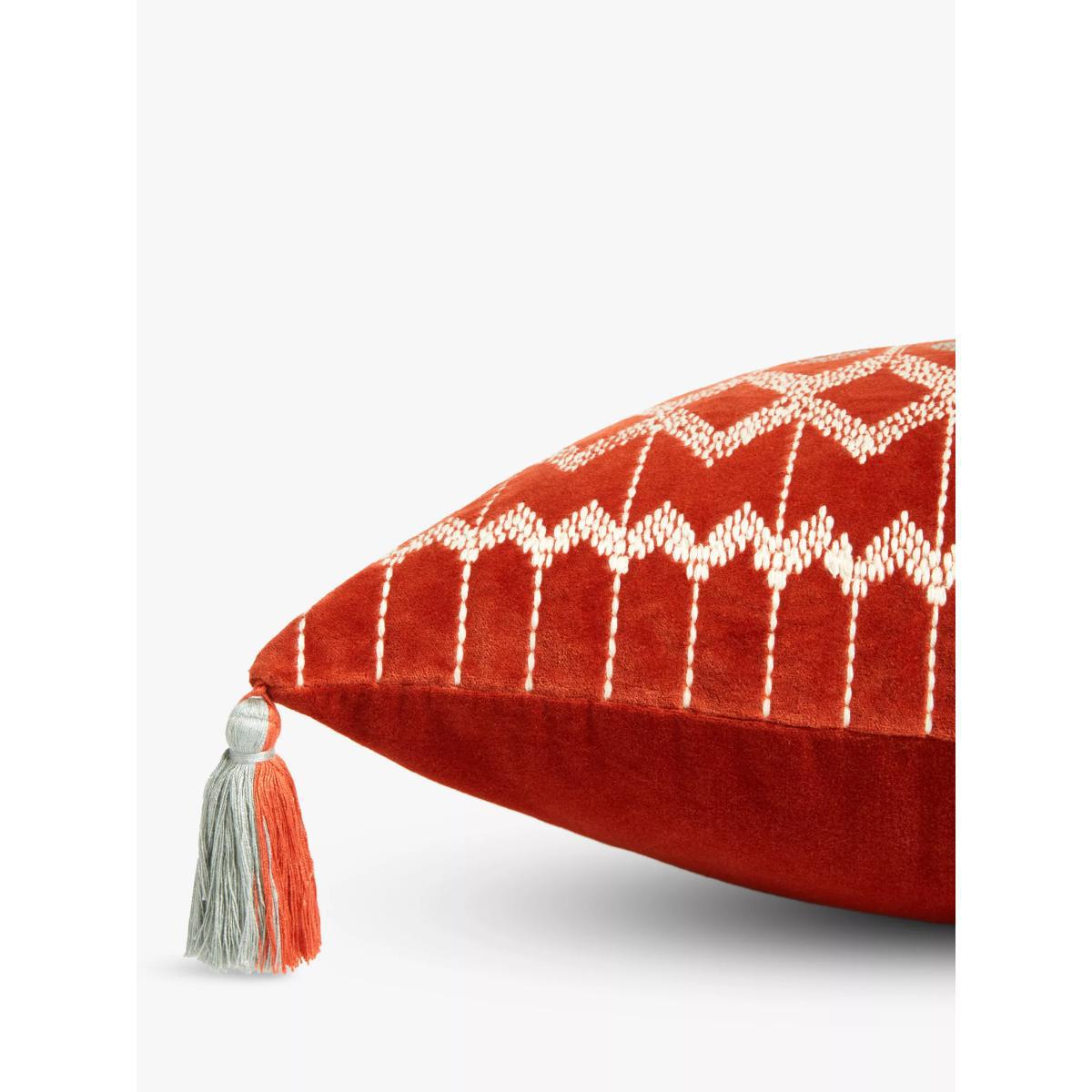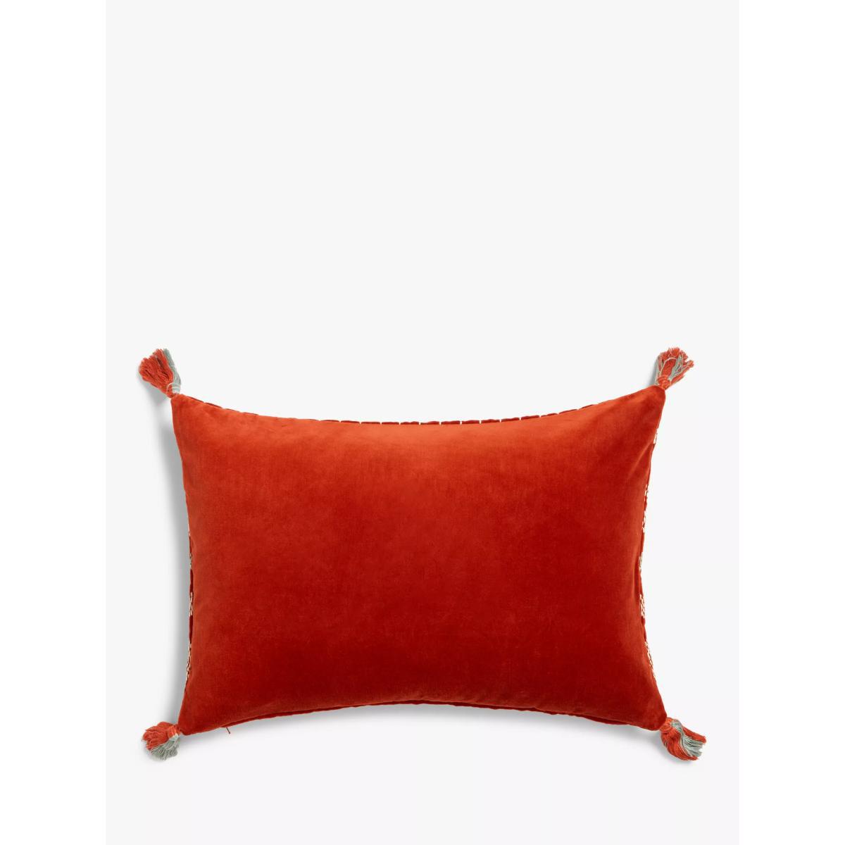 Kuva is an attractive bolster cushion that features machine guided embroidery on a plush velvet background. It's finished with soft tassels at each corner.