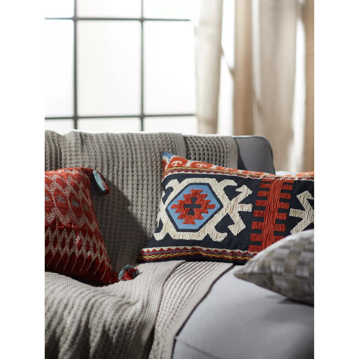 I love this because it adds a vibrant splash of colour and pattern to both modern and eclectic interiors. The textured design is versatile enough to complement neutral sofas or beds, but also works well as a statement piece paired with other bold accents. For practical styling, consider layering it with more understated cushions for a balanced look, or using it on a textured fabric sofa to enhance its tactile appeal. It's also a great choice for creating a cosy nook or adding visual interest to a monochrome scheme, making it a versatile and stylish addition to any living space.
