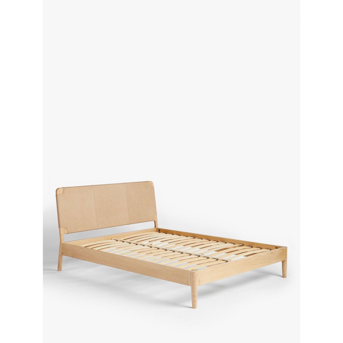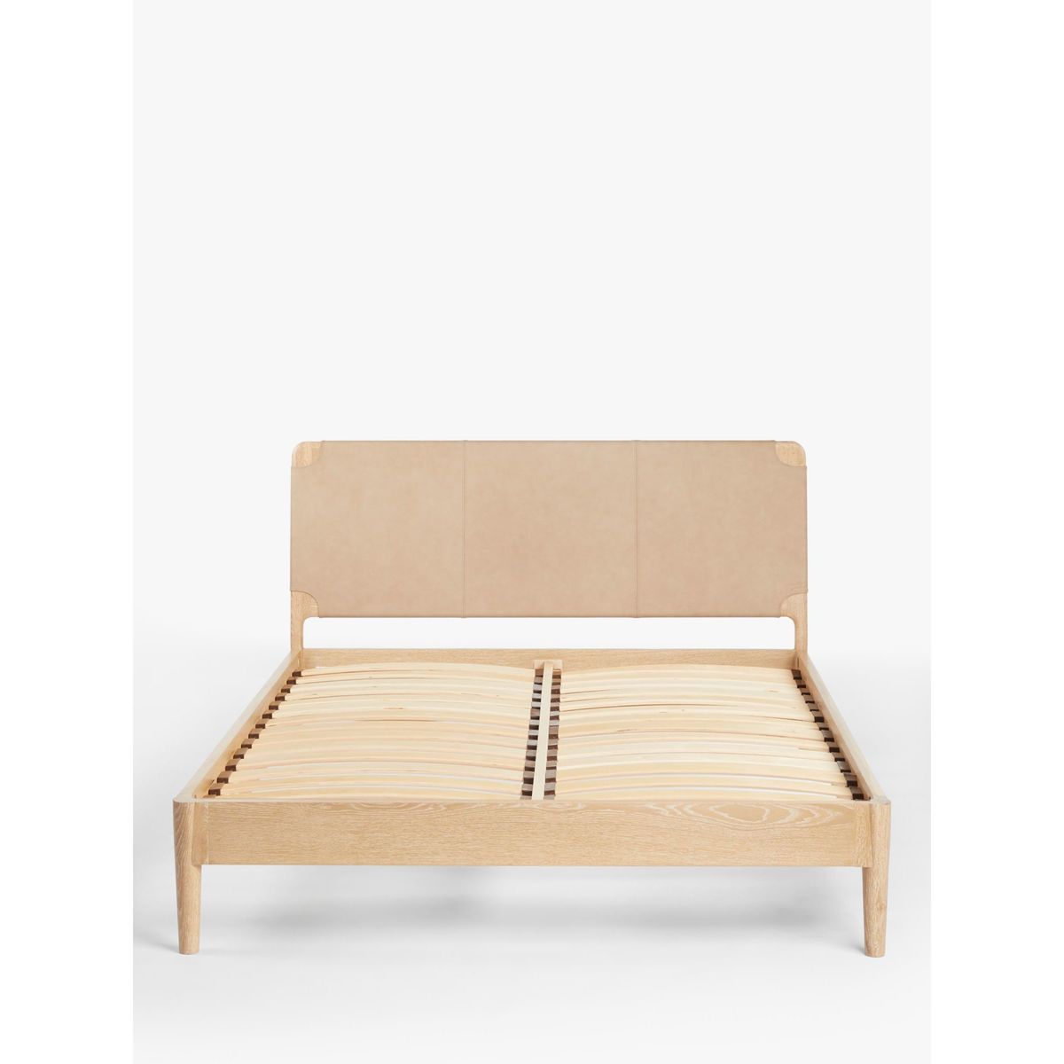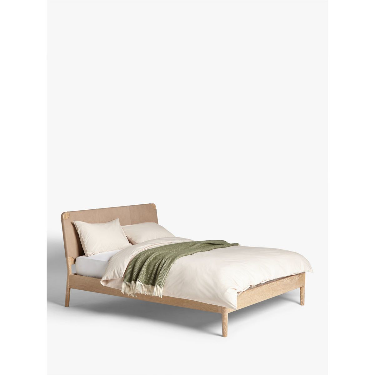 This bed frame is made from a sturdy combination of solid white oak and MDF. Its sleek design incorporates rounded edges for a refined style and it's finished in a lacquer for durability. The headboard is adorned with a soft leather padding that slings over the frame and complements the natural wood grain for a tactile and pared-back look. Sprung slats in the base provide additional support for you and your mattress. Worth knowing;As leather is a natural product, there are natural characteristics on each leather hide used on this bed frame. These could be things like brand marks, insect bites or wrinkles. There may be some slight colour variation, however, we have strict guidelines to make sure any noticeable marks aren't in a prominent place. These distinctive qualities also mean that no two pieces of leather furniture will be exactly the same.