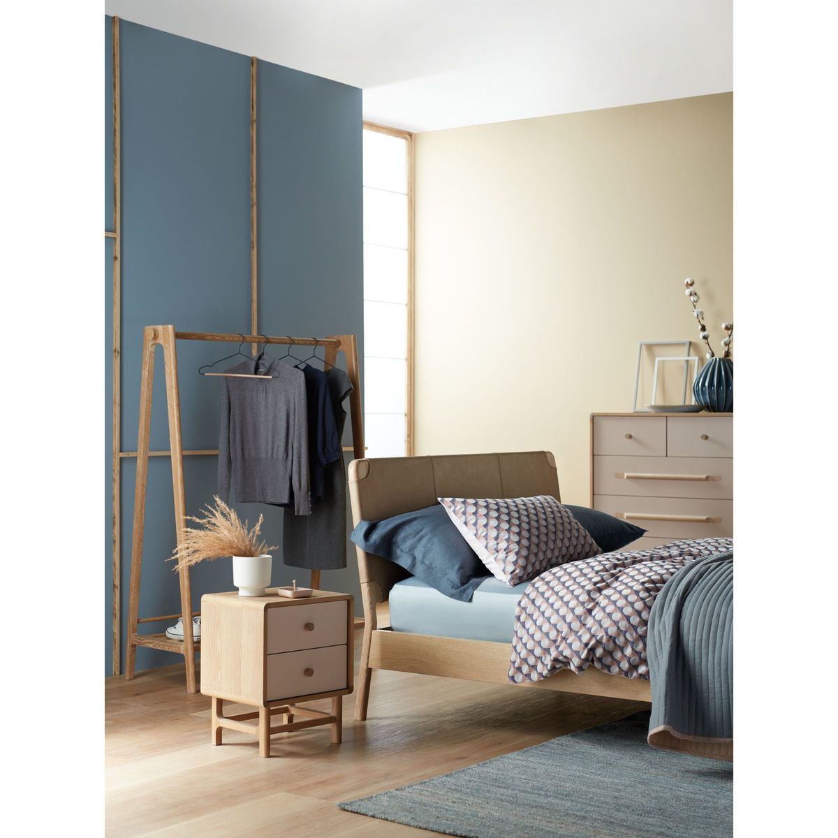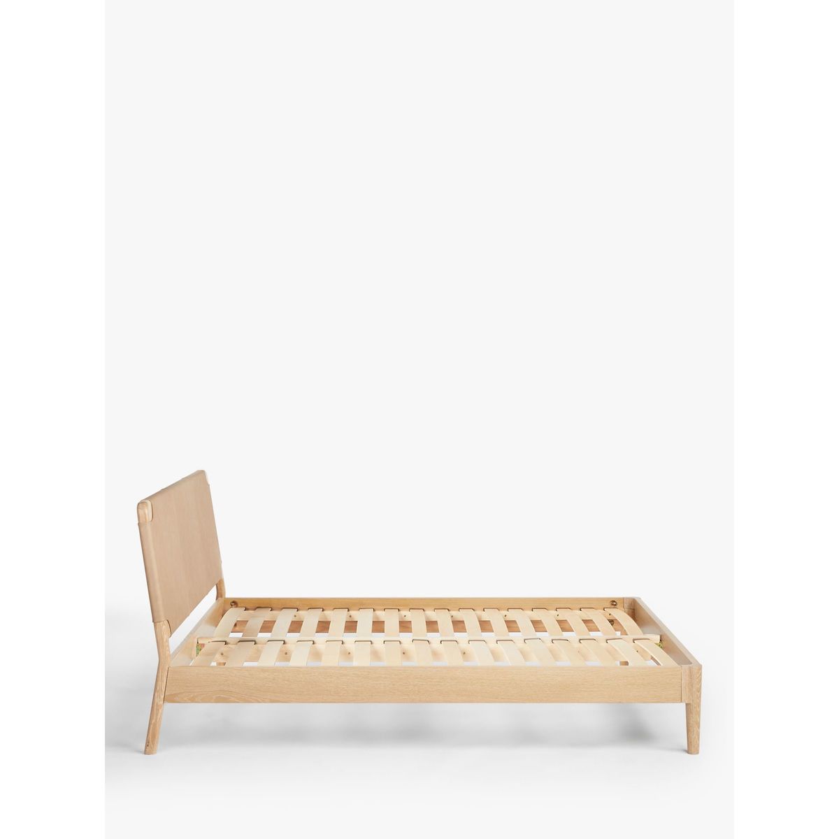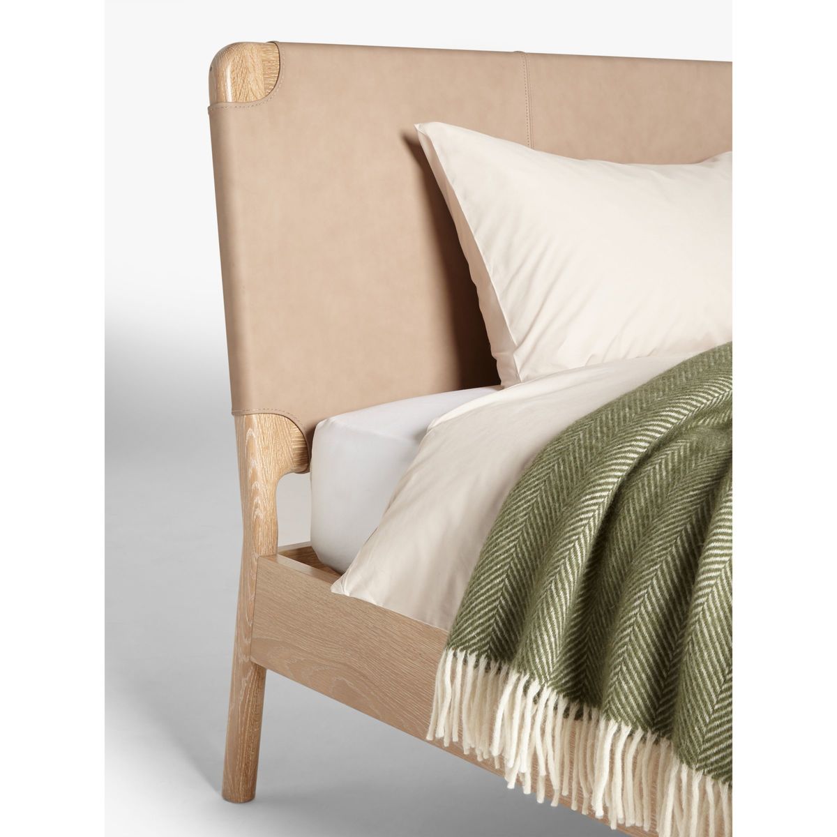 This bed frame is made from a sturdy combination of solid white oak and MDF. Its sleek design incorporates rounded edges for a refined style and it's finished in a lacquer for durability. The headboard is adorned with a soft leather padding that slings over the frame and complements the natural wood grain for a tactile and pared-back look. Sprung slats in the base provide additional support for you and your mattress. Worth knowing;As leather is a natural product, there are natural characteristics on each leather hide used on this bed frame. These could be things like brand marks, insect bites or wrinkles. There may be some slight colour variation, however, we have strict guidelines to make sure any noticeable marks aren't in a prominent place. These distinctive qualities also mean that no two pieces of leather furniture will be exactly the same.