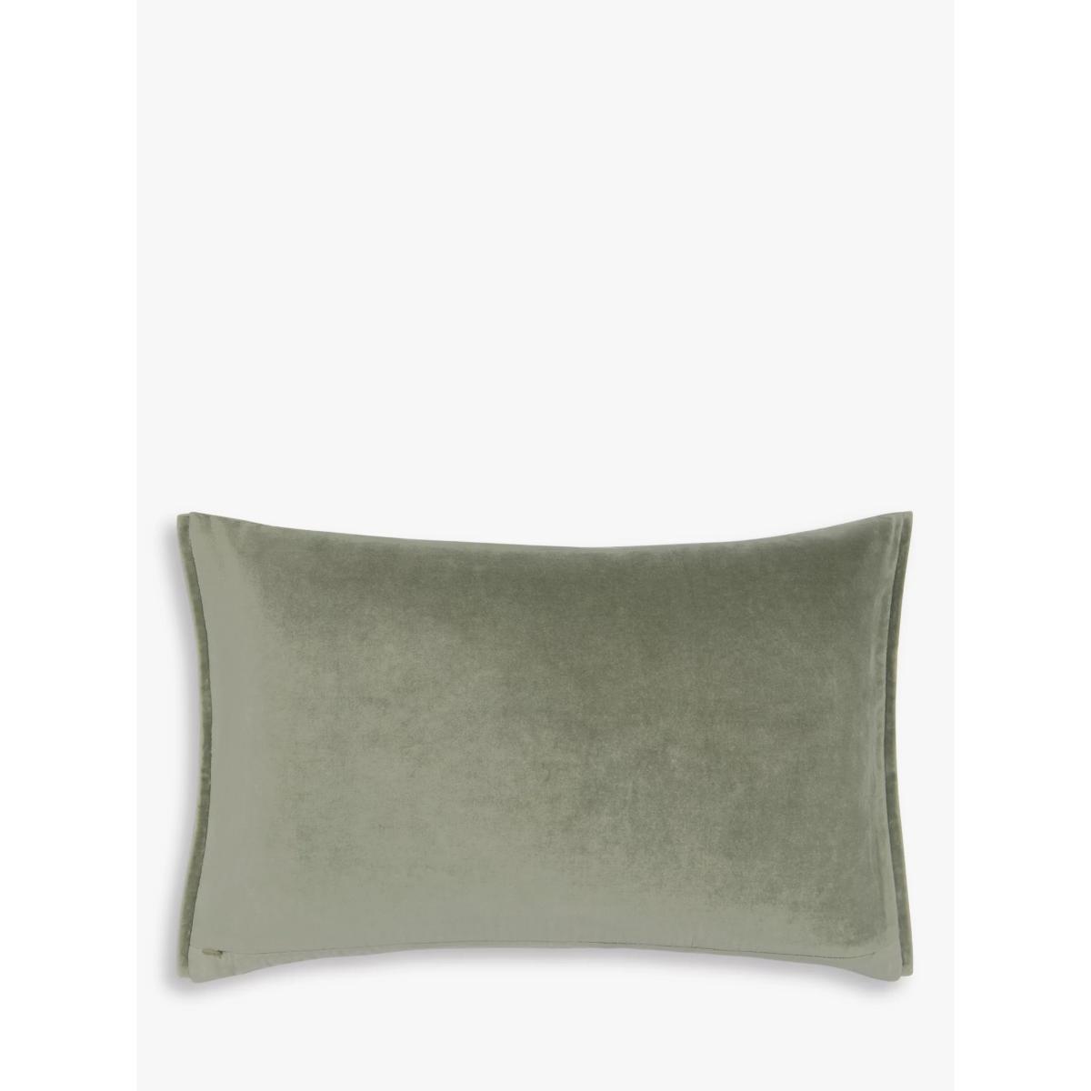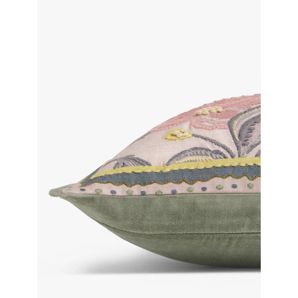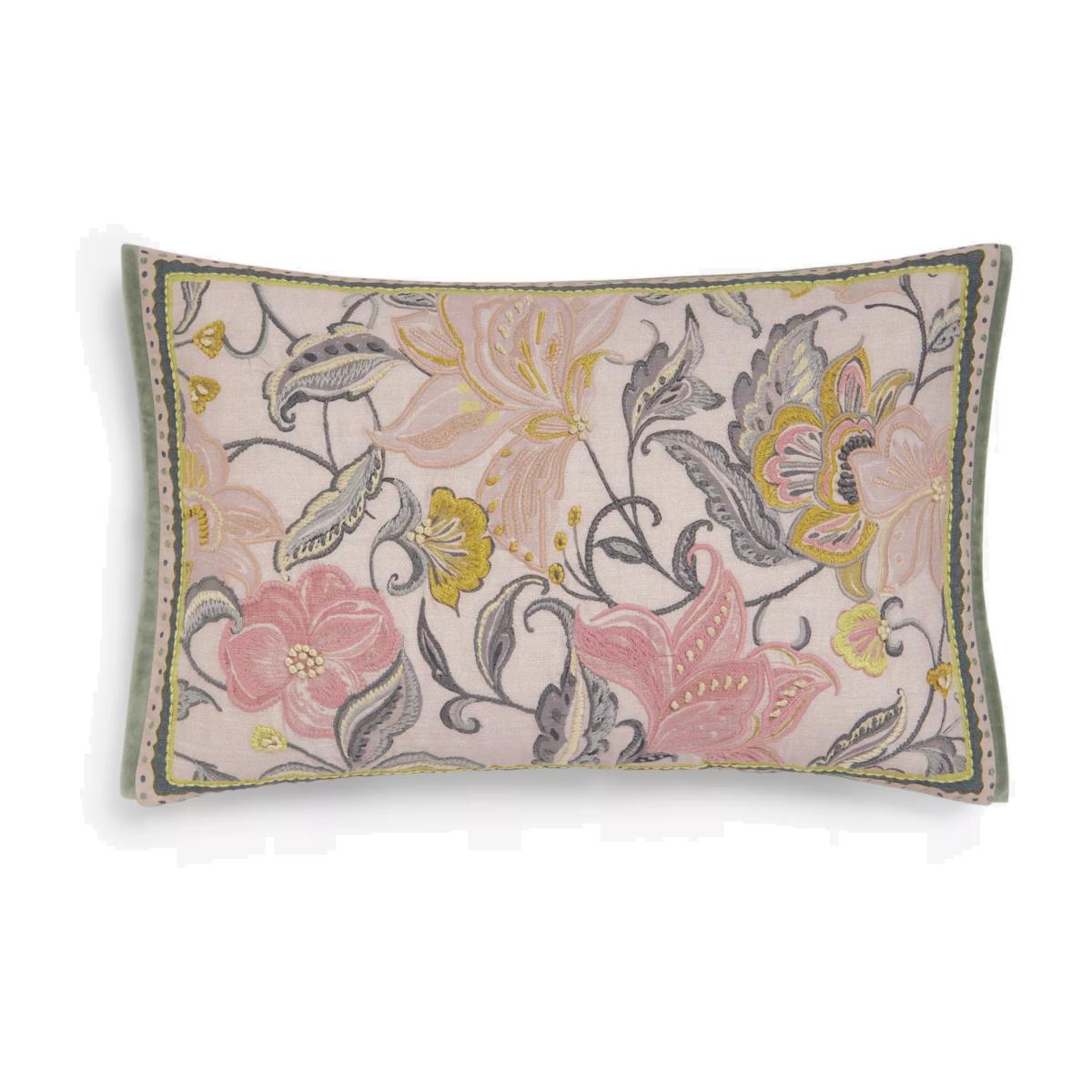 "Lydia" is a velvet bolster cushion, richly hand-embroidered with delicate floral detailing.