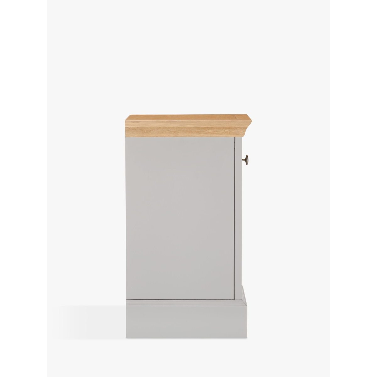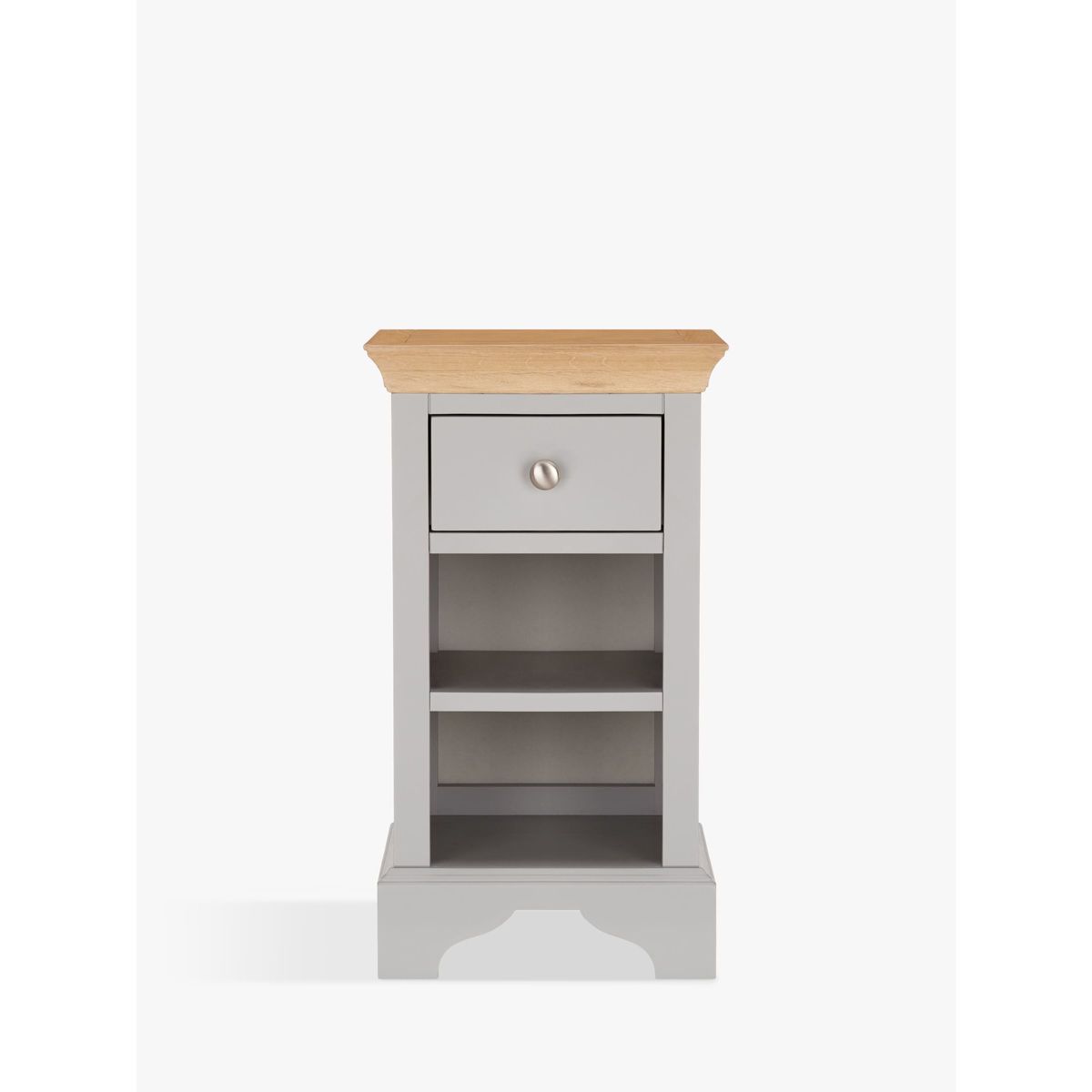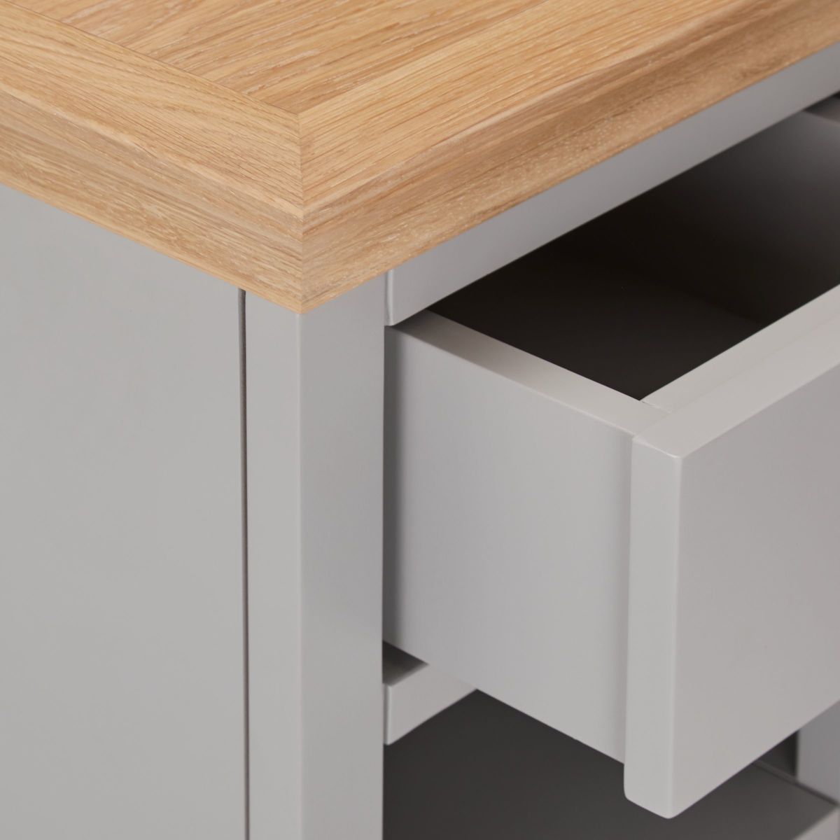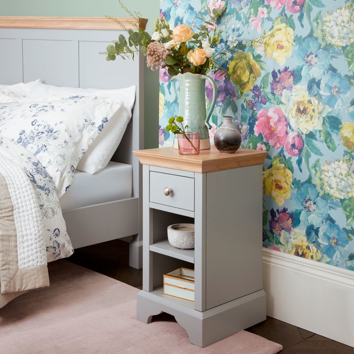 Our Lymington bedroom furniture range is characterised by its classic and clean aesthetic, that brings together tactile solid oak surfaces with sleek oak veneer finishes. Understated pieces that carry a naturally elegant charm, the range is made up of solid bedsteads with coordinating storage pieces, each appealing to relaxed and traditional interior decors. Complete the look with natural bed linen and soft accessories for an instantly warm look and feel. This petite and naturally charming bedside table is designed with one compact drawer, finished with a matte metal knob handle, and two shelves. Available in three versatile painted finishes, its smooth and solid oak veneer top provides a sleek surface for your bedside essentials and will perfectly complement your bedroom and our coordinating pieces of furniture. Maximum load: 3kg