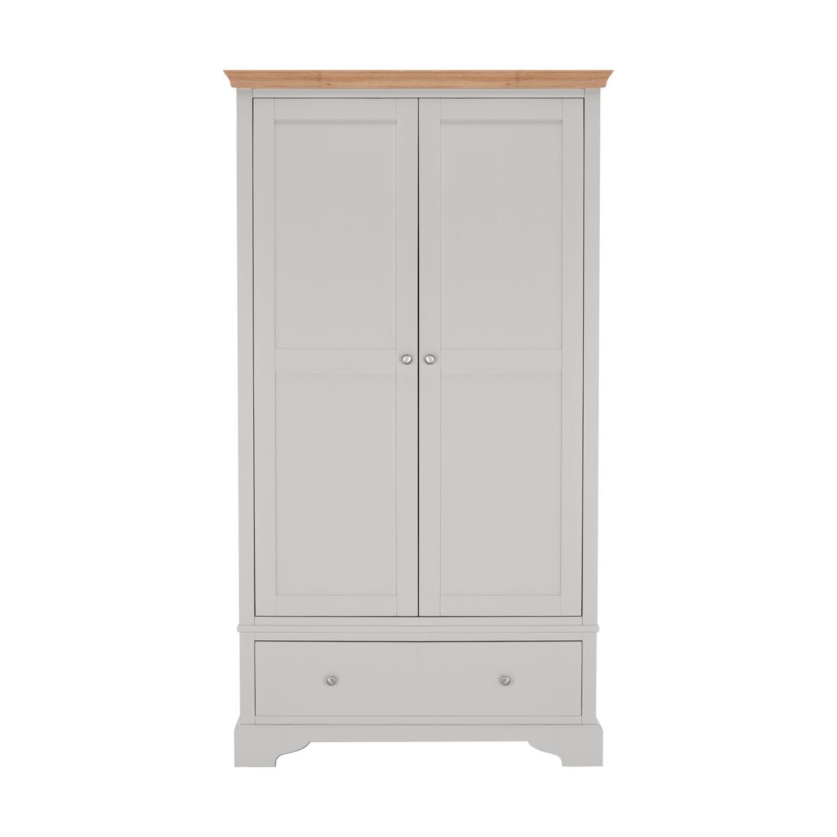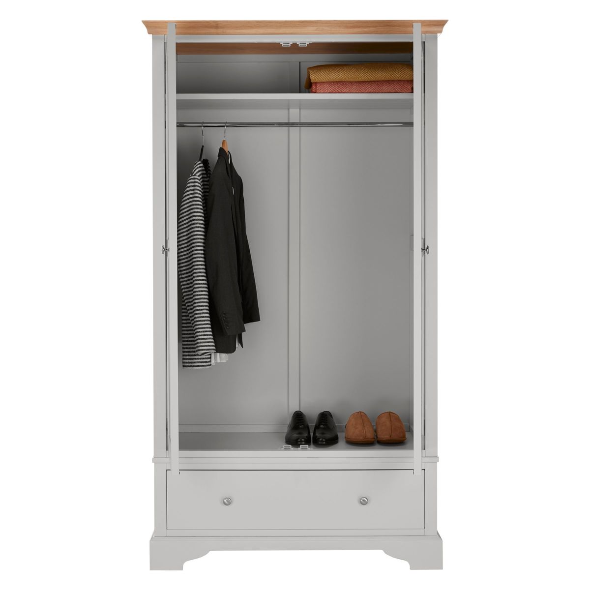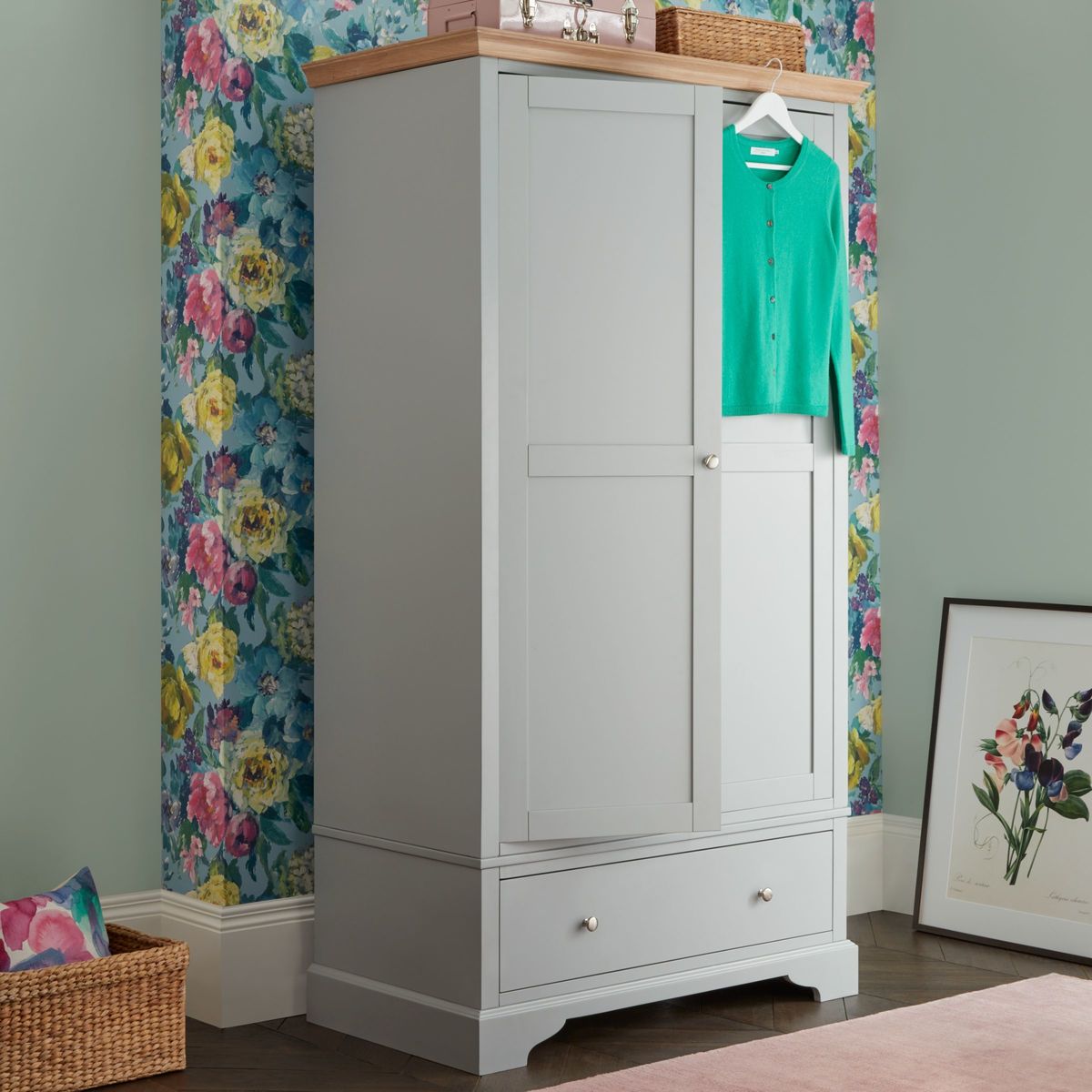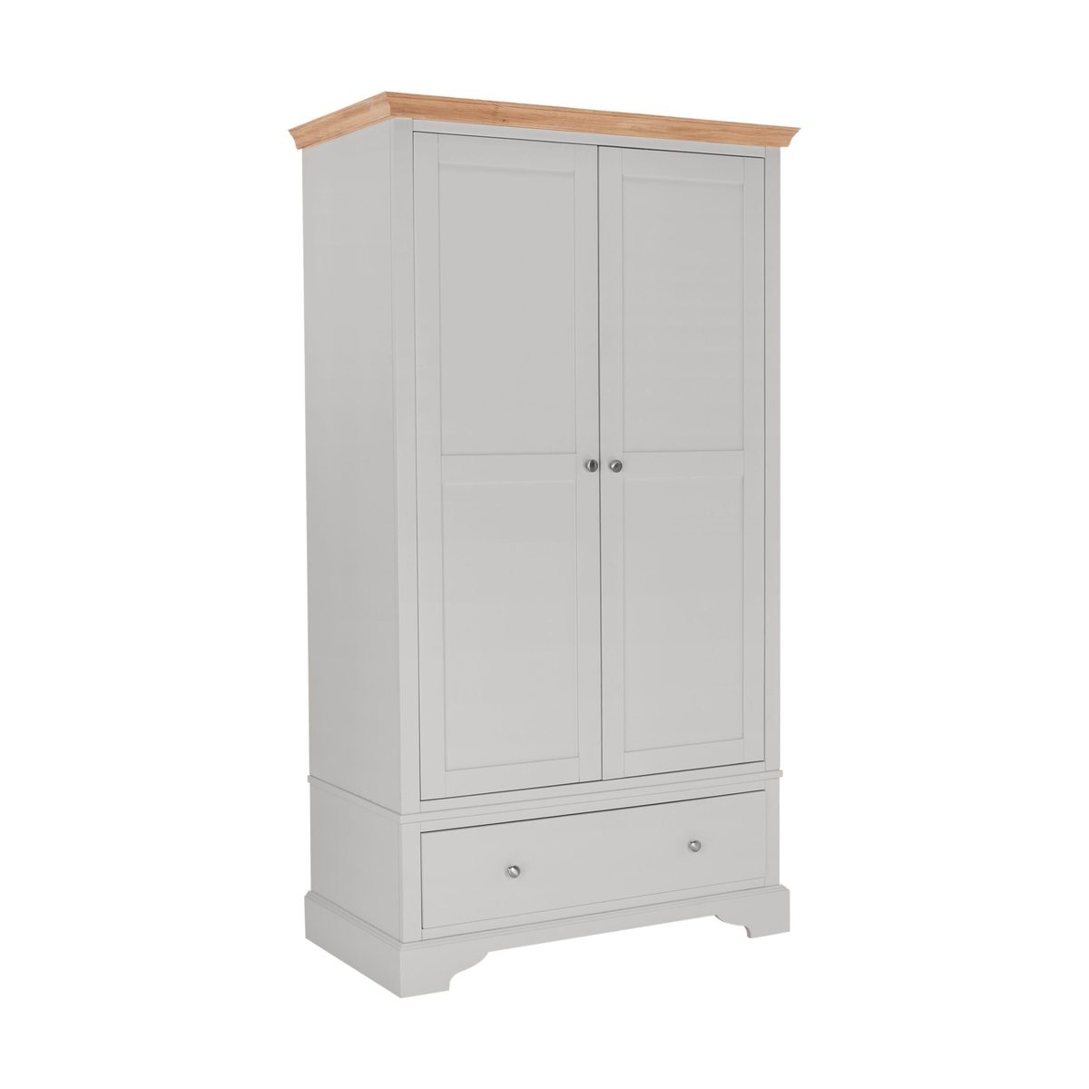 Our Lymington bedroom furniture range is characterised by its classic and clean aesthetic, that brings together tactile solid oak surfaces with sleek oak veneer finishes. Understated pieces that carry a naturally elegant charm, the range is made up of solid bedsteads with coordinating storage pieces, each appealing to relaxed and traditional interior decors. Complete the look with natural bed linen and soft accessories for an instantly warm look and feel. Wonderfully functional while charming in design, this free-standing double wardrobe offers ample storage space. Opening with two hinged doors to reveal a spacious interior, complete with a metal hanging rail and top shelf, it also boasts a lower drawer that offers additional storage. Finished with classic knob handles and available in three versatile painted finishes, it will perfectly complement your bedroom and our coordinating pieces of furniture. Maximum shelf load: 22kg.