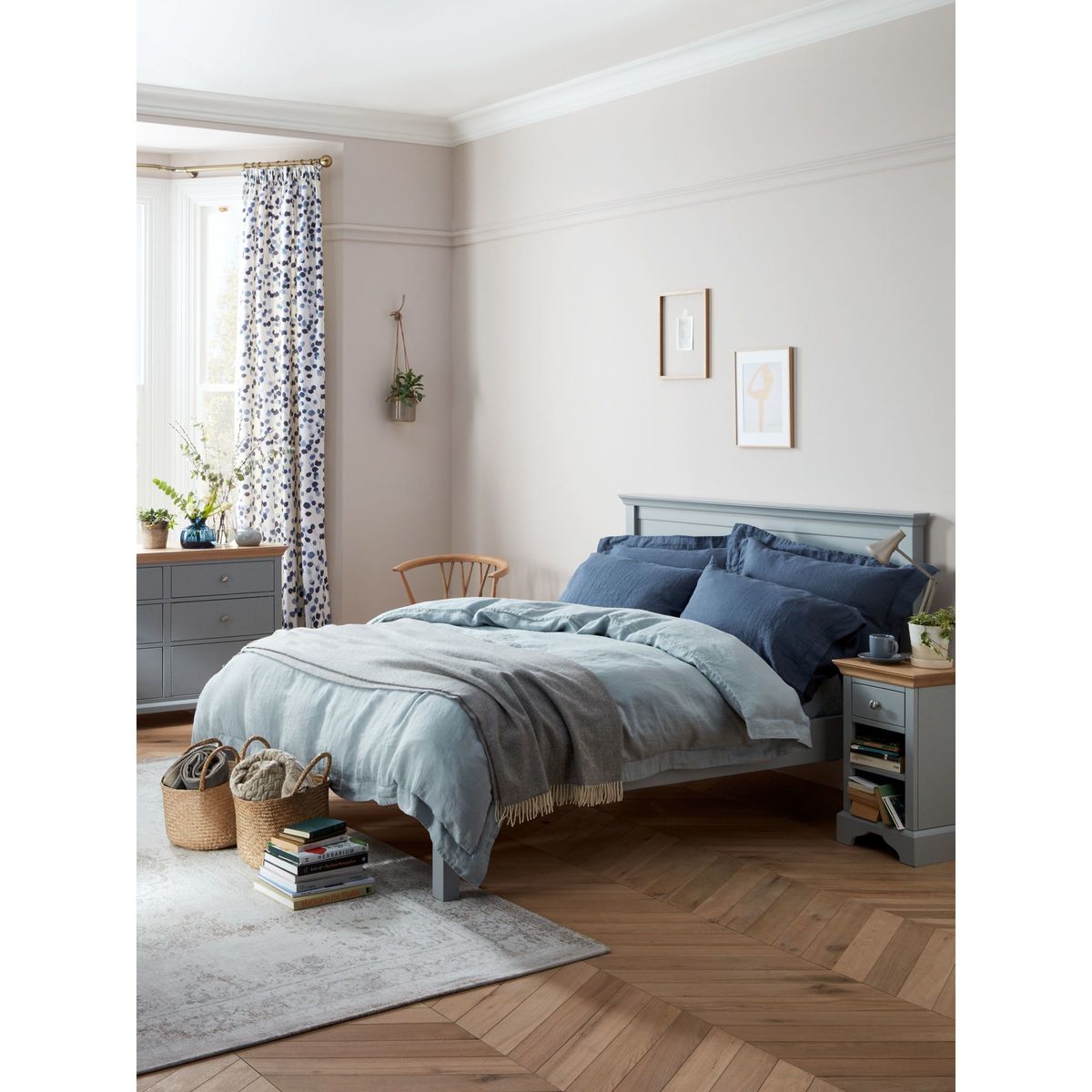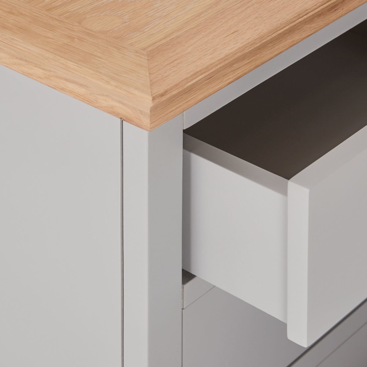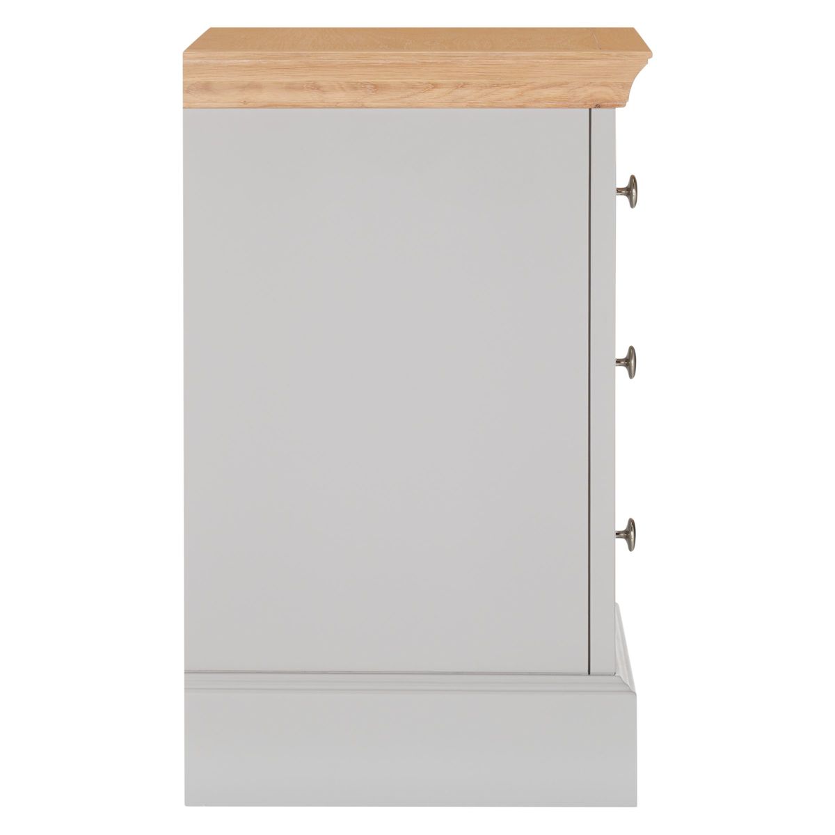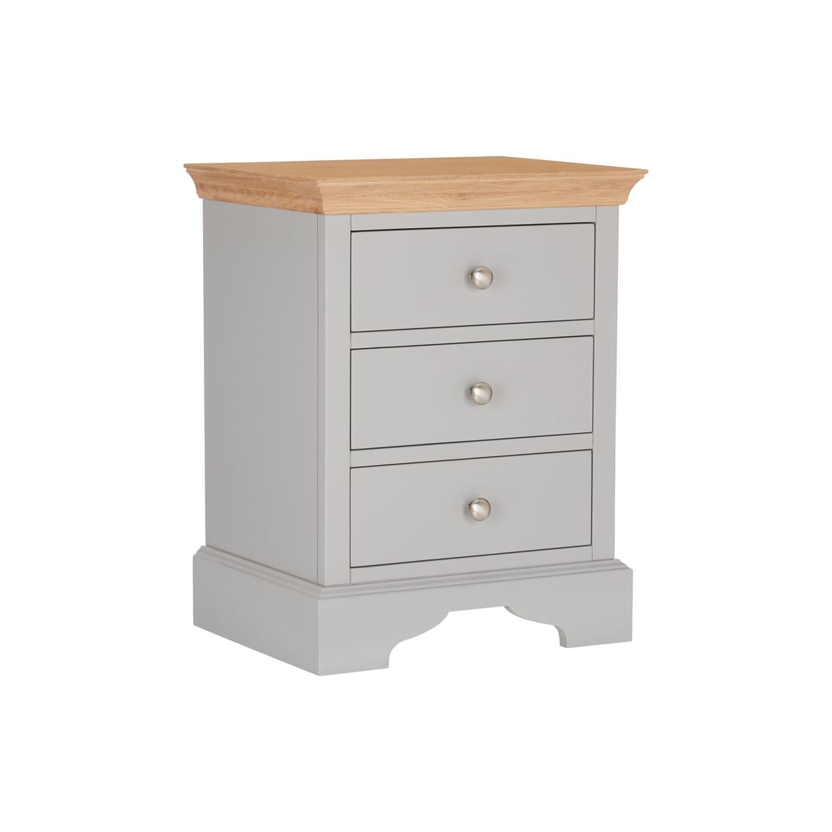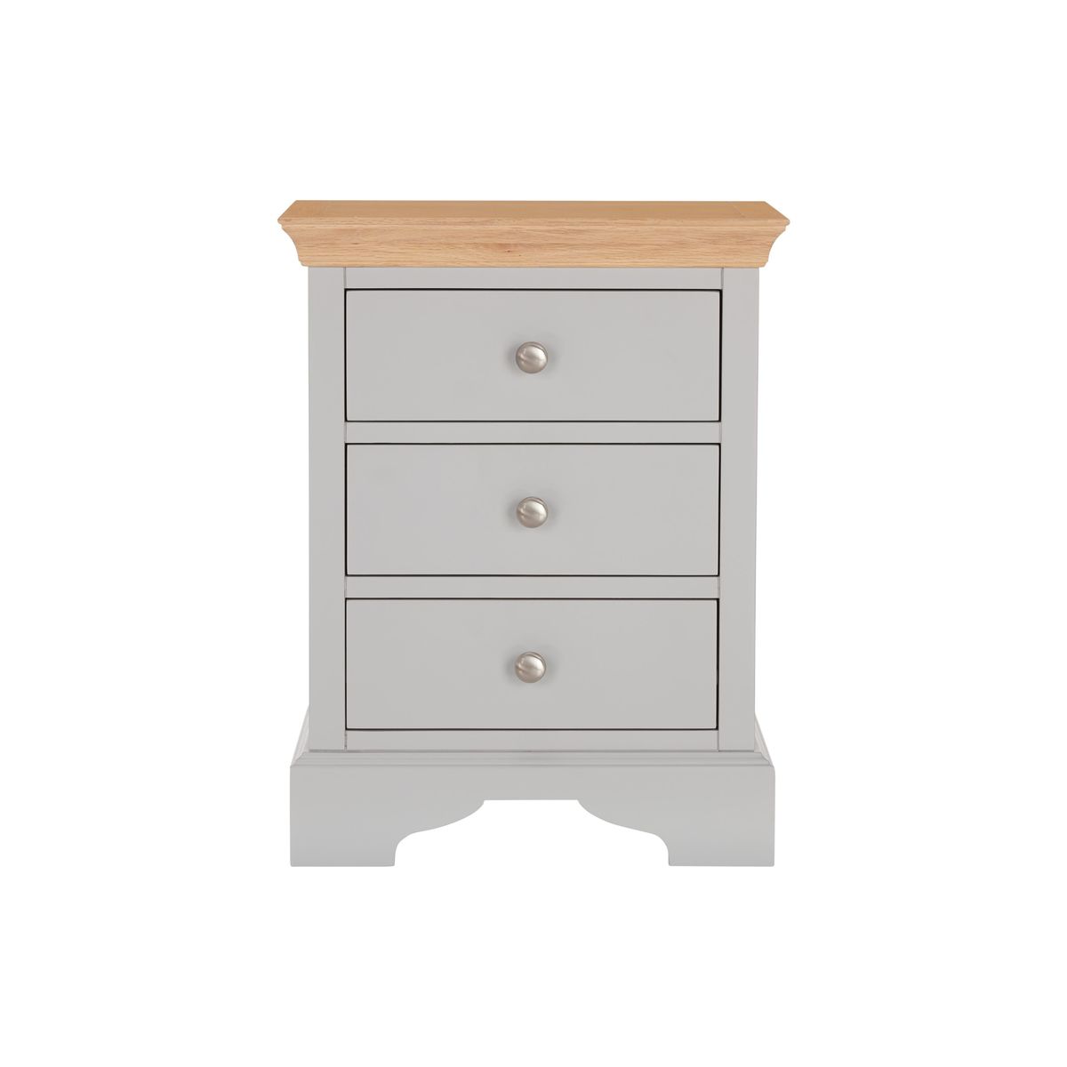 Our Lymington bedroom furniture range is characterised by its classic and clean aesthetic, that brings together tactile solid oak surfaces with sleek oak veneer finishes. Understated pieces that carry a naturally elegant charm, the range is made up of solid bedsteads with coordinating storage pieces, each appealing to relaxed and traditional interior decors. Complete the look with natural bed linen and soft accessories for an instantly warm look and feel. This naturally charming bedside table is designed with three useful drawers, each finished with metal knob handles. Available in three versatile painted finishes, its smooth oak top provides a sleek surface for your bedside essentials and will perfectly complement your bedroom and our coordinating pieces of furniture. Maximum load per drawer: 6kg