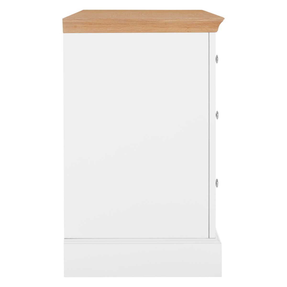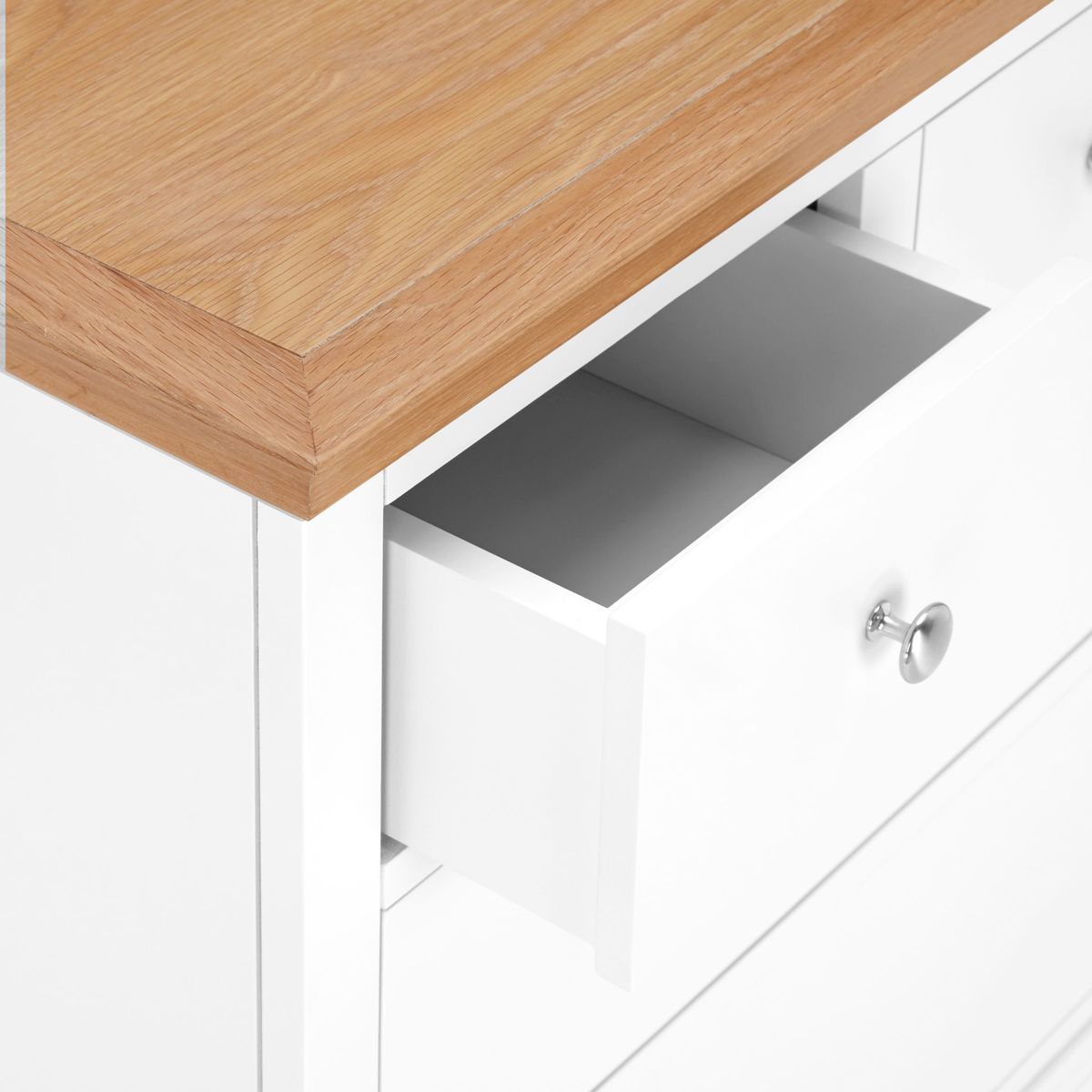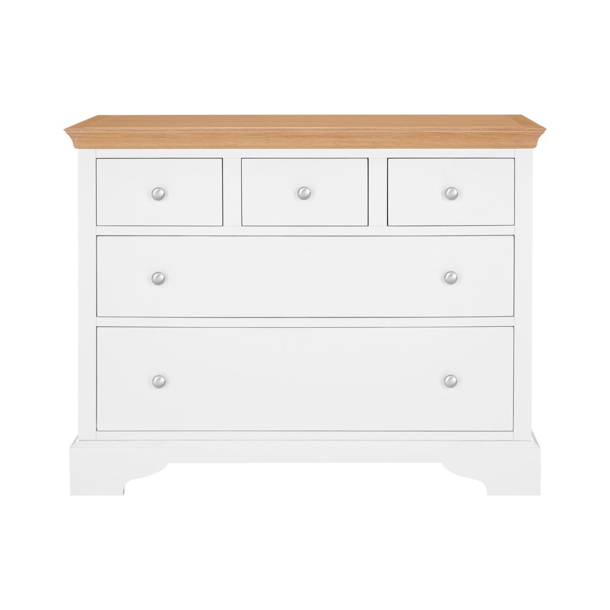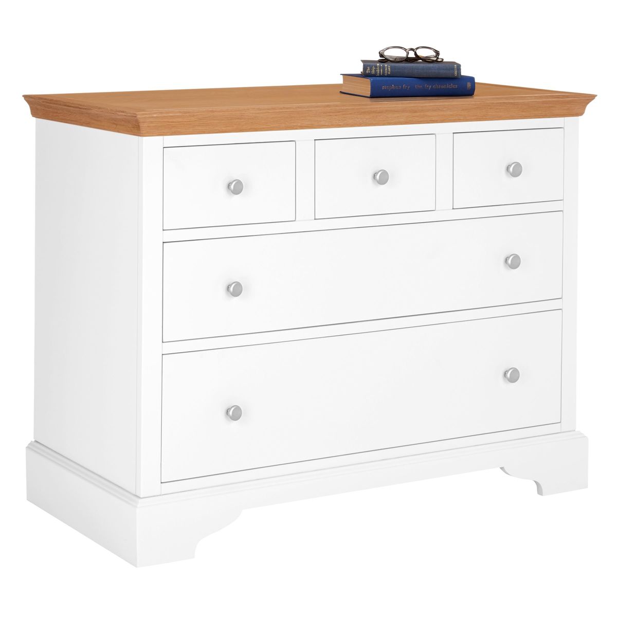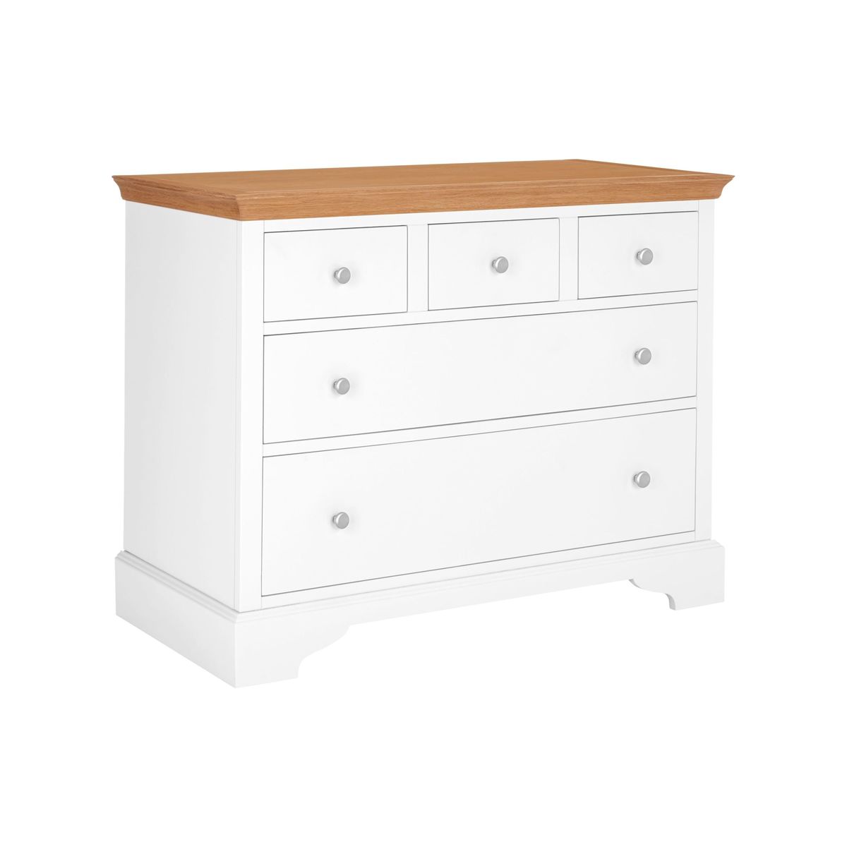Our Lymington bedroom furniture range is characterised by its classic and clean aesthetic, that brings together tactile solid oak surfaces with sleek oak veneer finishes. Understated pieces that carry a naturally elegant charm, the range is made up of solid bedsteads with coordinating storage pieces, each appealing to relaxed and traditional interior decors. Complete the look with natural bed linen and soft accessories for an instantly warm look and feel. This functional and naturally charming drawer chest is designed to maximise storage space. With two larger drawers sitting beneath three small drawers, its considered aesthetic, available in three versatile painted finishes, will perfectly complement your bedroom and our coordinating pieces of furniture. Maximum load. Small drawer: 5kg. Large drawer: 19kg