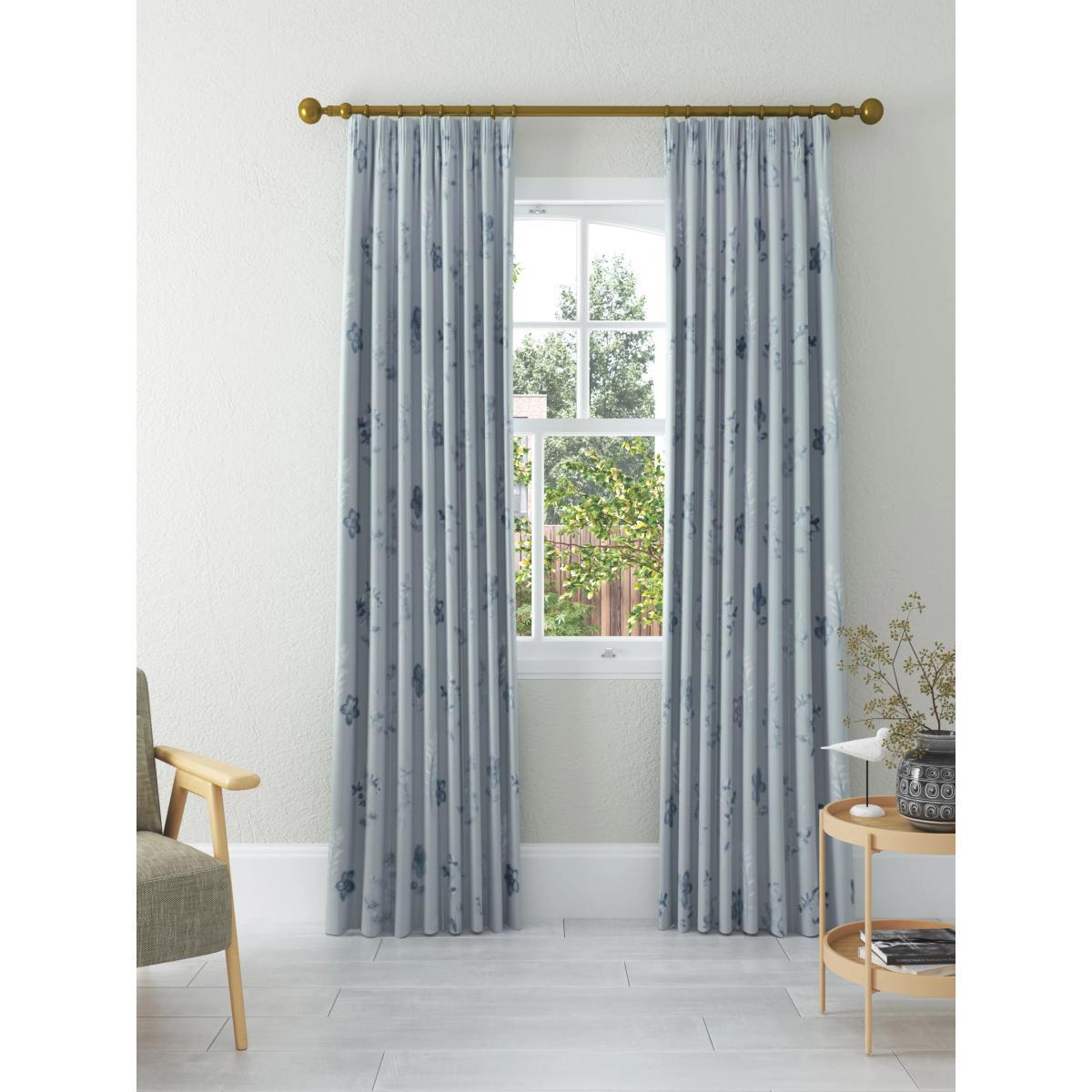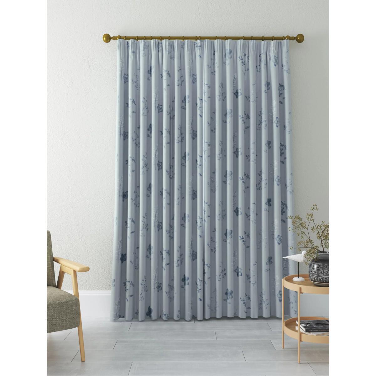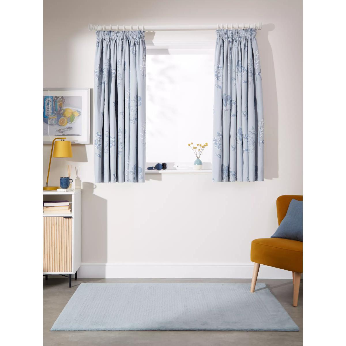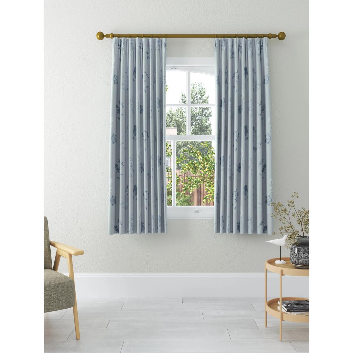 Our Mabel curtains feature sketched flowers and foliage on an ice blue background. The pencil pleat heading creates small, neat folds at the top and the blackout lining both eliminates light and lends a full look to the curtains, improving the drape and enhancing the vibrancy of the pattern. By buying cotton products from John Lewis & Partners, you're supporting more sustainable cotton farming through the Better Cotton Initiative. BCI is a not-for-profit organisation which exists to make global cotton production better for the people who produce it, better for the environment it grows in, and better for the sector's future. BCI works with partners around the world such as WWF, Solidaridad and Cotton Connect to train farmers to produce cotton more sustainably. Better Cotton is sourced via a principle of mass balance and is not physically traceable to end products. However, BCI Farmers benefit from the demand for Better Cotton in equivalent volumes to those we source. Learn more about mass balance here. Warm in winter, cool in summer As the blackout lining on these curtains blocks out sunlight they help keep your room cool as well as dark. This lining also adds an extra layer of insulation to the curtains, giving them the added benefit of being thermal. They protect against both heat loss and heat gain, regulating the temperature of your room so you're kept warm in winter and cool in summer. Choosing the right size These curtains can be hung with a pole or track using curtain hooks (not included). There are three hook positions on the heading, allowing you to choose how your curtains sit against the track or pole. For example, if you're using a track you may want to use the middle or lower row of hooks to cover the track, whereas if you're using a pole you may want to use the top row of hooks so the curtains hang below the rings. The specified drop is taken from the top row of hook pockets to the bottom edge of the curtain. The width stated indicates the size of one curtain panel when laid completely flat. This pack contains two panels, and the track/pole length we've recommended allows for the two panels to be gathered when the curtains are drawn. For a fuller look, increase the curtain width. One pair of 117cm width curtains will fit a curtain track/pole size 117-167cm One pair of 167cm width curtains will fit a curtain track/pole size 133-167cm One pair of 228cm width curtains will fit a curtain track/pole size 182-228cm Worth knowing... We package our curtains in recycled materials to keep them protected whilst they make their way to you. This means that when they arrive there could be some creases in them. We recommend you hang them for a few days to allow them to flatten and for the creases to fall out. If after this period your curtains still show signs of being folded then follow the ironing instructions on the back of the packaging. Be aware that each style of curtain has different ironing instructions, including heat limitations according to the fabric, so do make sure you follow the guidance provided to get the best results. Do you need a curtain pole and accessories? Shop them here.