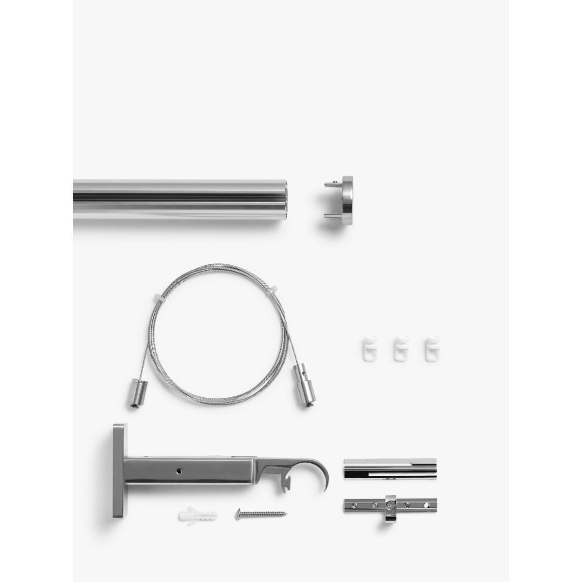 Revolution is our unique curtain pole/track system that can be customised to suit your home. It can be used as a curtain pole with rings or, by simply revolving the pole through 180°, as a decorative curtain track with gliders. The exact contents of your order will depend on the size and product you've selected. Poles are cut to your exact requirements and prices are per half metre of pole, so if you need a pole that's 210cm in length you'll need to order the 250cm size. If you require bends please look for the 4.8m size with 2 bends. When you're ready simply place your order and a representative from our supplier will contact you by phone. This will on the same day if your order is placed before 5pm, or the following day if the order is placed after 5pm. Your curtain pole will be completed and delivered to you within 7 days of ordering. Alternatively, you can contact our supplier (Bradley) straight away by emailing johnlewis@bradleycollection.com Further information on this pole configuration: This configuration is sold as a double curtain track with with gliders & tension wire Must be fixed to a wall usually just above your window or on the panel at the back of the recess Hand drawn tracks contain no cording, which means you open and close your curtains by hand. We do not recommend these for use with delicate fabrics