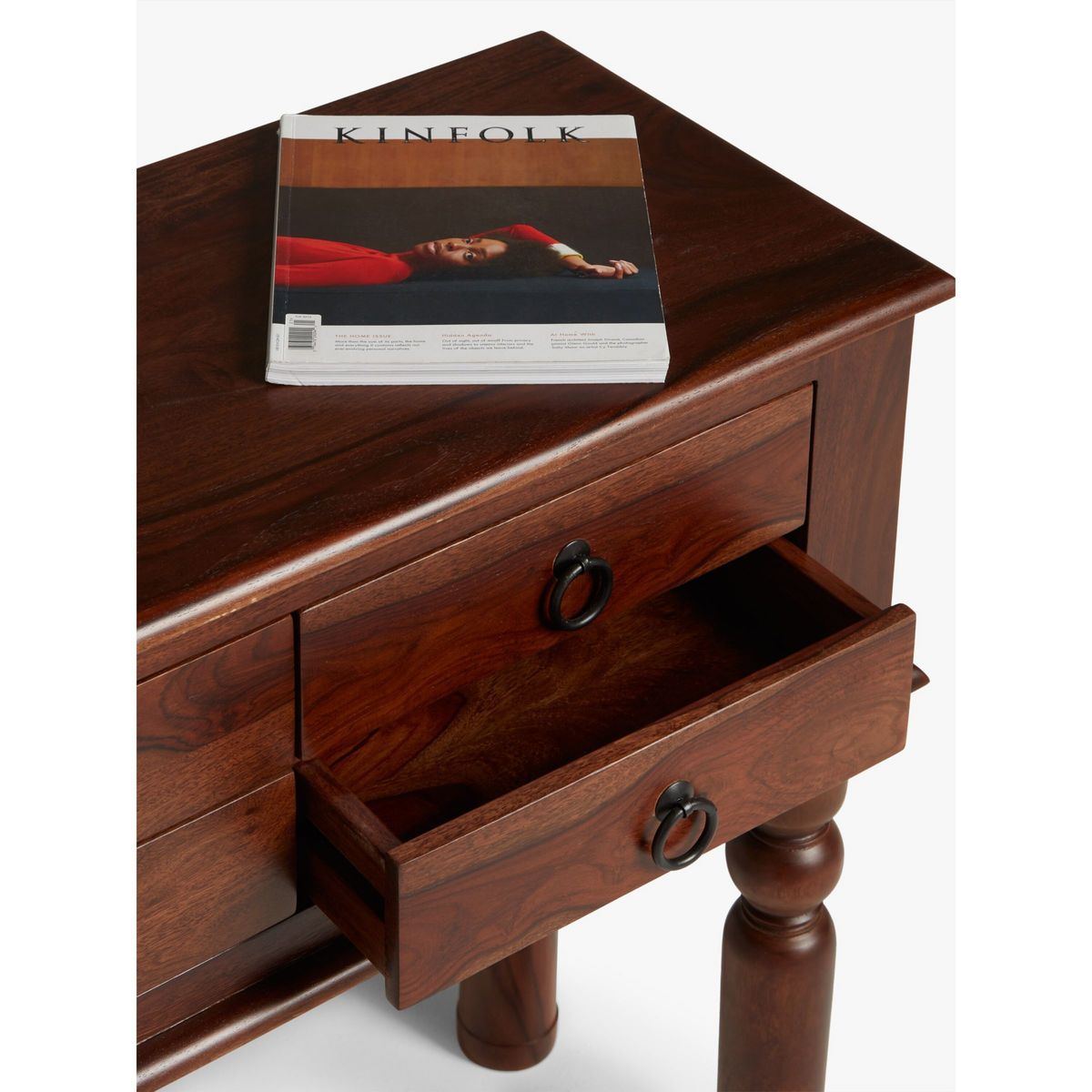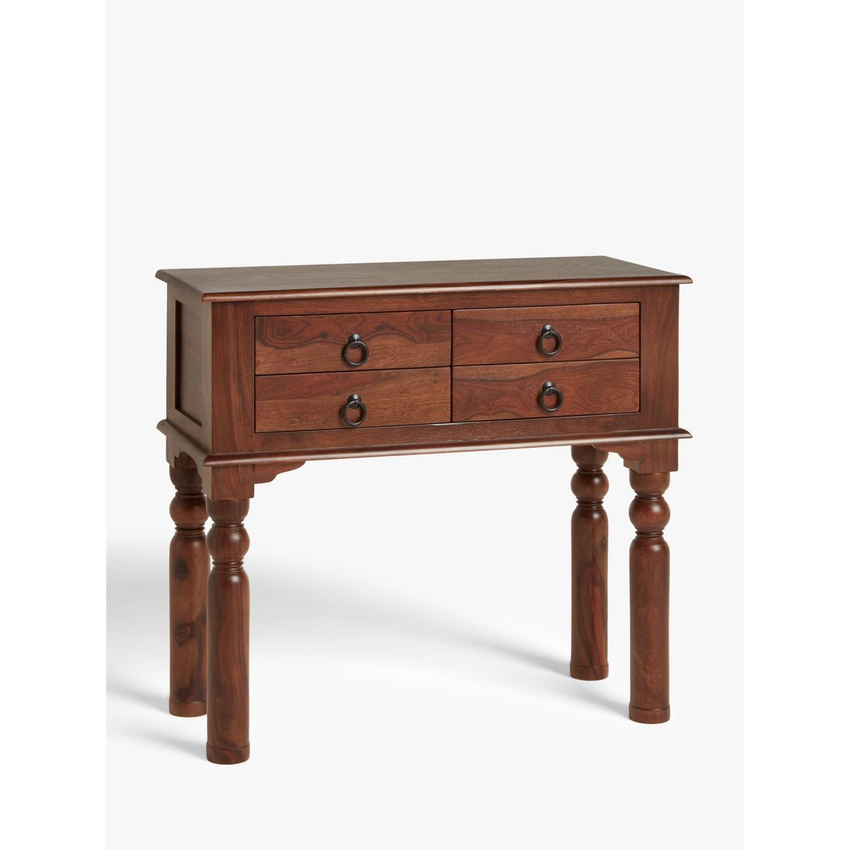 Our Maharani range takes inspiration from traditional Indian craft styles, such as Thakat, to bring authentic designs and functional furniture into your home. Made from high-quality, durable Sheesham wood in a brown stain, this practical console table provides convenient storage space thanks to four drawers. Its robust profile is supported by spindle-style legs and it's easy to place in smaller living room spaces as well as hallways. Want to see it first?. You may want to see and get a feel for the furniture in one of our shops before ordering. If you do plan on doing this we recommend giving us a call on 03452 661805 as not all our ranges are on display in our shops. We'll be able to tell you where the range you'd like to view is on display.